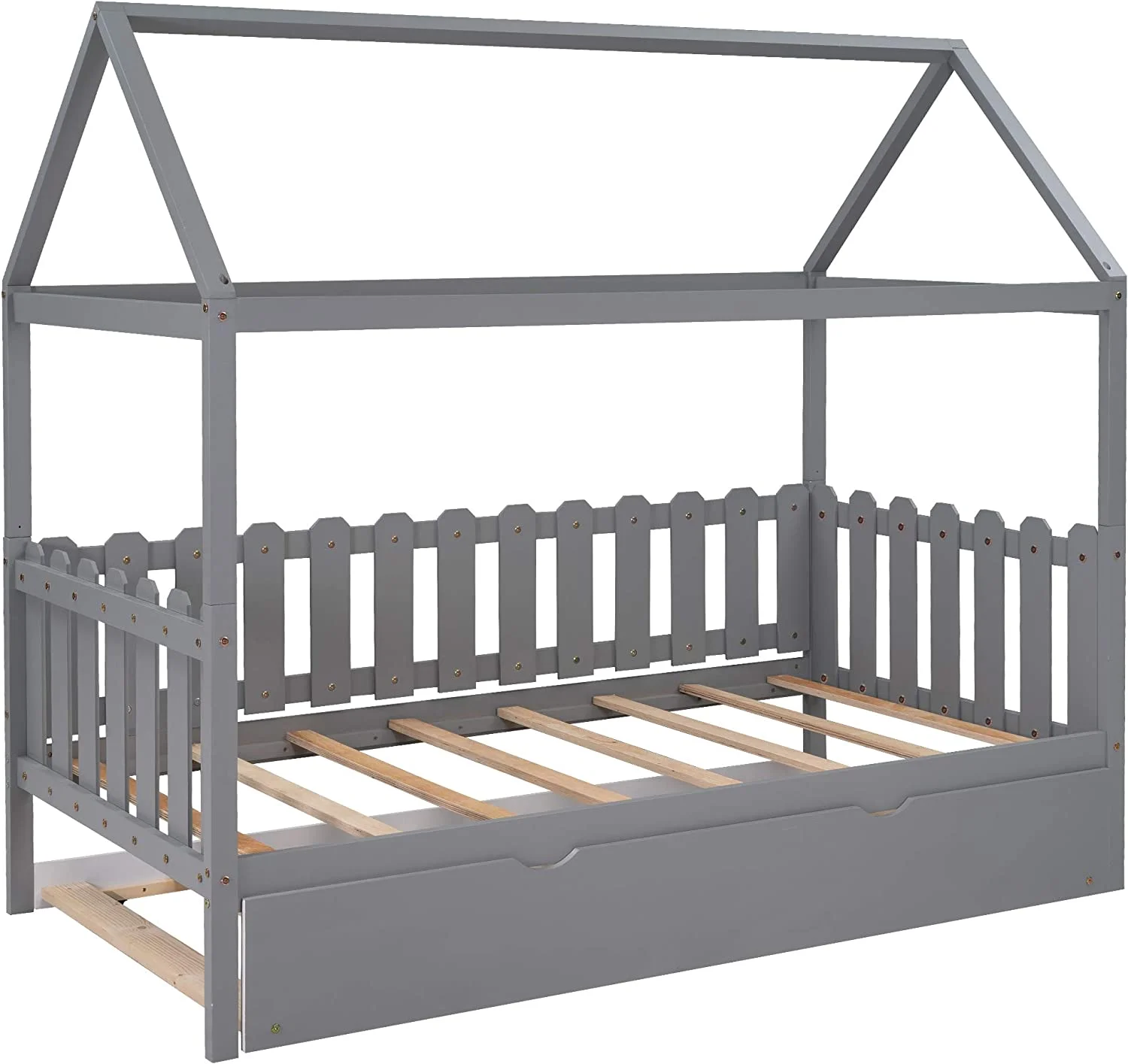House Bed With Trundle, Size Daybed Frame, Wood Size Bed Frame With Fence-Shaped Guardrail, No Box Spring Needed, Gray