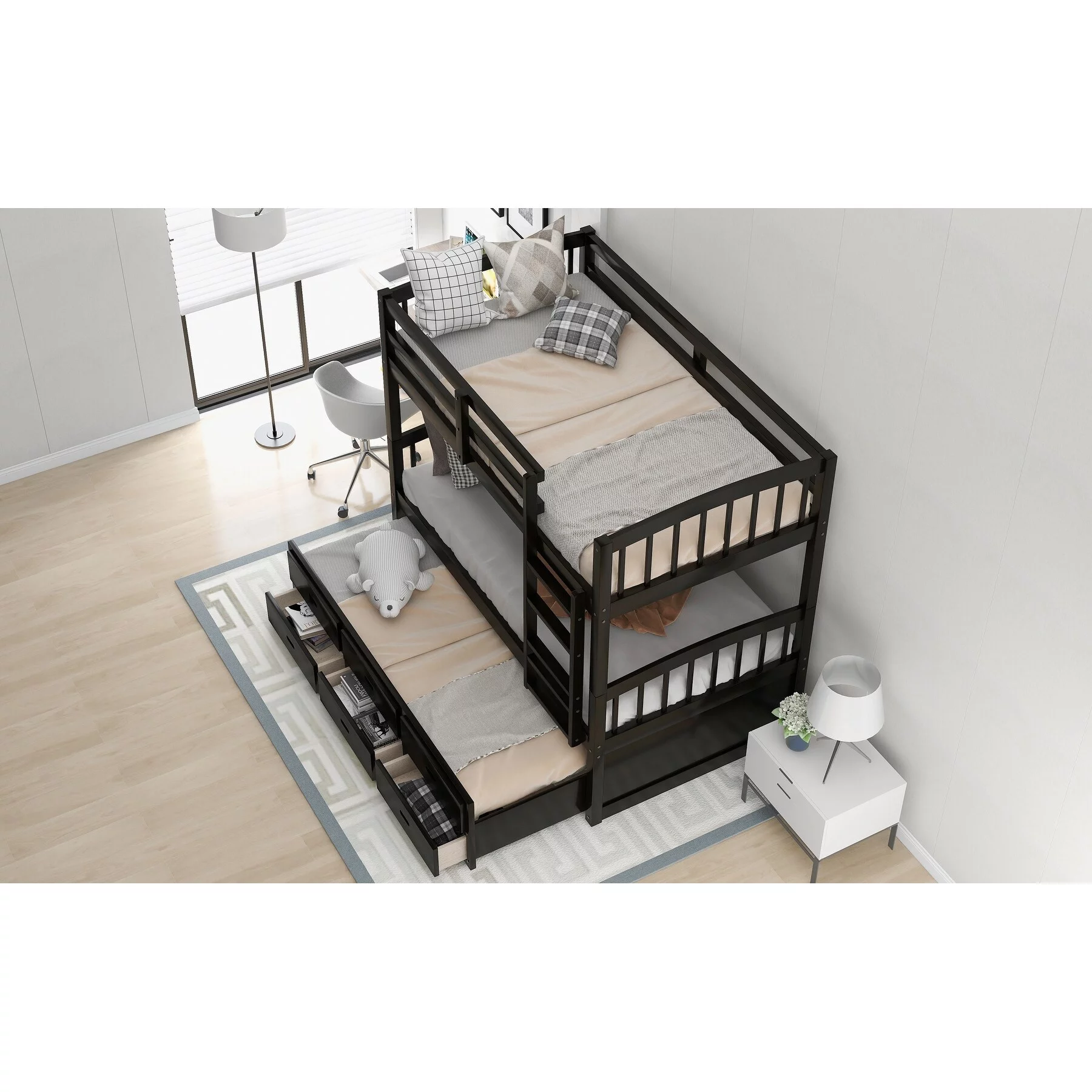 Espresso Unique Sturdy Four-Step Ladder And Full Length Guardrails Twin over Twin Solid Wood Bunk Bed with Trundle and Drawers