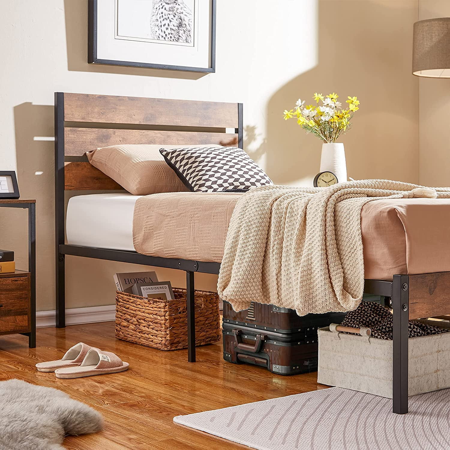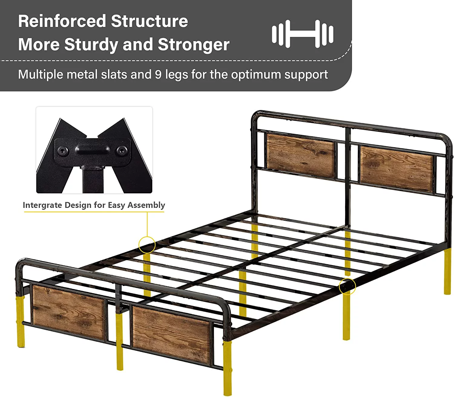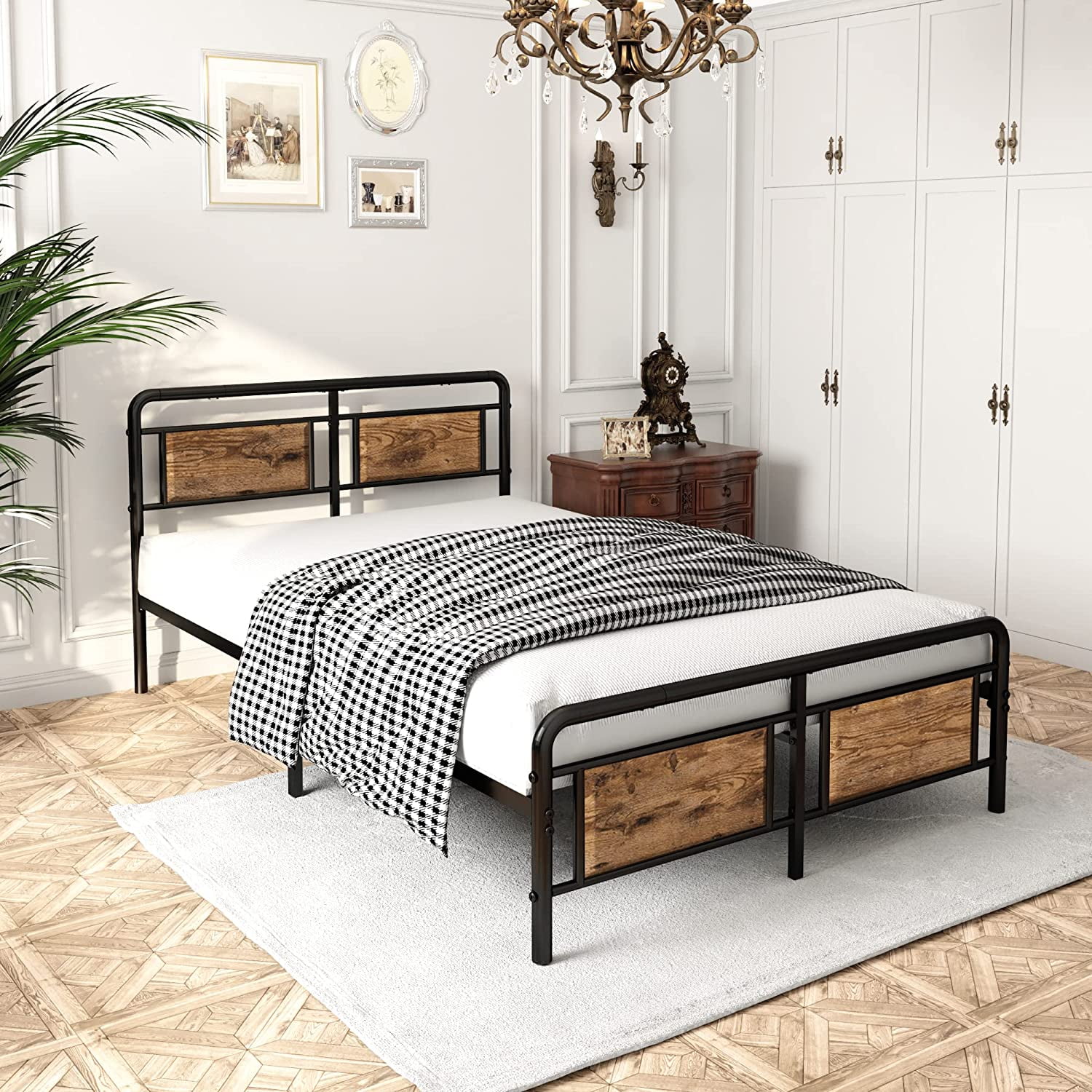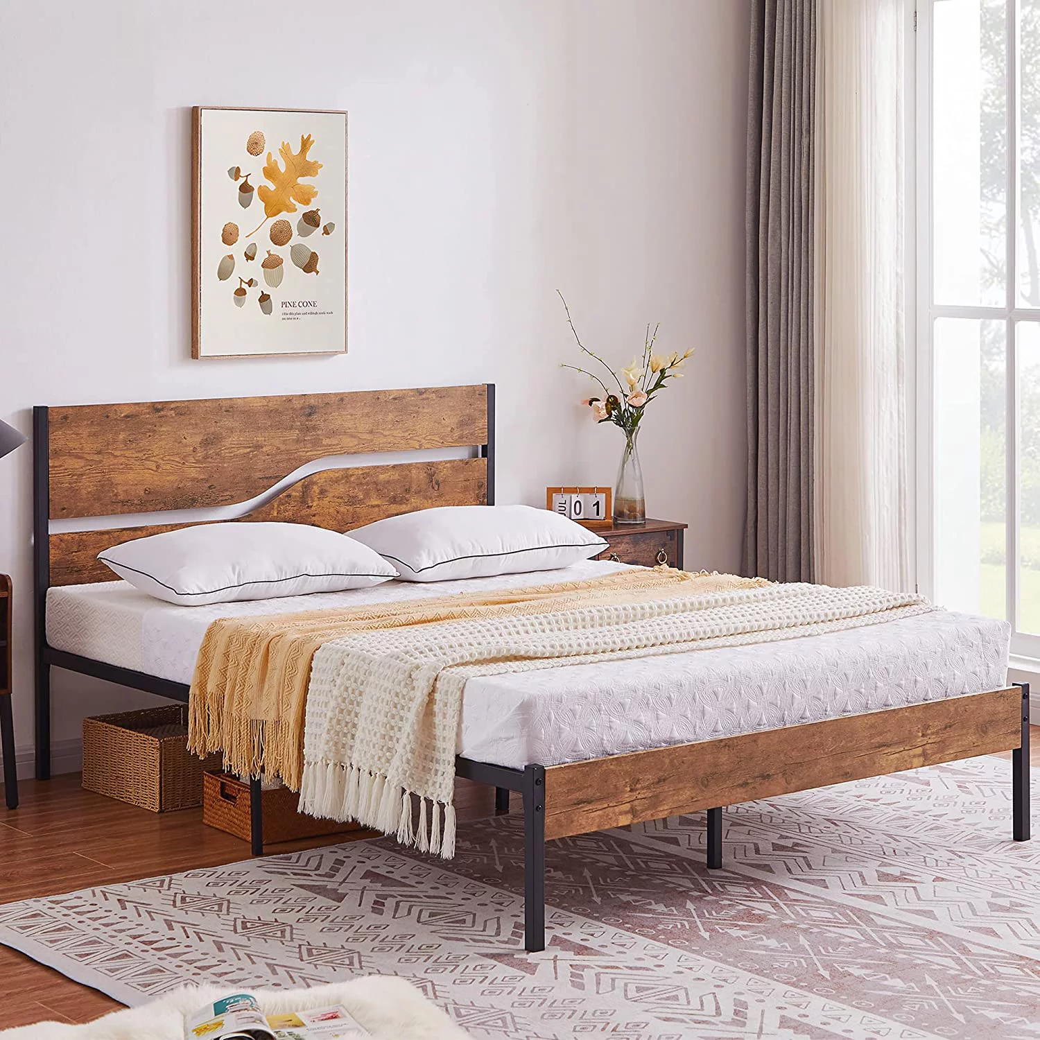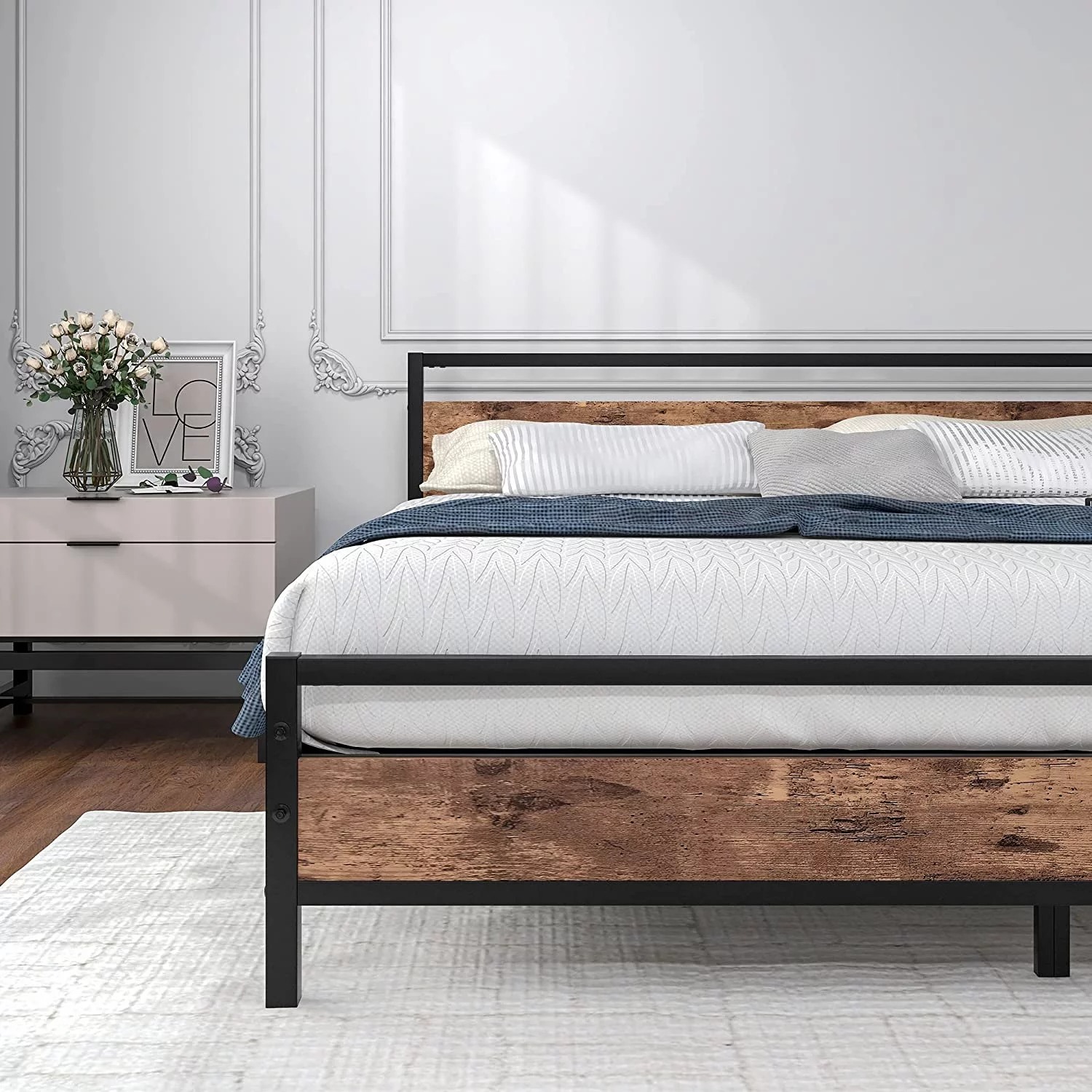 Full Size Platform Bed Frame with Rustic Vintage Wood Headboard, Strong Metal Slats Support, No Box Spring Needed