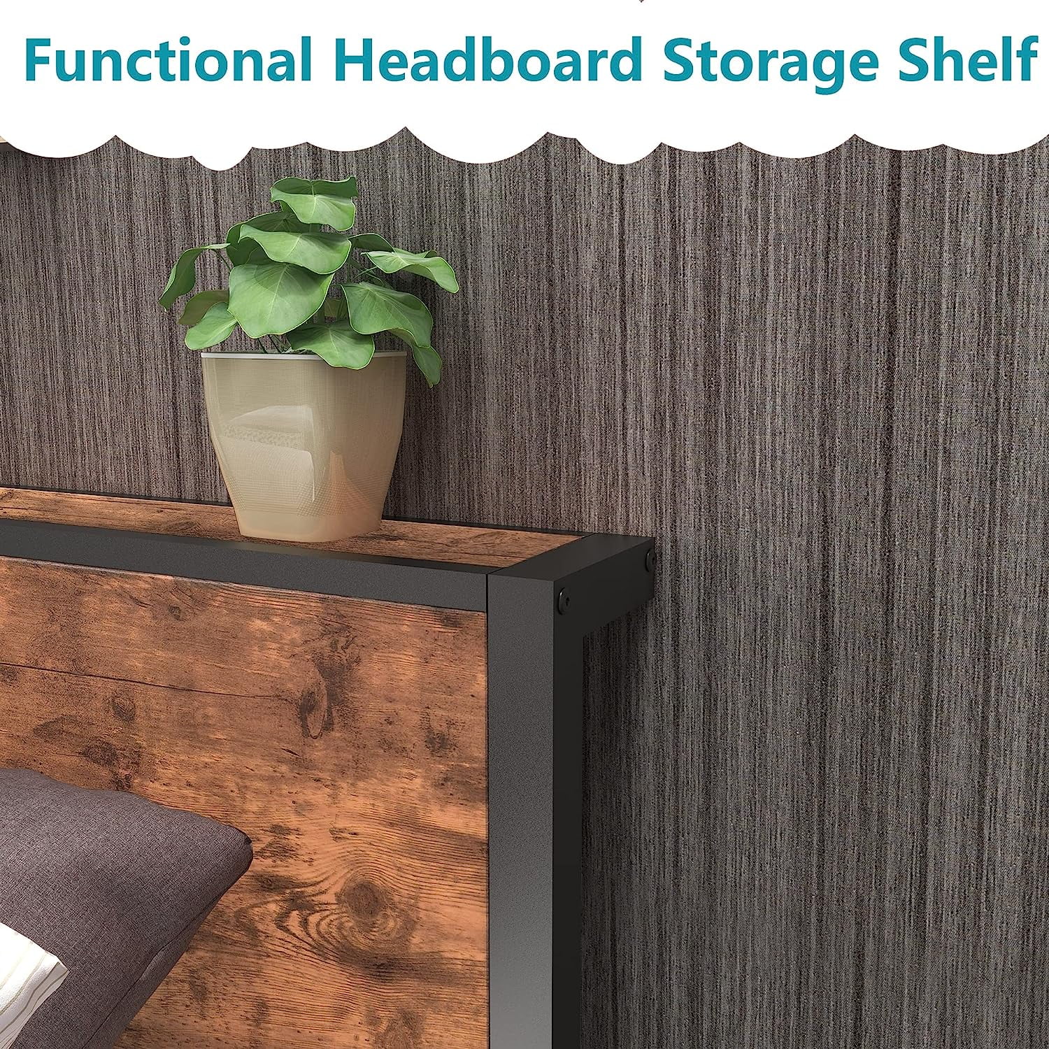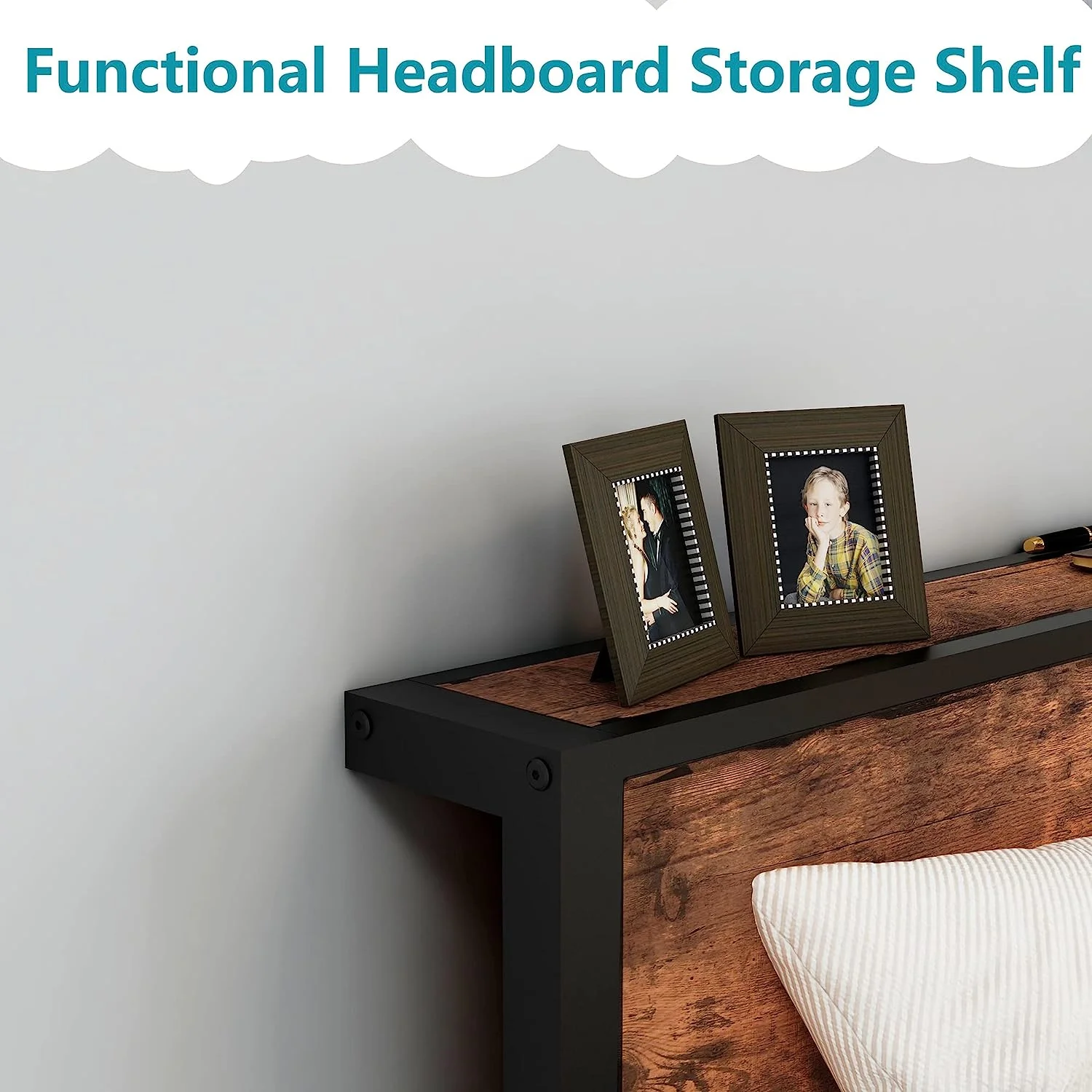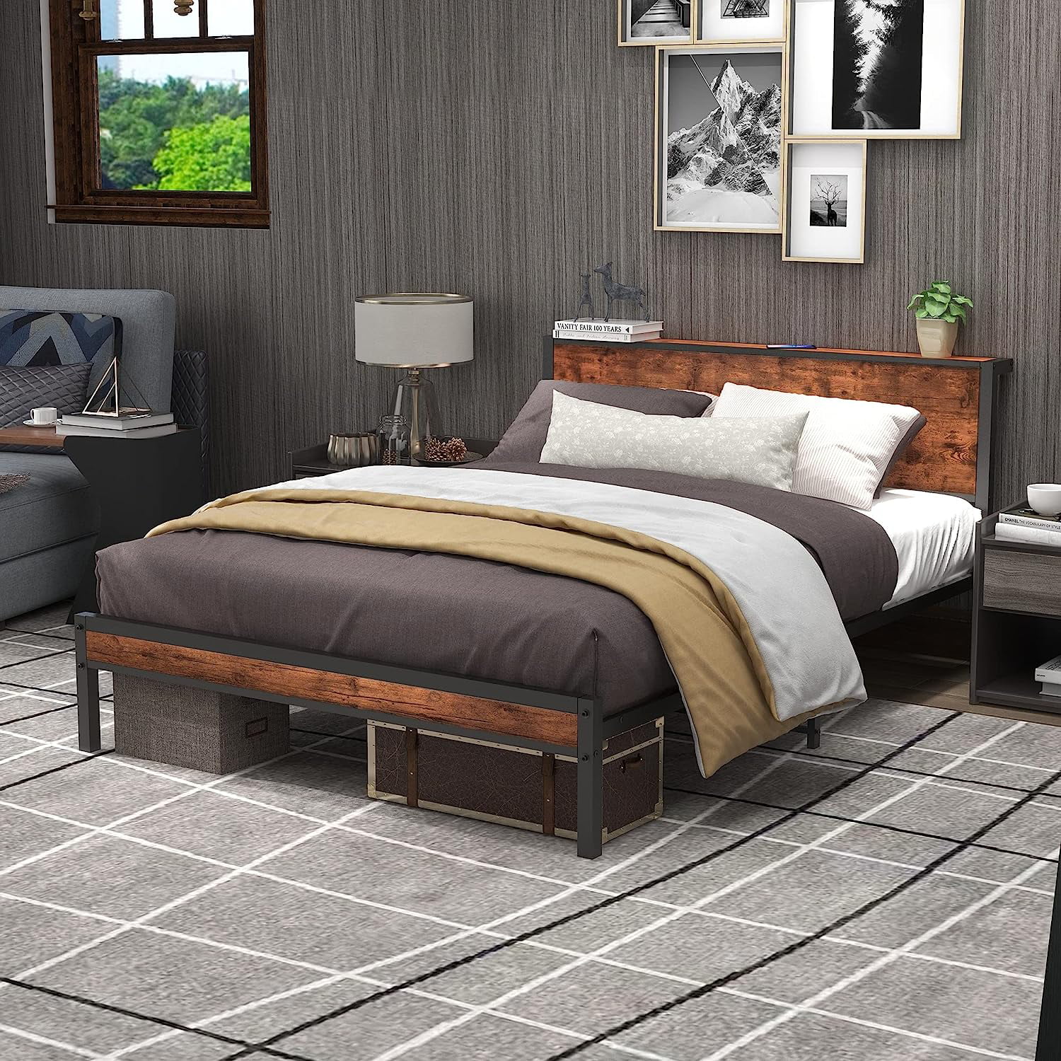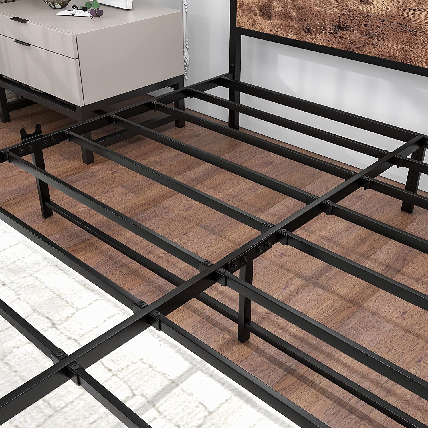 Full Size Platform Bed Frame with Rustic Vintage Wood Headboard, Strong Metal Slats Support, No Box Spring Needed