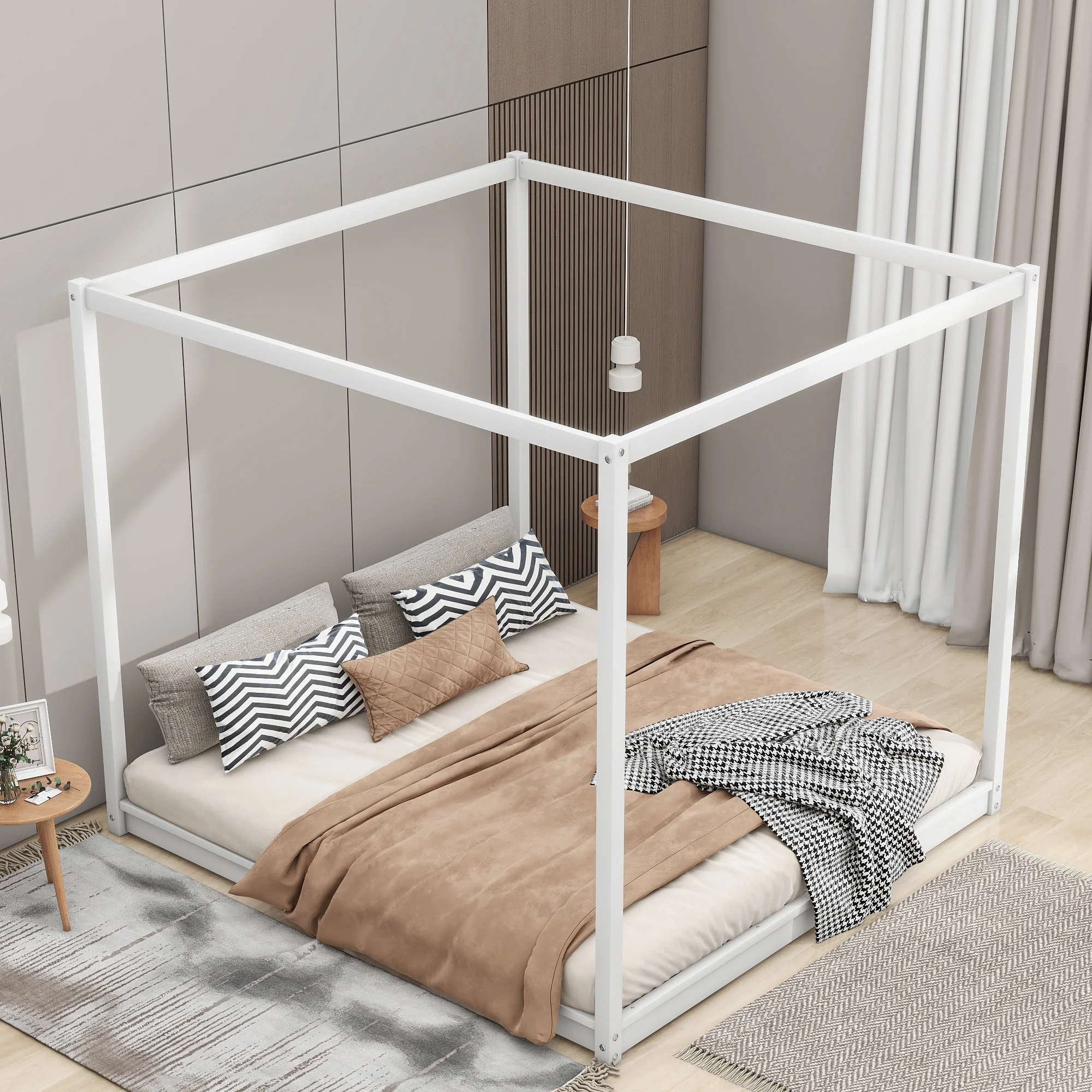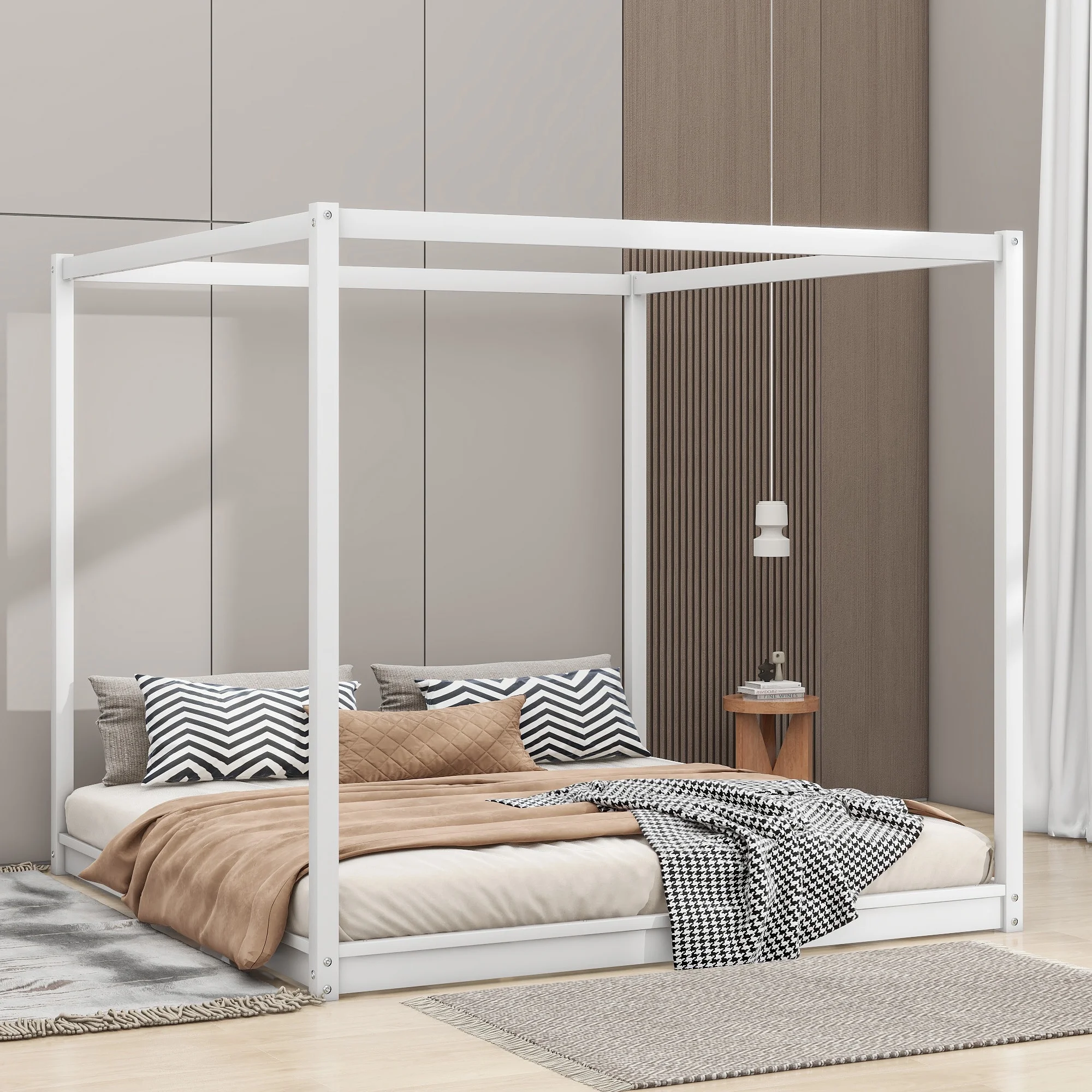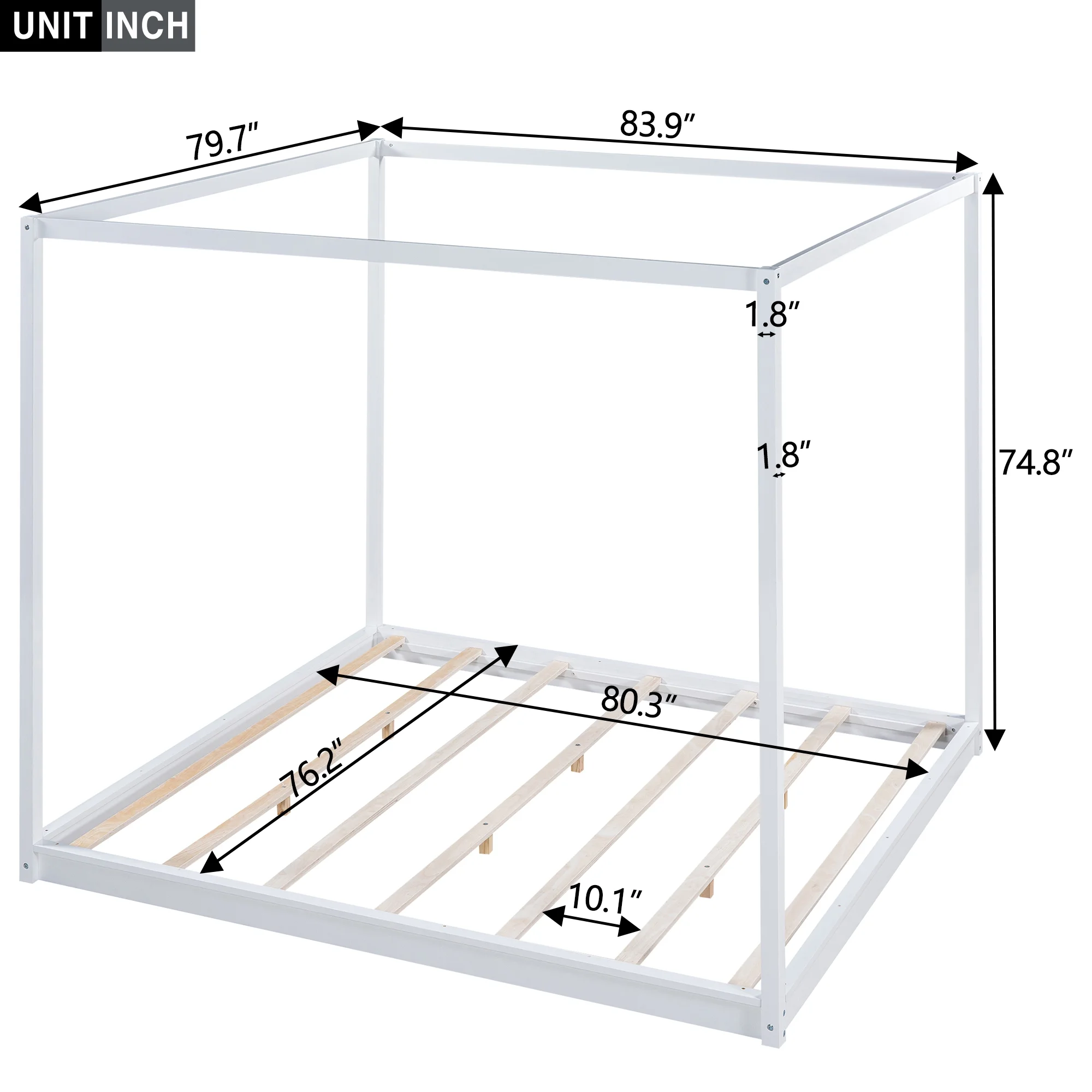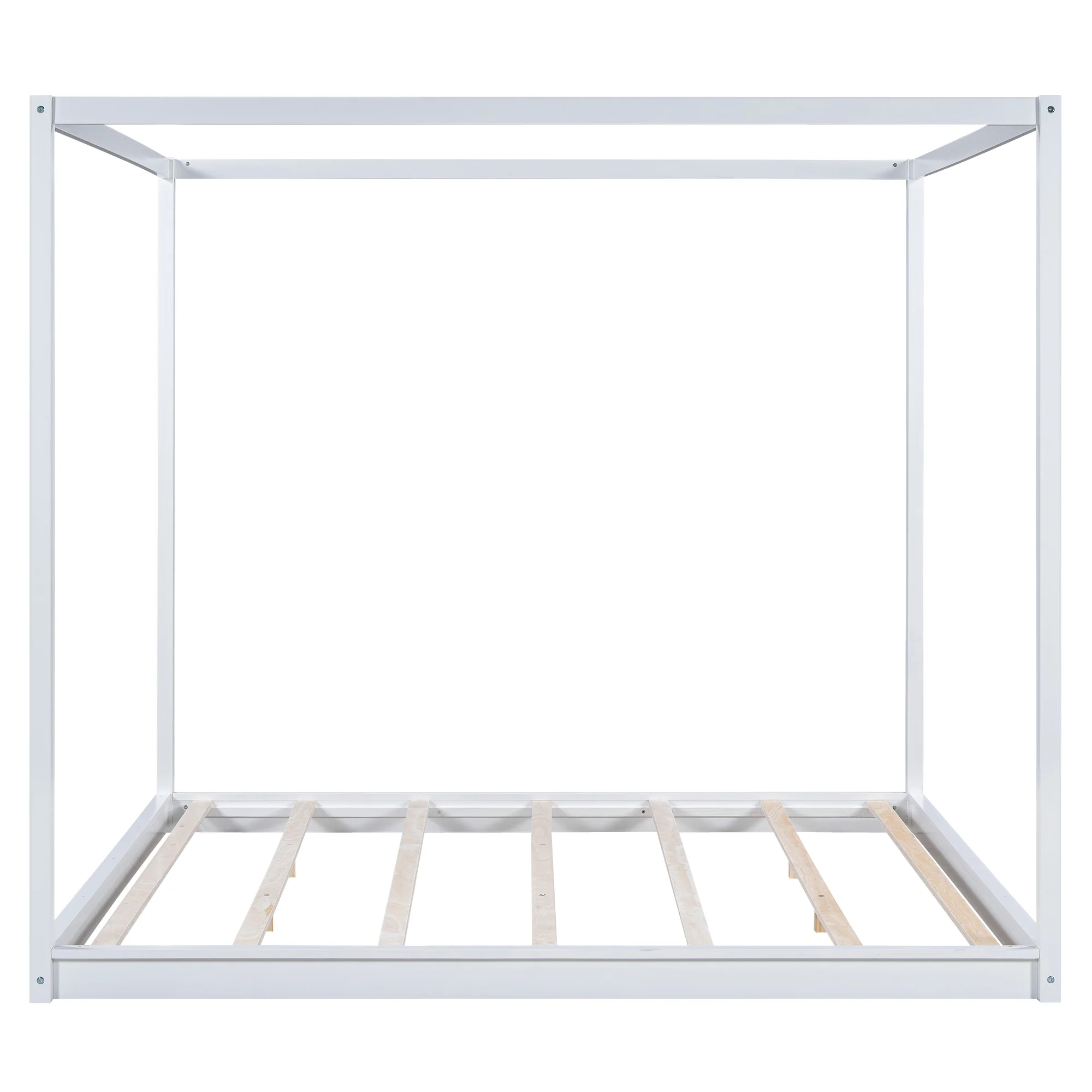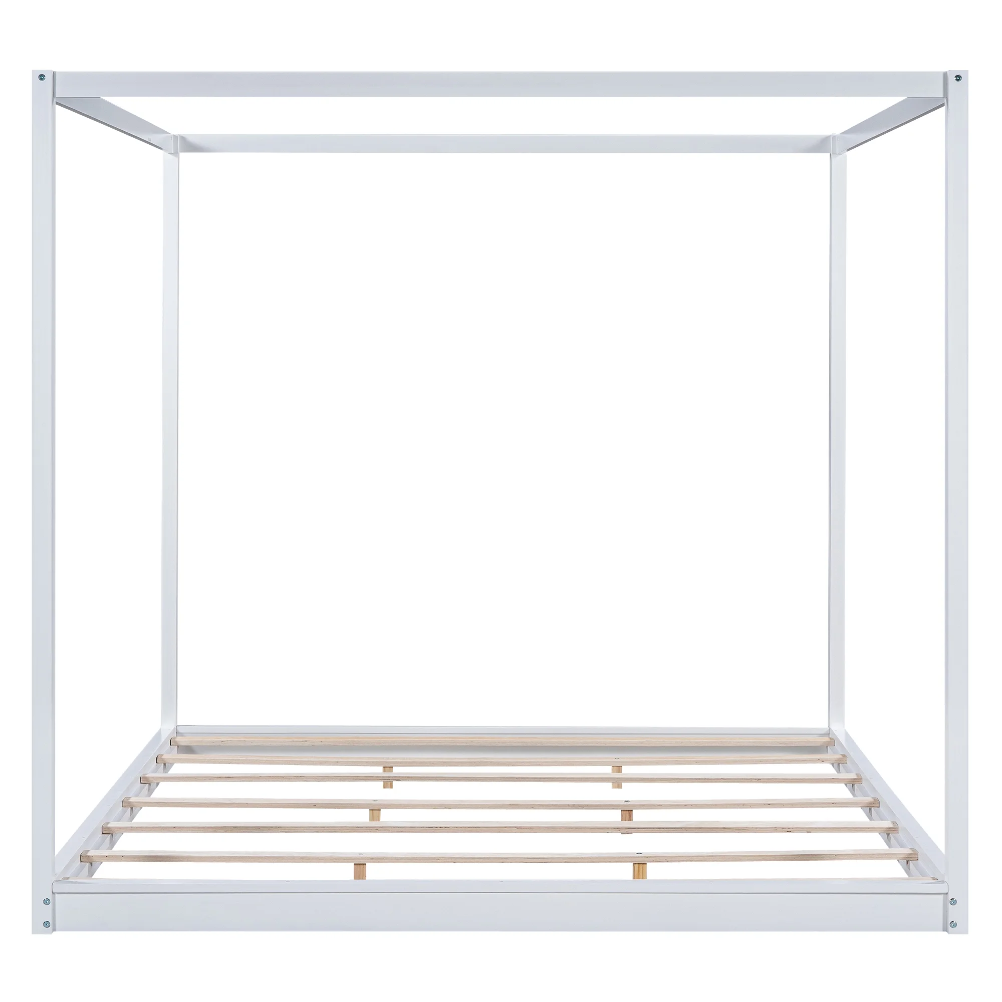 Euroco Pine Wood King Size Canopy Bed, Low Profile Platform Bed with Support Legs, No Box Spring Needed, White