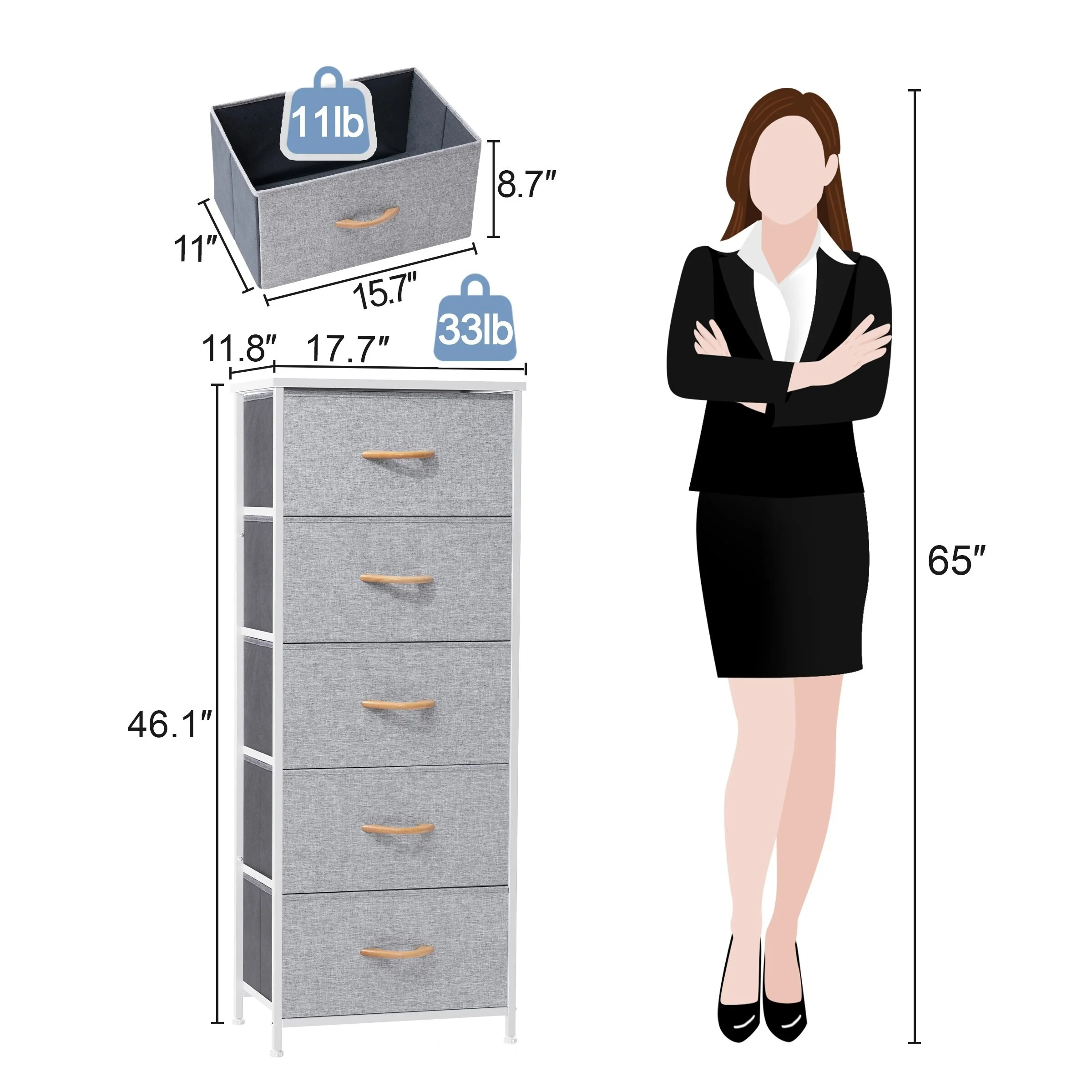 Crestlive Products Home Bedroom Furniture 5-drawer Chest Vertical Storage Tower - Fabric Dresser Light Grey Light Wood