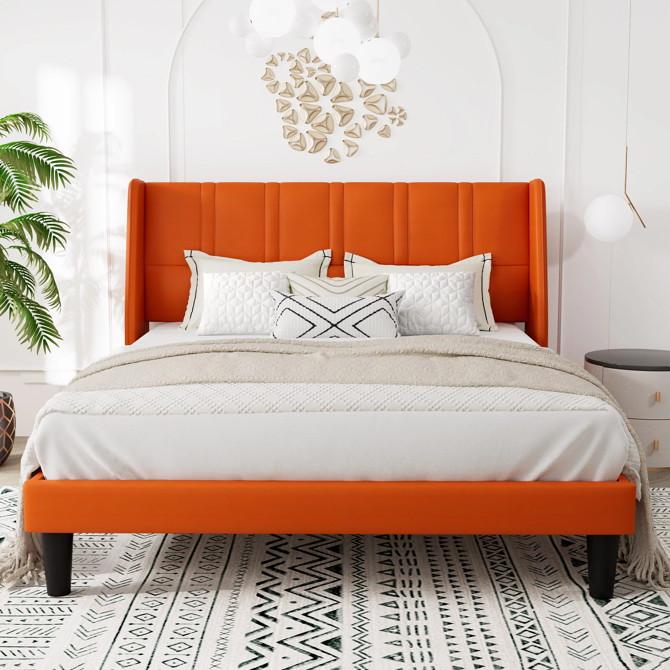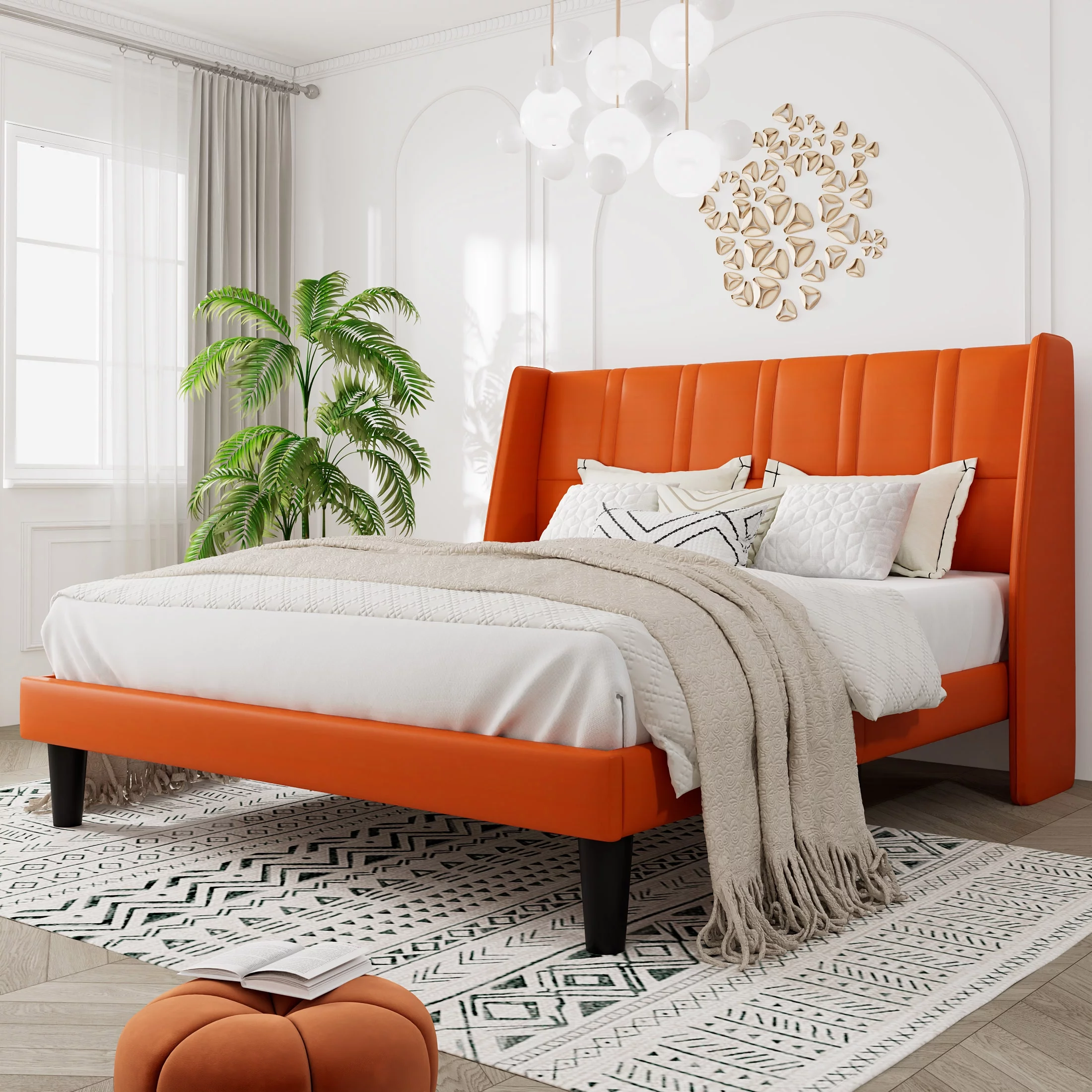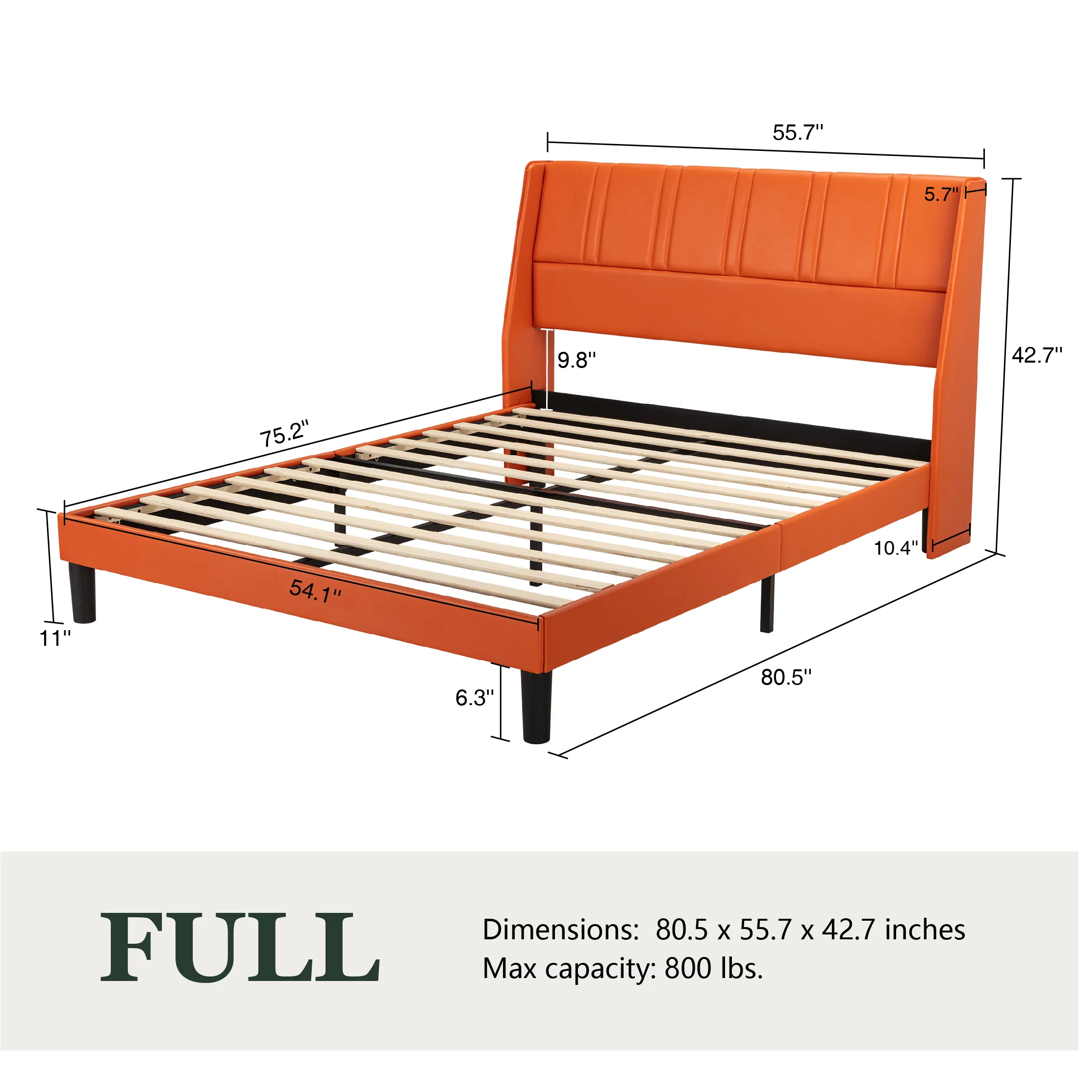 Amolife Full Size Faux Leather Platform Bed Frame with Exquisite Wingback Headboard, Orange