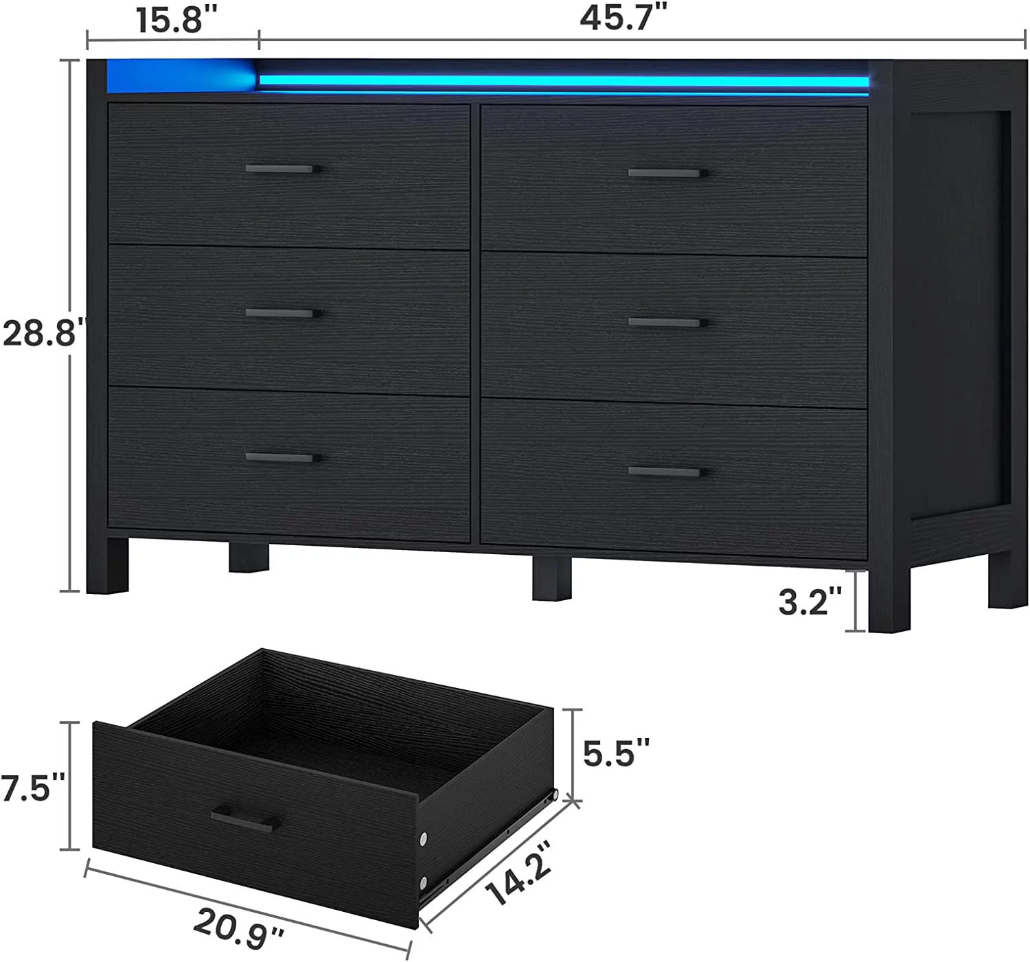 LIKIMIO 7 Glass Drawers 47" Wood Dresser with LED/Power Strip/Adult, Brown,Metal, Station,Charging