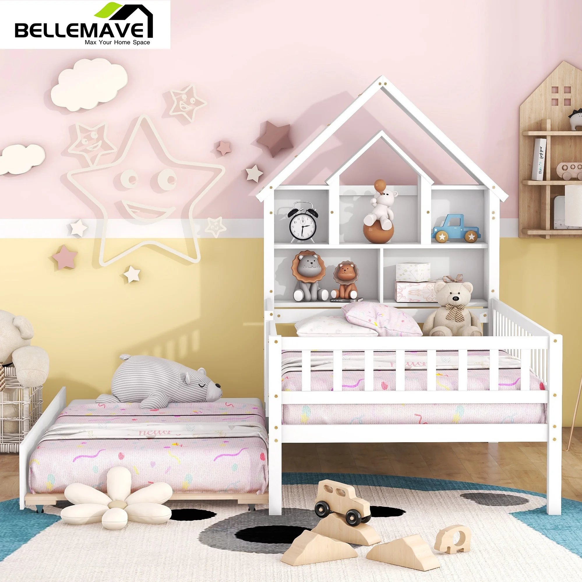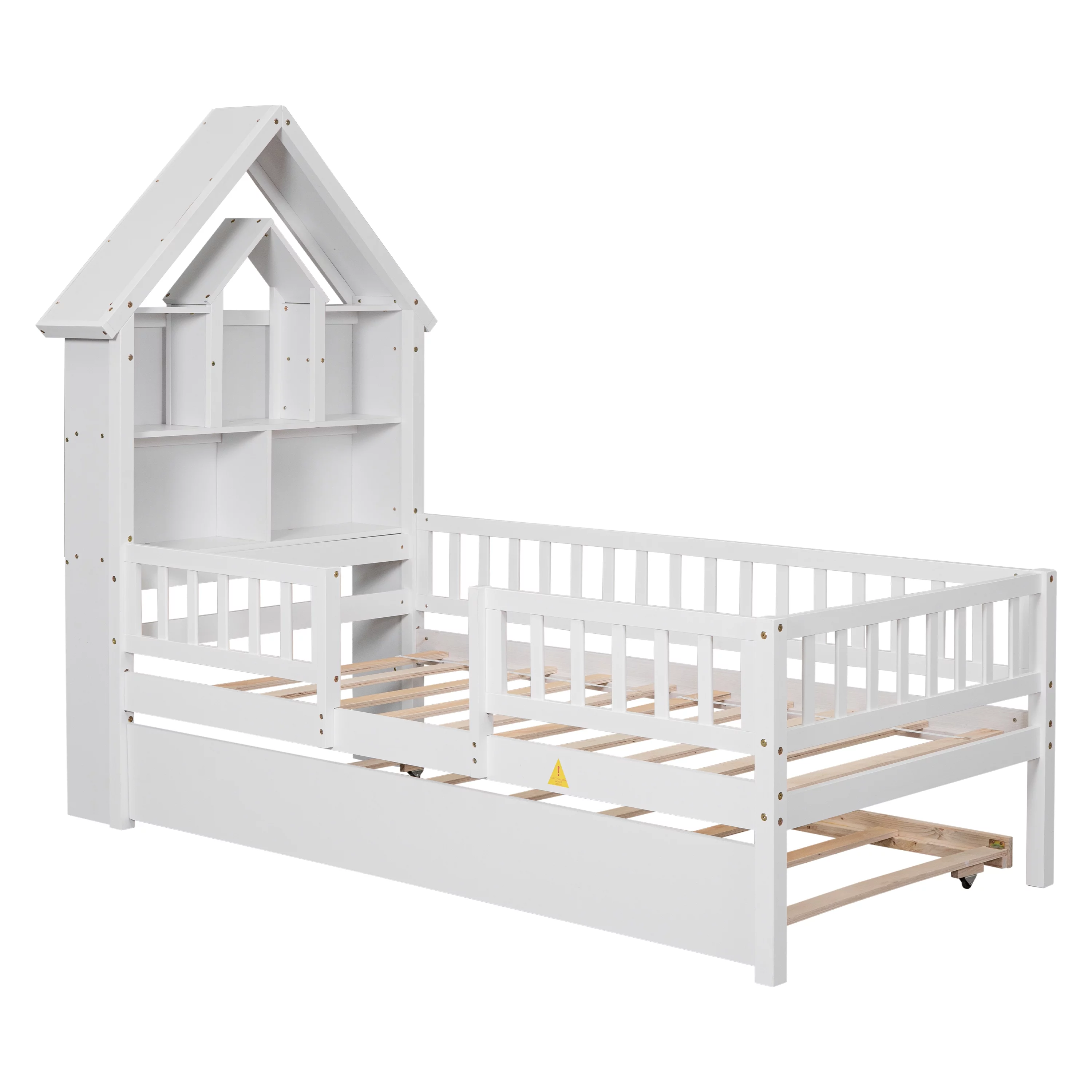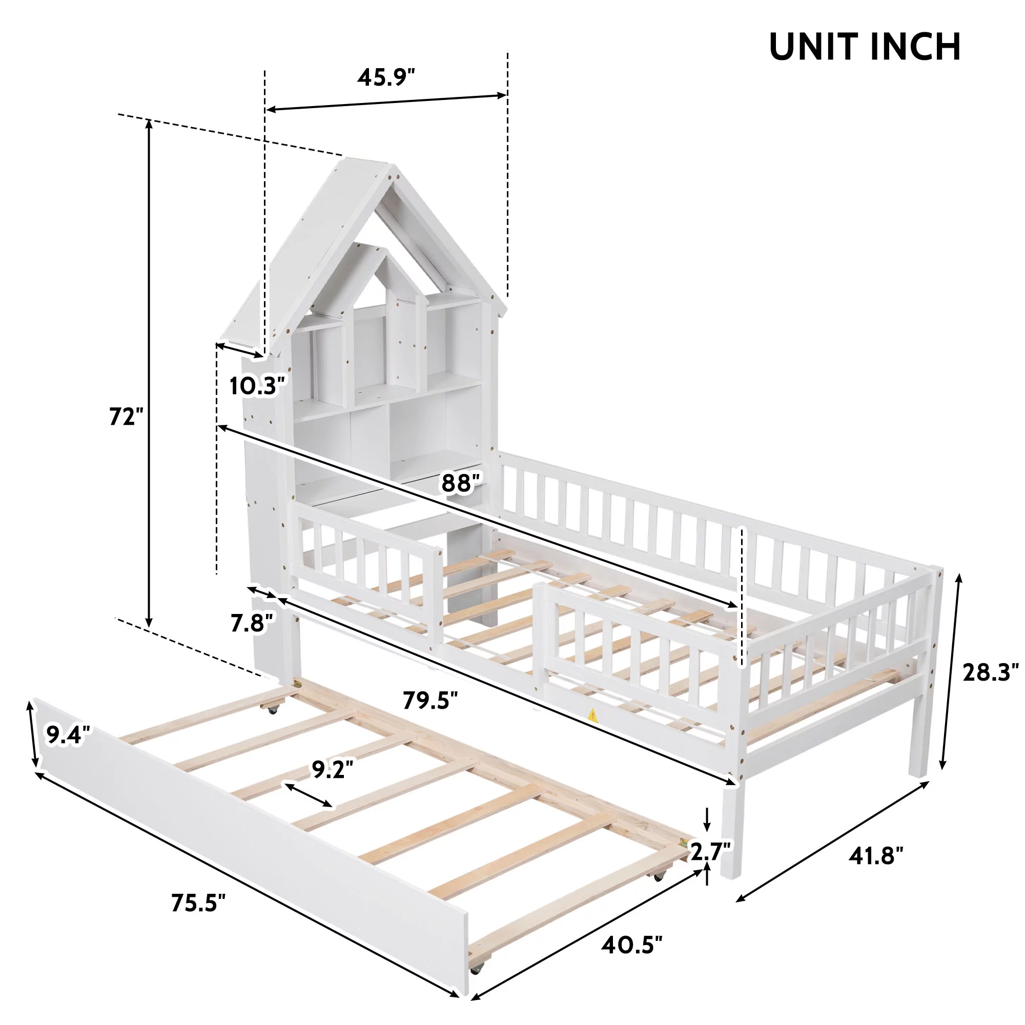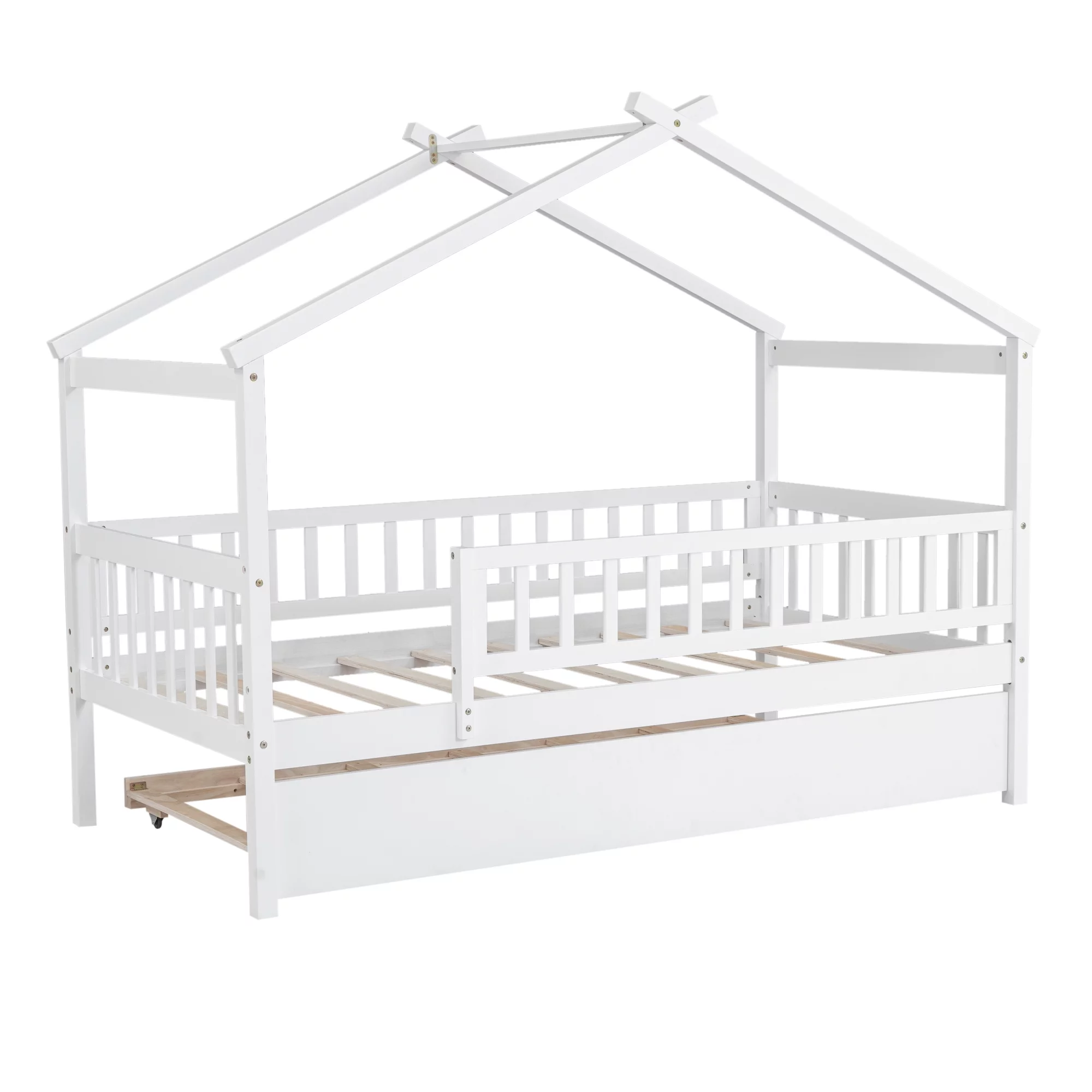 Euroco Upholstery Twin Size Platform Bed, Bunny-Shaped Bed with Twin Size Trundle for Kids, White