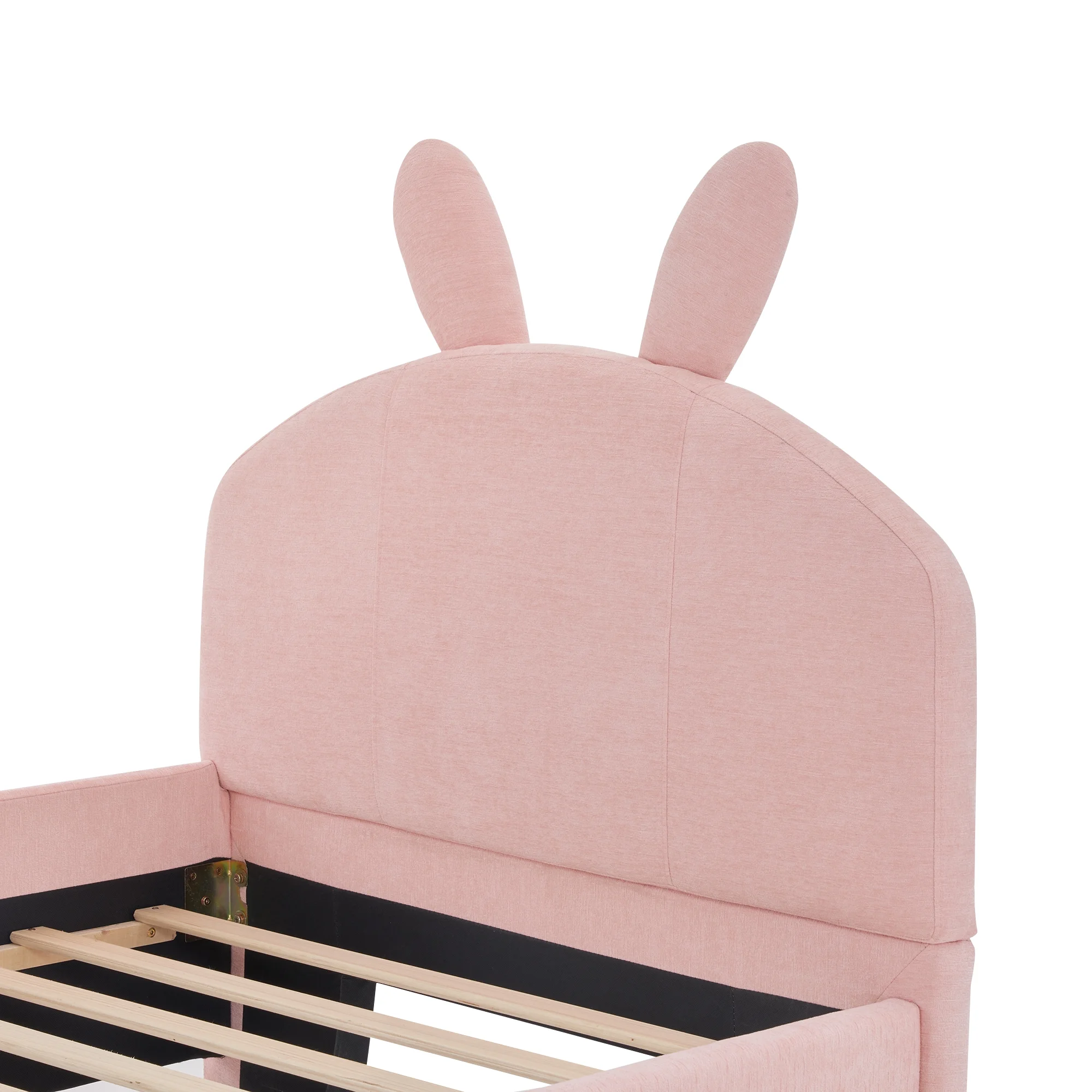 Euroco Upholstery Twin Size Platform Bed, Bunny-Shaped Bed with Twin Size Trundle for Kids, Pink