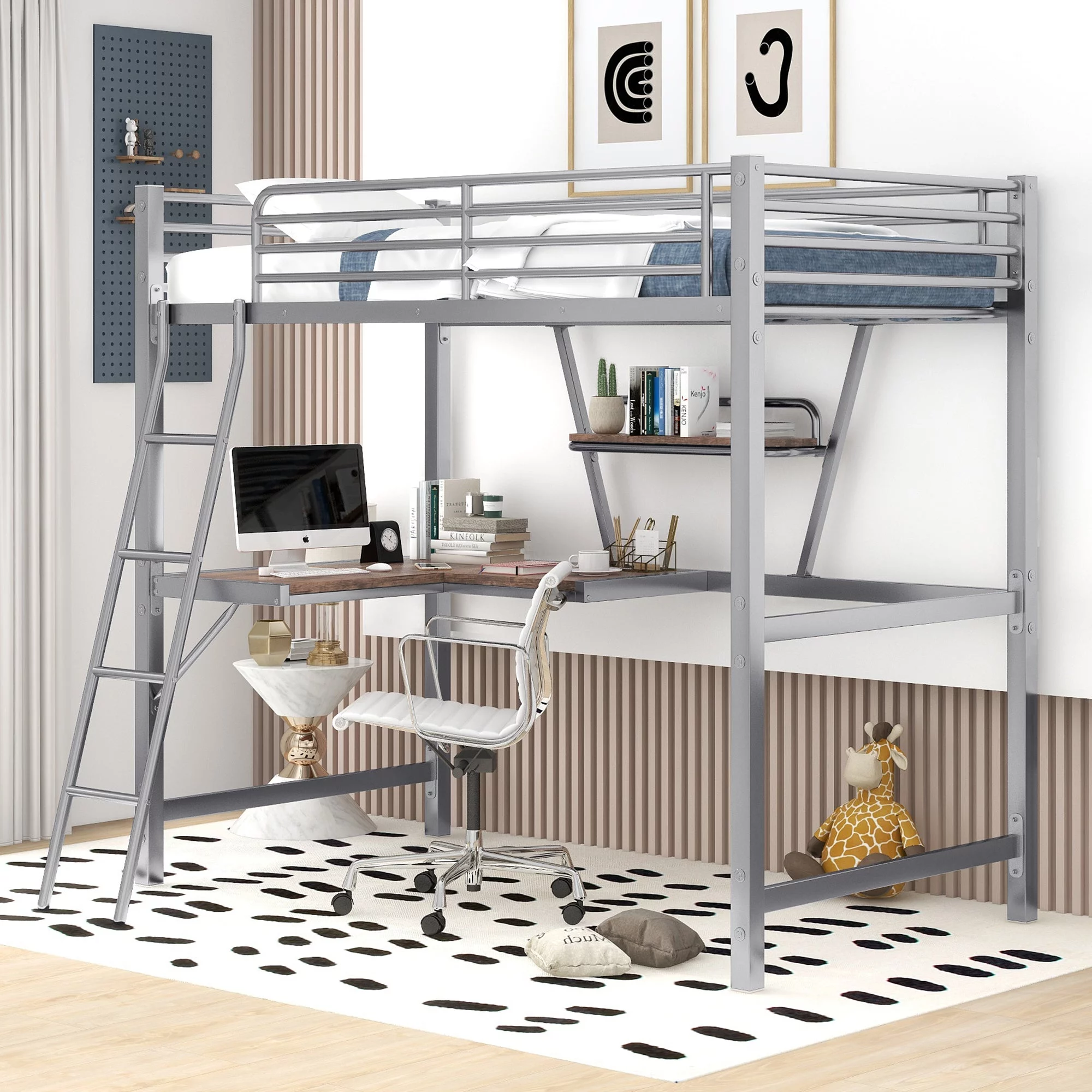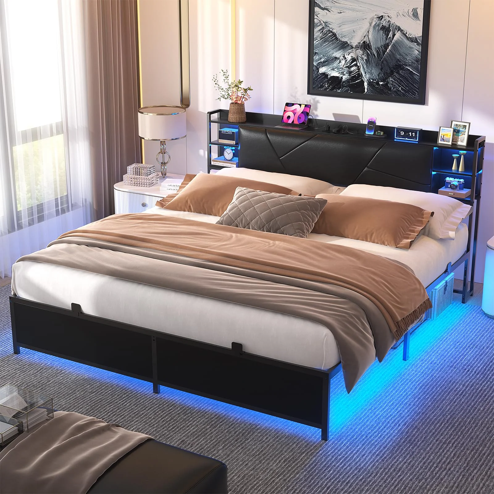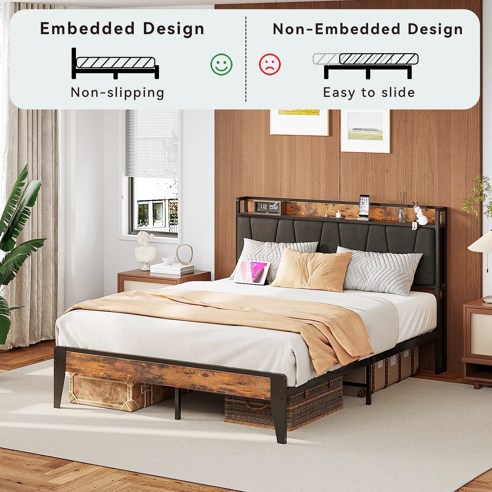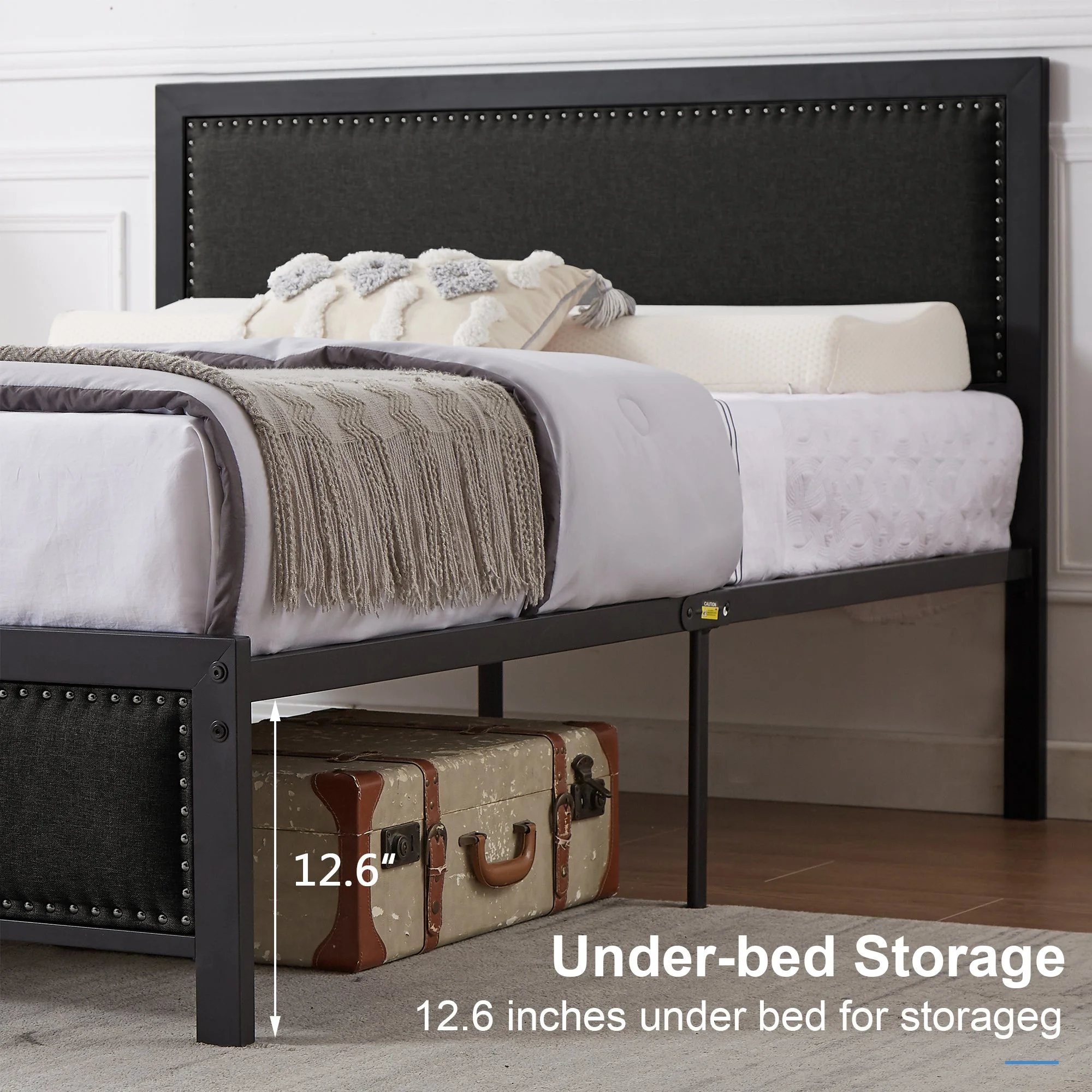 SHA CERLIN Beige Queen Size Metal Platform Bed Frame with Headboard & Underbed Storage, Adult