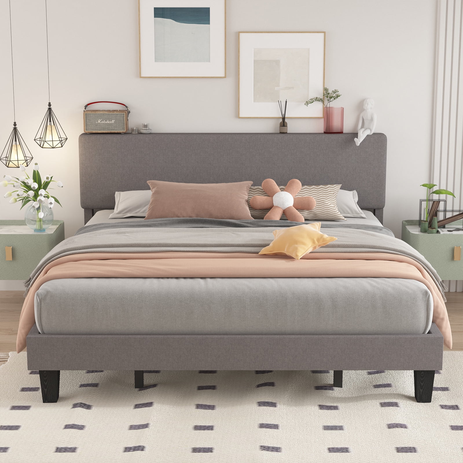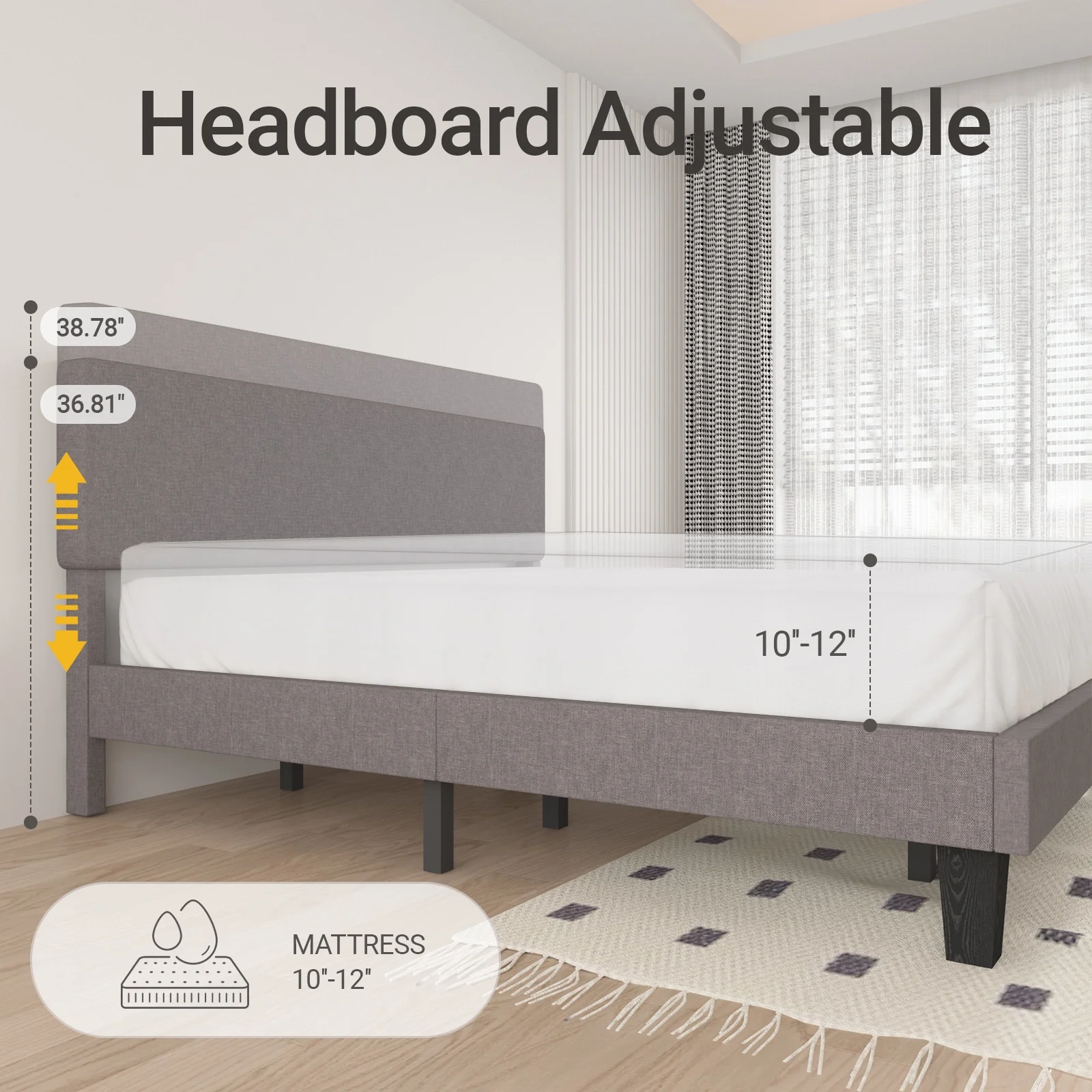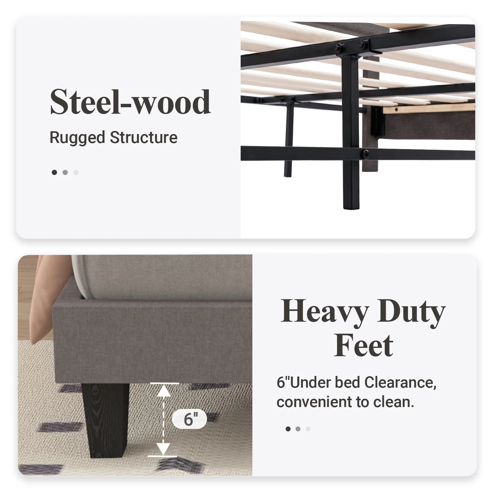 SHA CERLIN Grey Queen Size Platform Bed Frame with Fabric Headboard & Underbed Storage, Adult