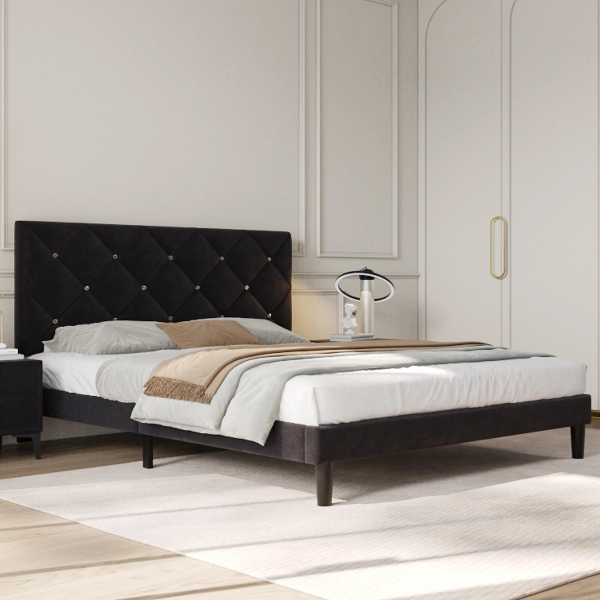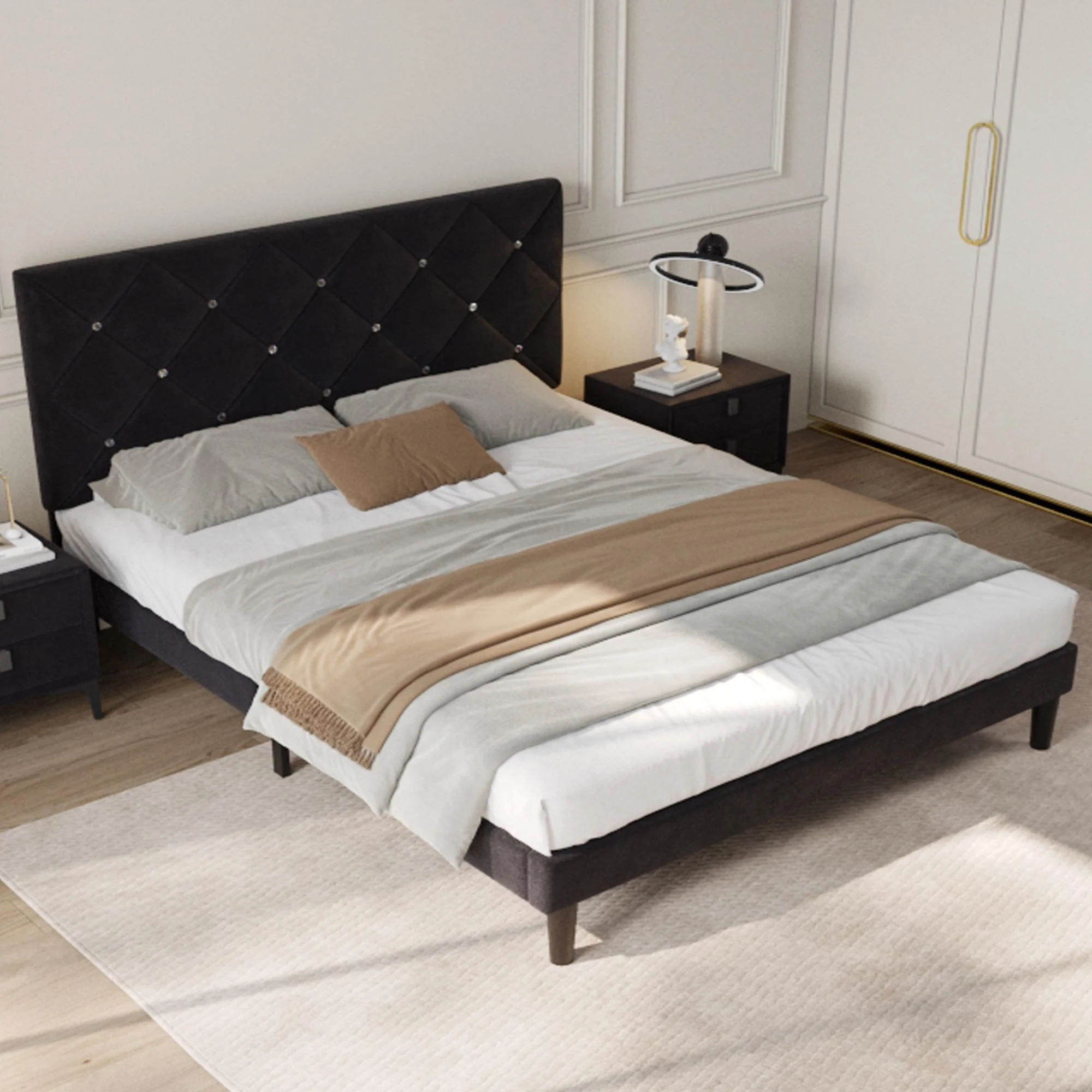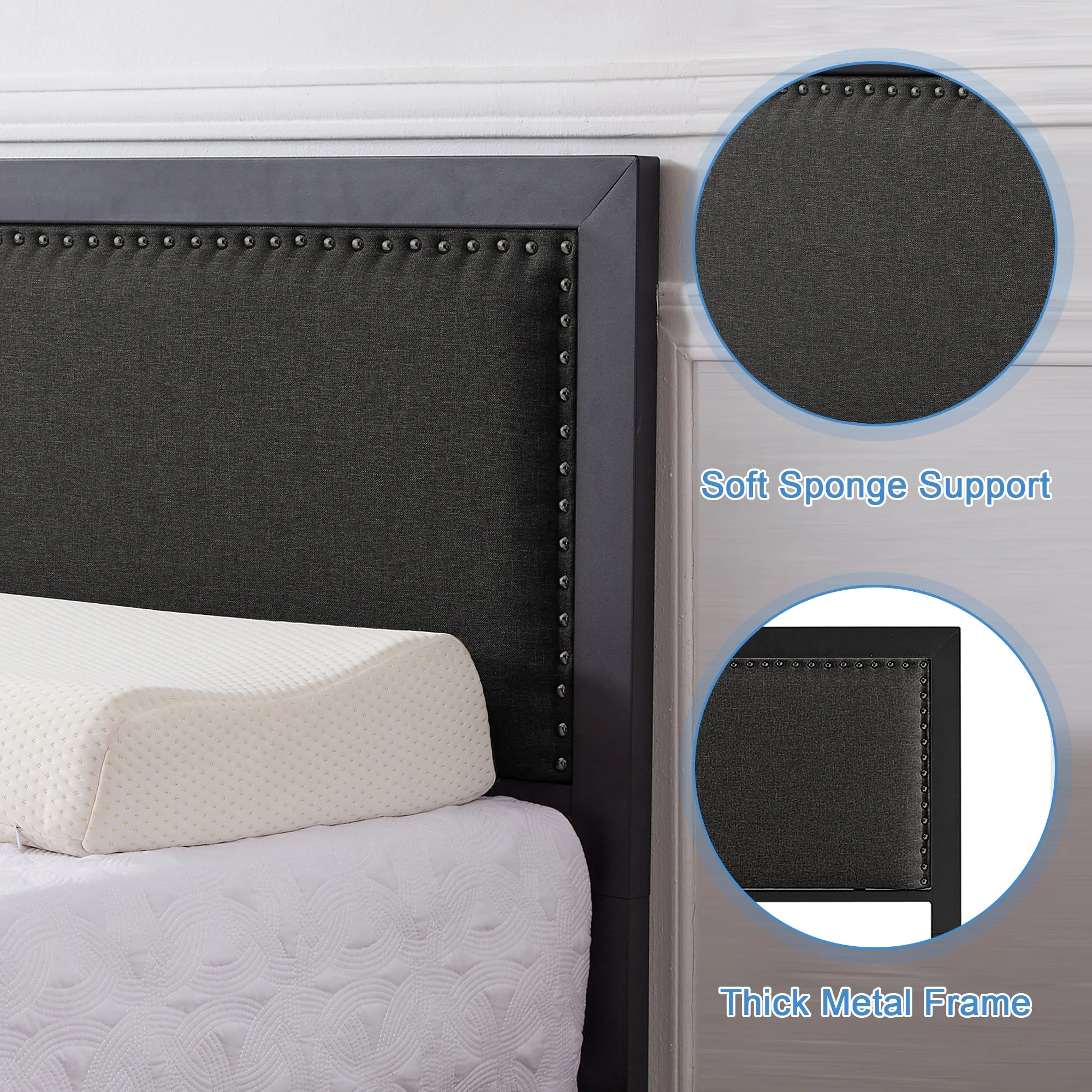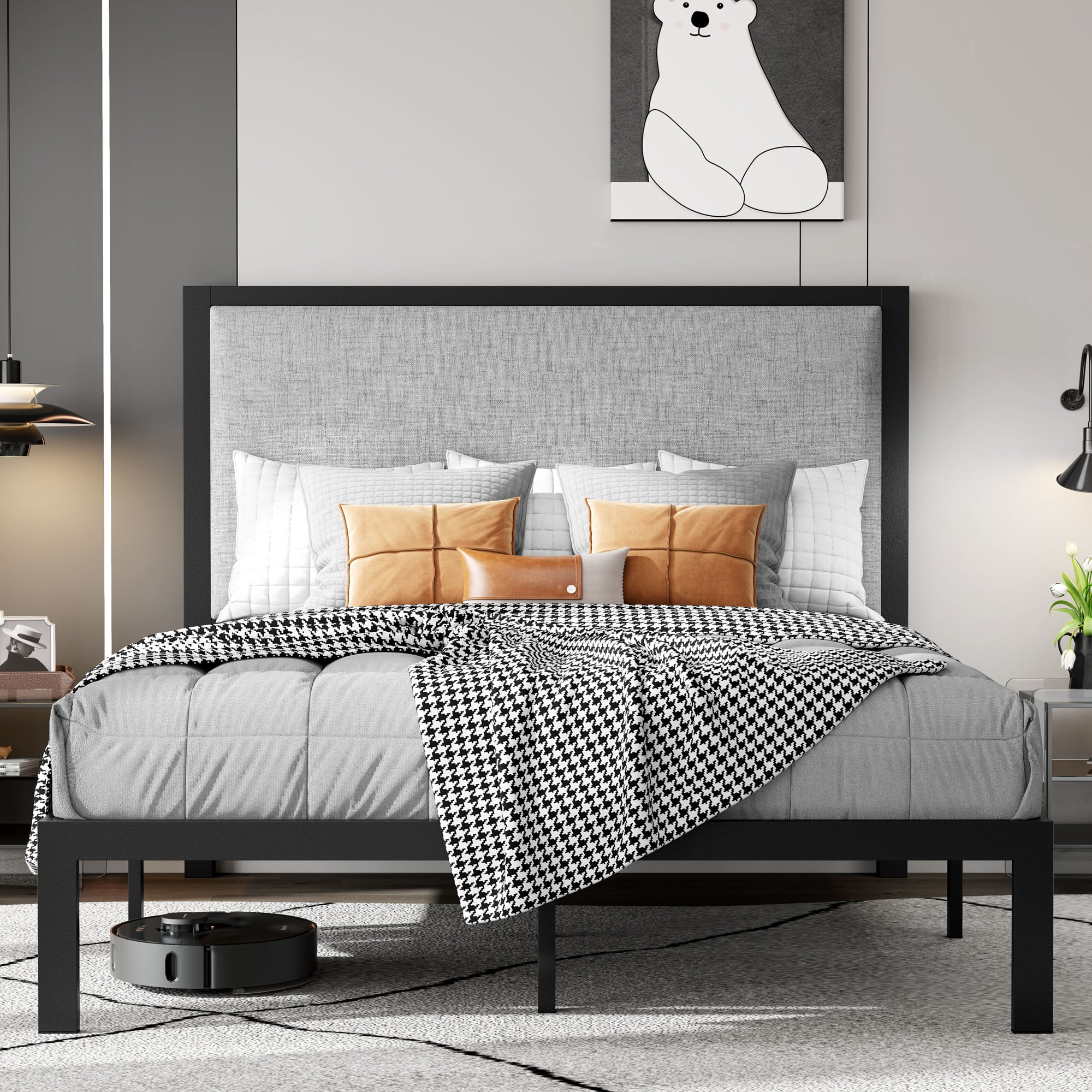 SHA CERLIN Grey Queen Size Platform Bed Frame with Fabric Headboard & Underbed Storage, Adult