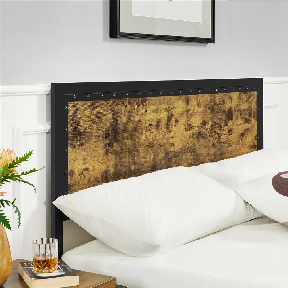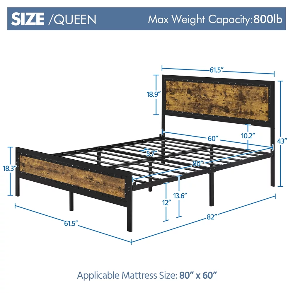 Topeakmart Industrial Metal Bed Frame with Wooden Headboard and Footboard, Queen Size, Rustic Brown