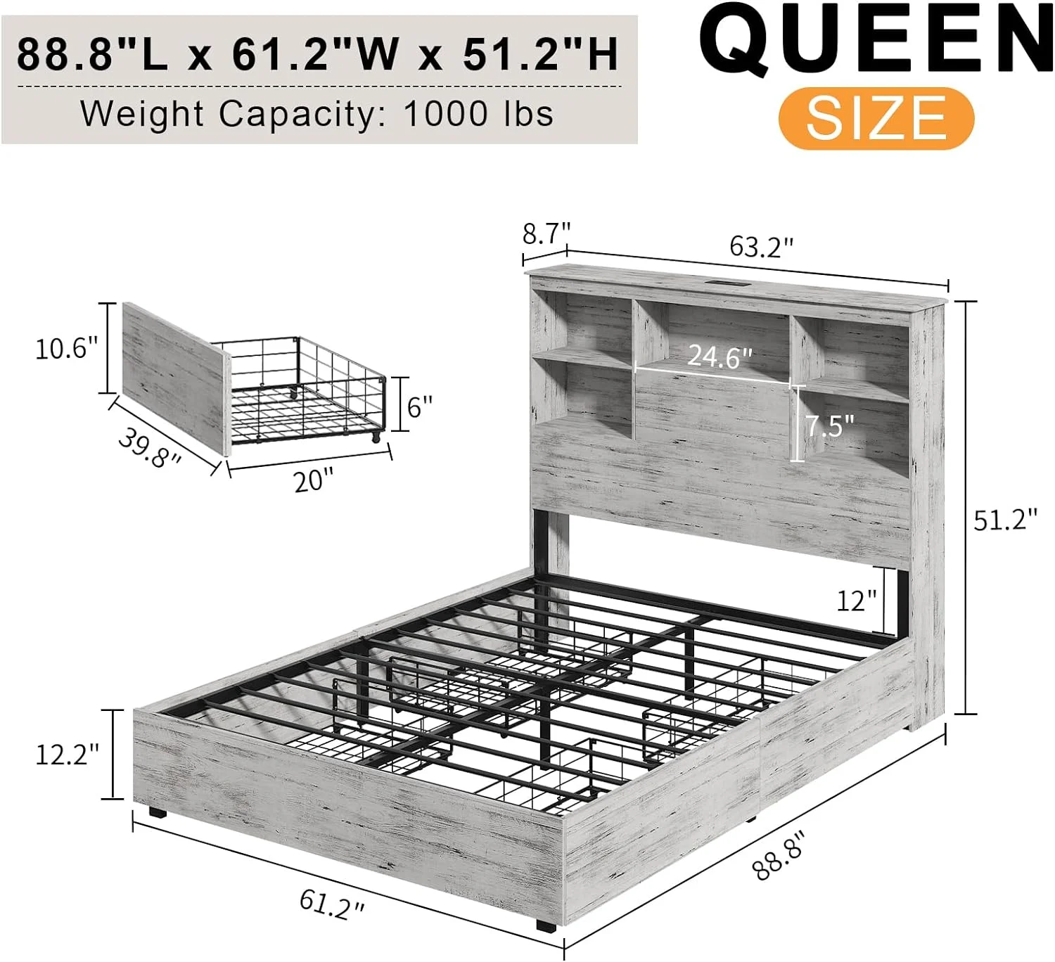 LUXOAK Queen Size Bed Frame with LED Bookcase Headboard, Wooden Storage Bed with Charging Station & 4 Drawers, White Birch