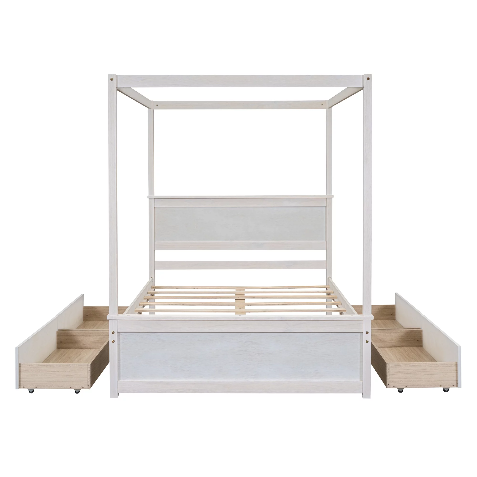 Churanty Full Size Canopy Bed Frame with Headboard,Wood Full Platform Bed with 4 Storage Drawers,White