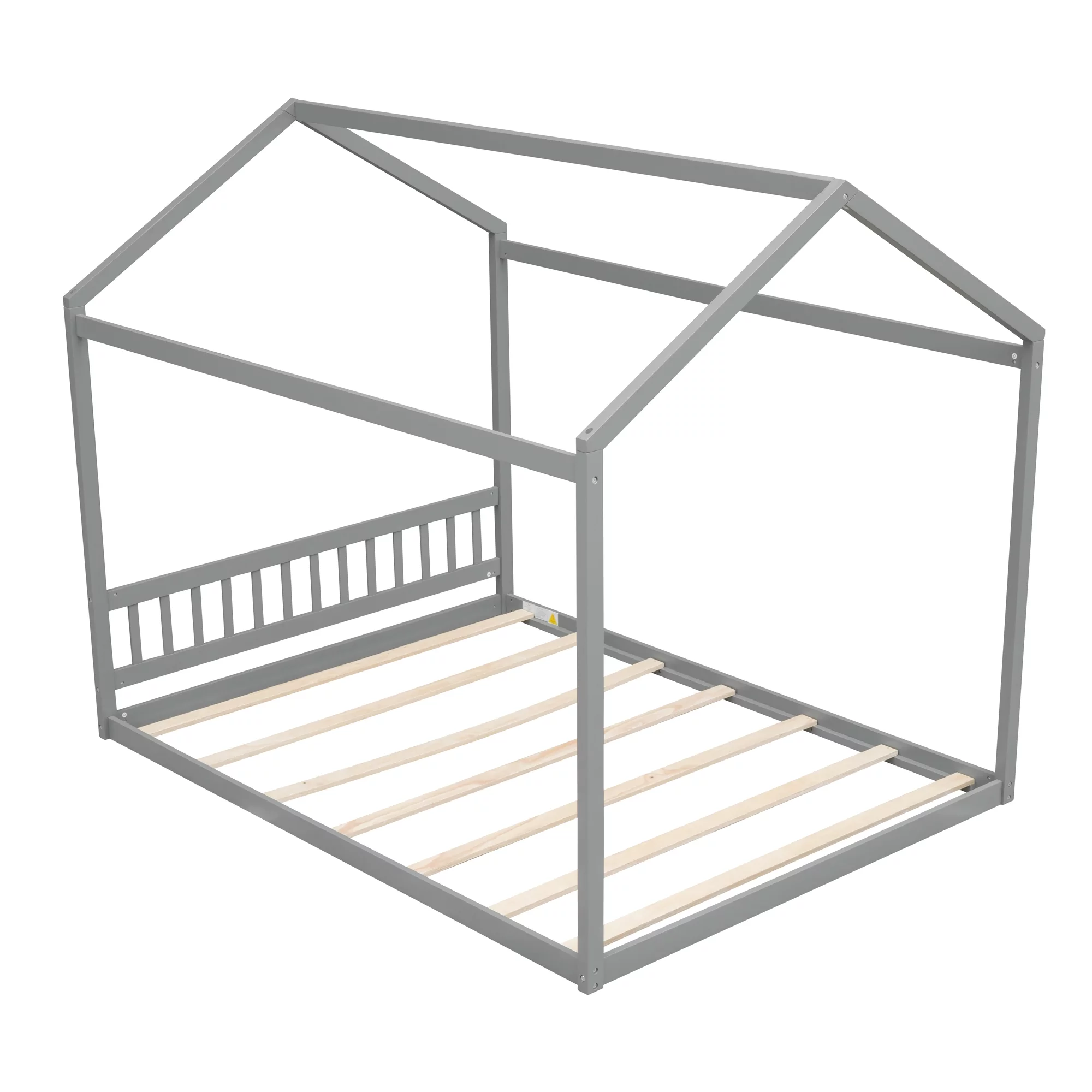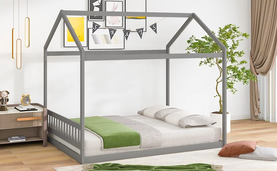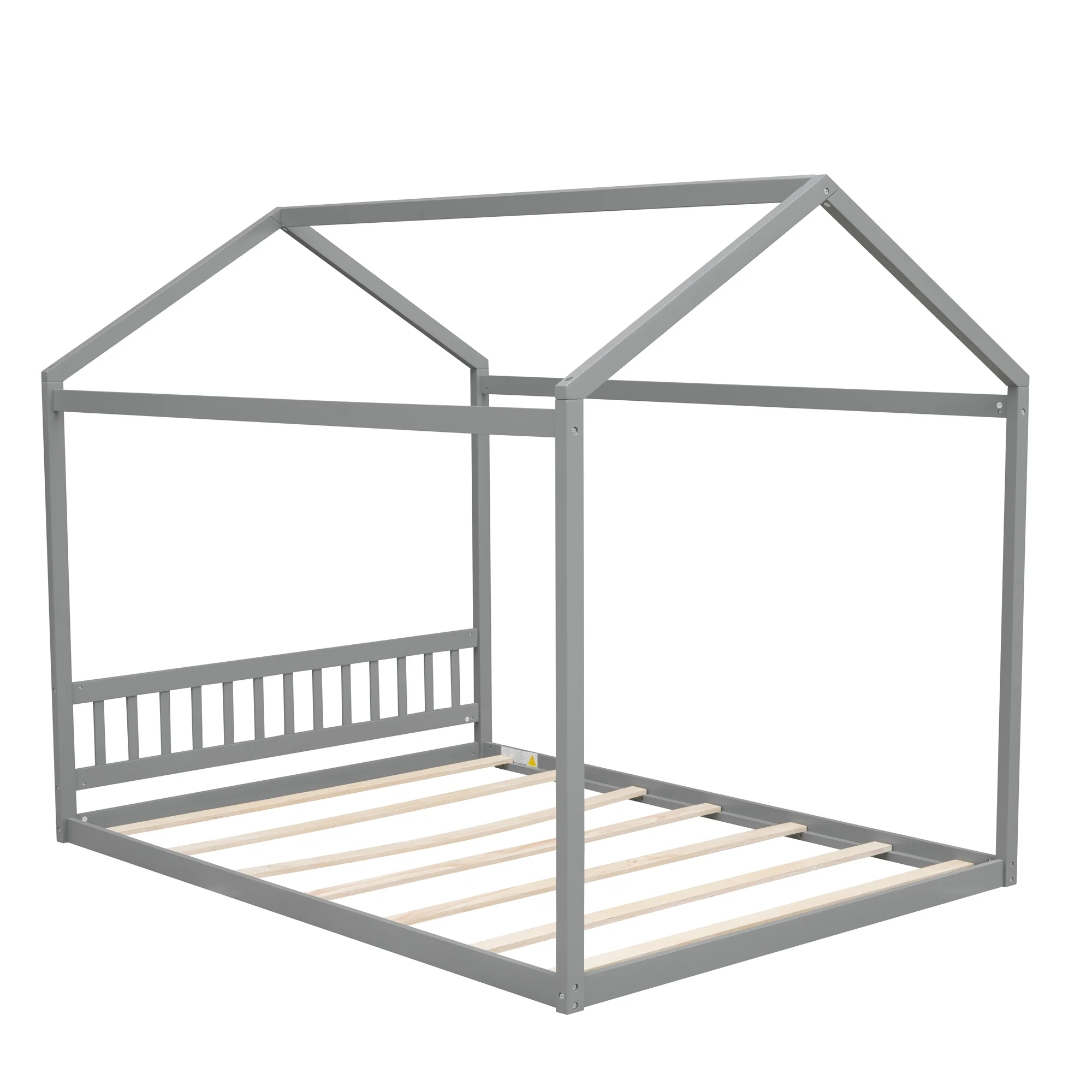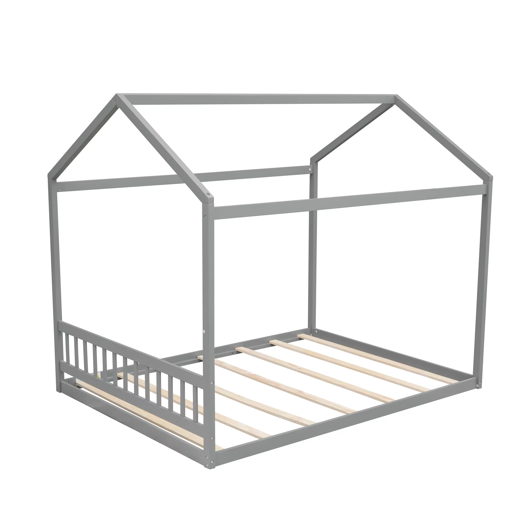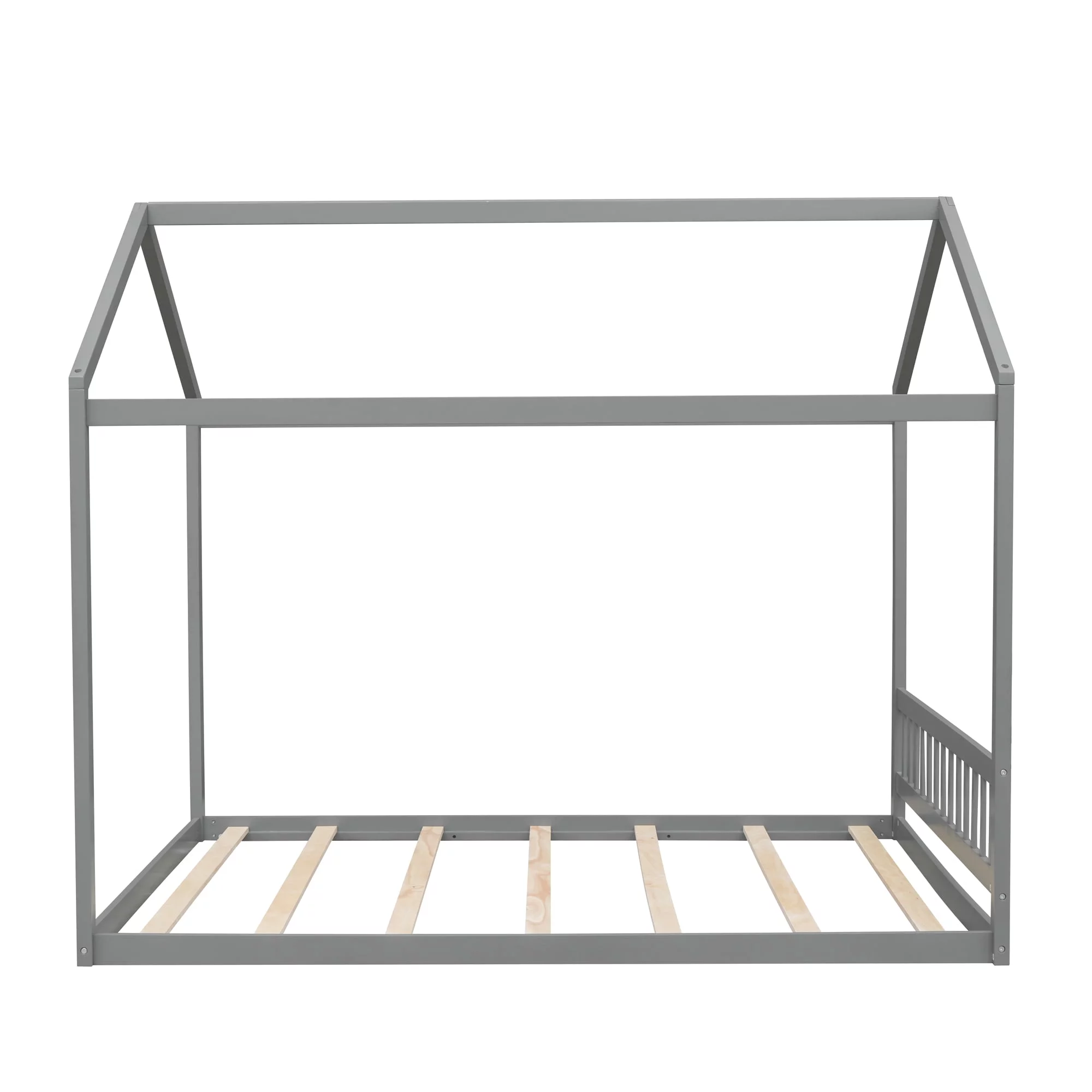 Euroco Pine Wood Queen Size House Shaped Canopy Bed for Bedroom, House Platform Bed for Living Room, Gray