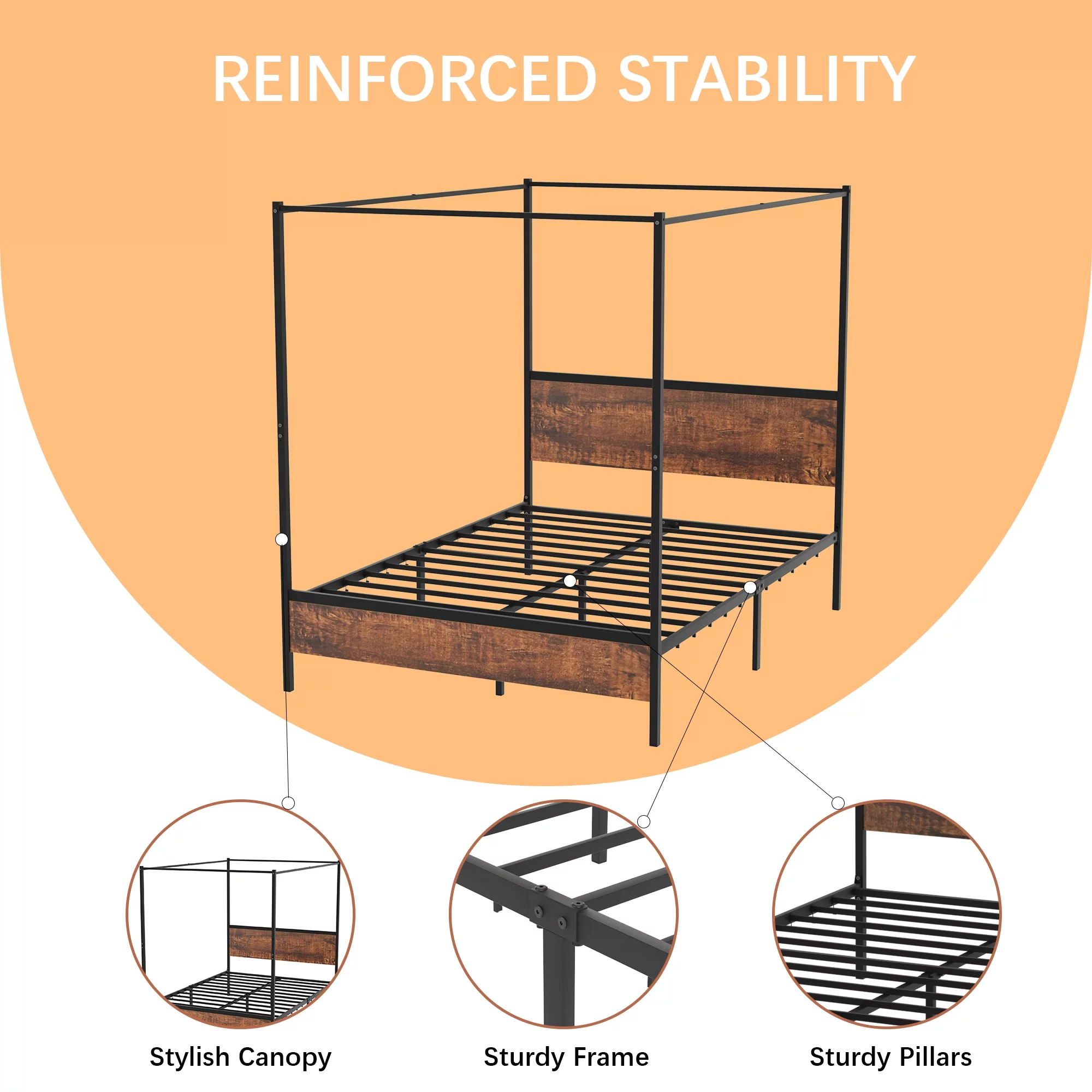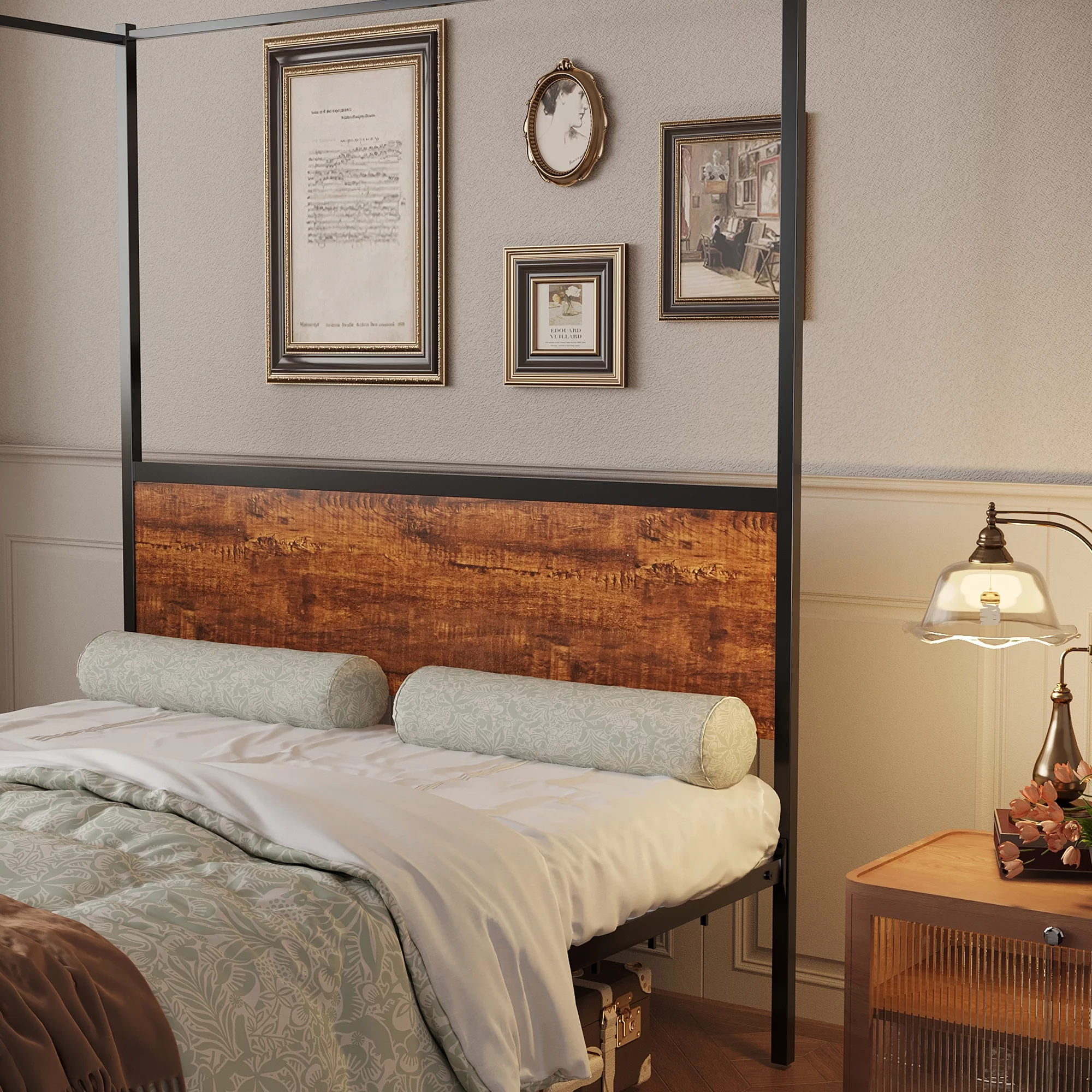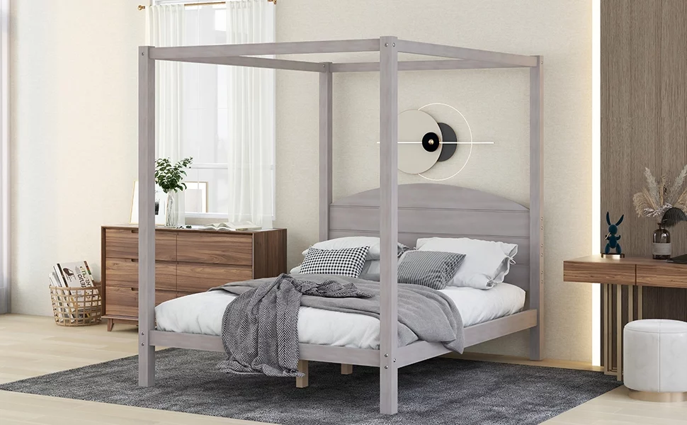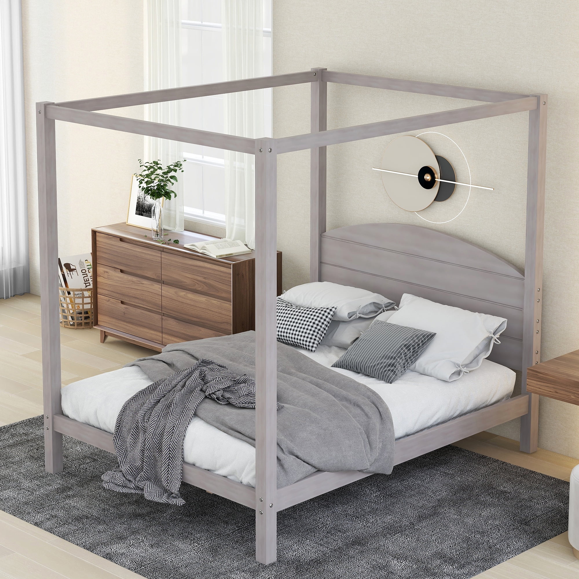 EUROCO Wood Queen Size Canopy Bed, Solid Wood Platform Bed with Headboard for Kids Bedroom, Gray