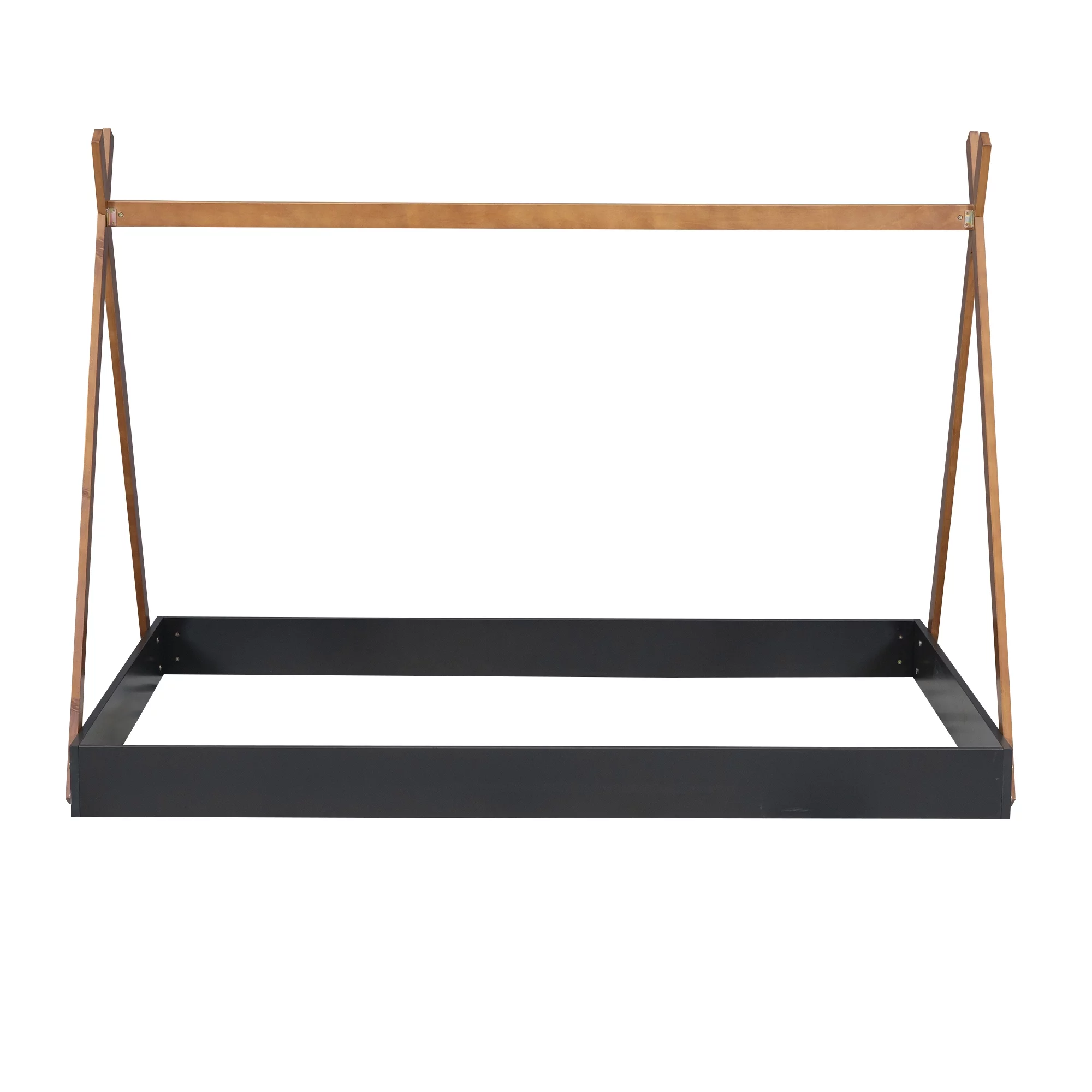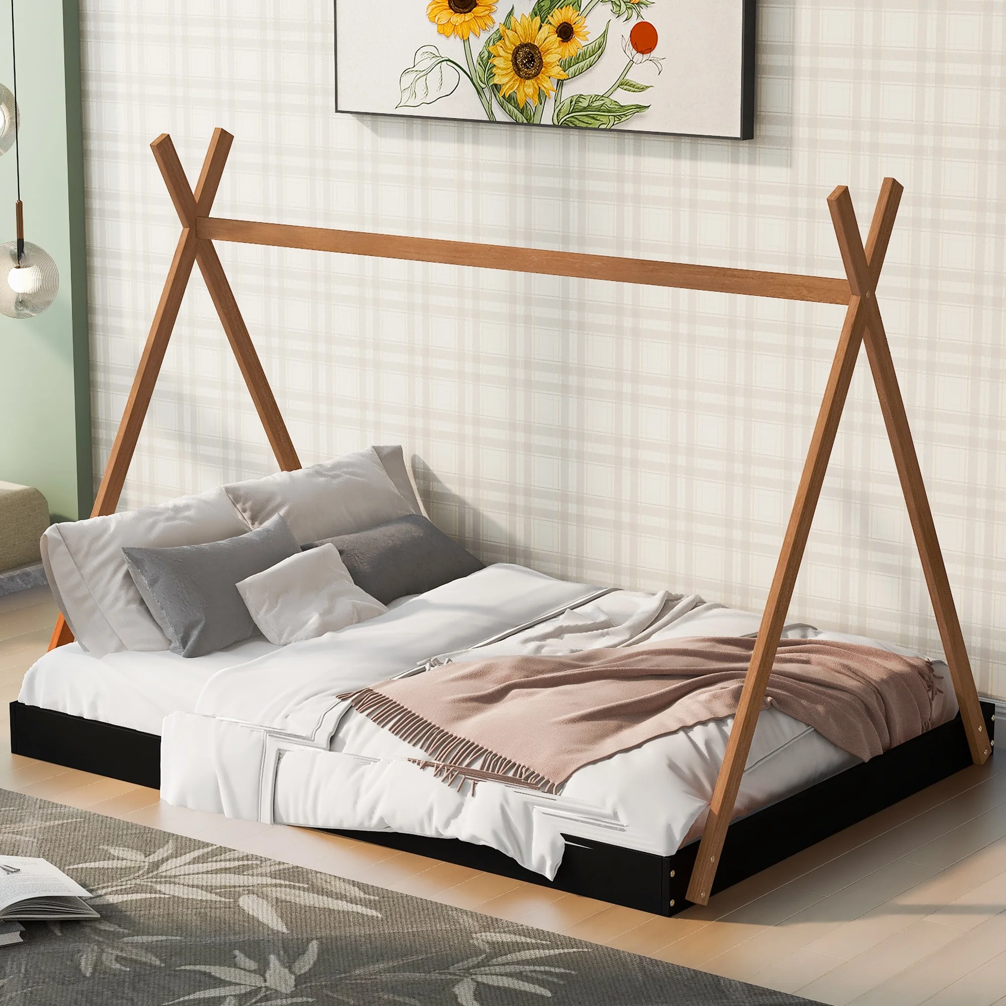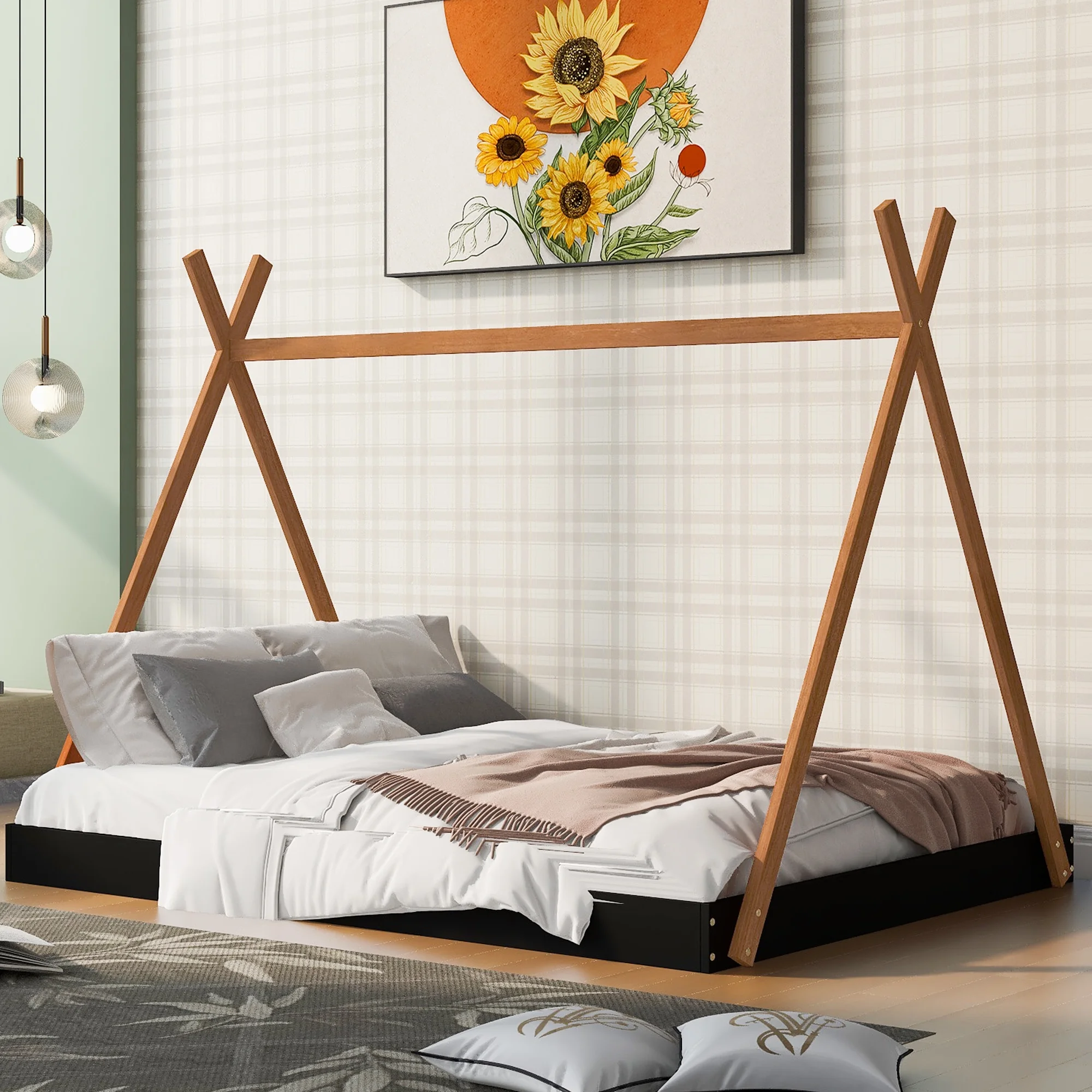 Euroco Full Size Tent Floor Bed, x-Shaped House Platform Bed for Kids, Wood Triangle Canopy Bed Frame, Natural