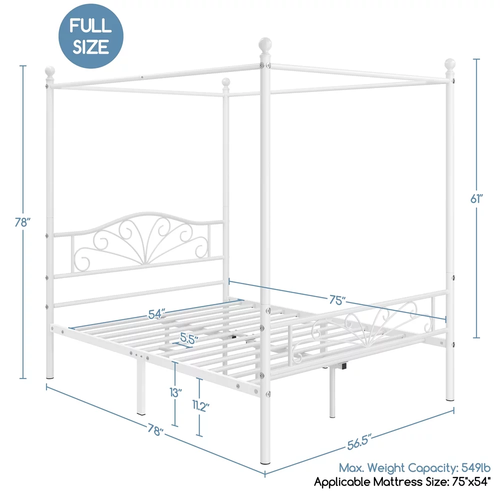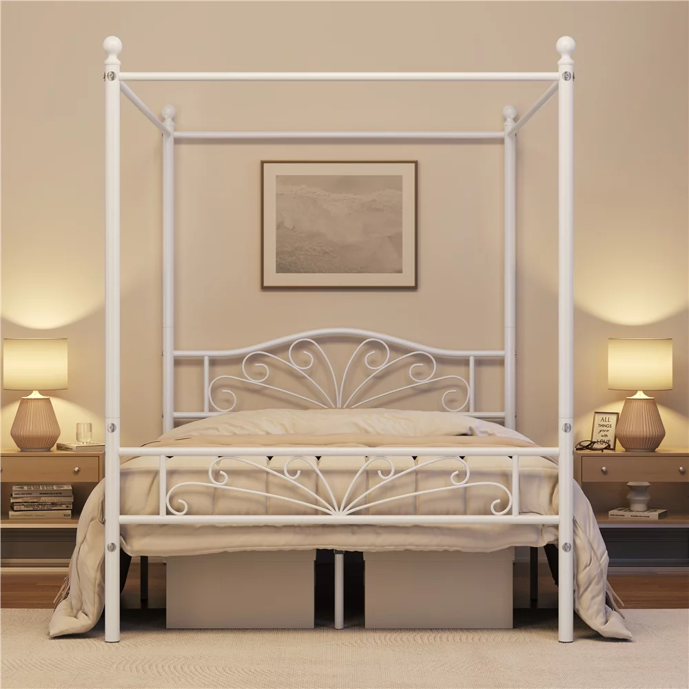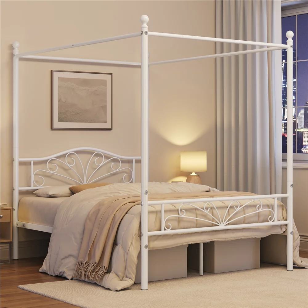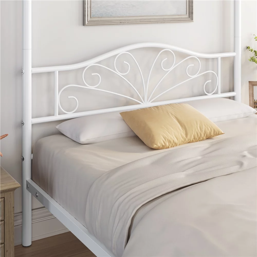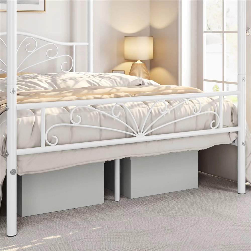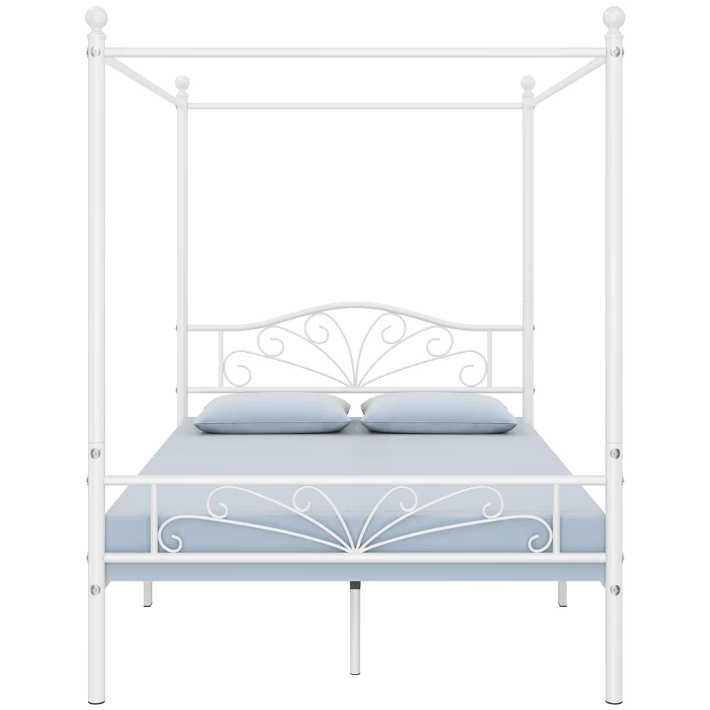Yaheetech Four-poster Metal Canopy Bed Frame with Graceful Scroll,Full,White