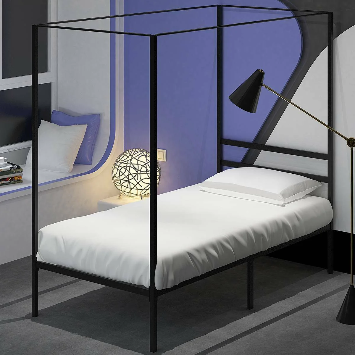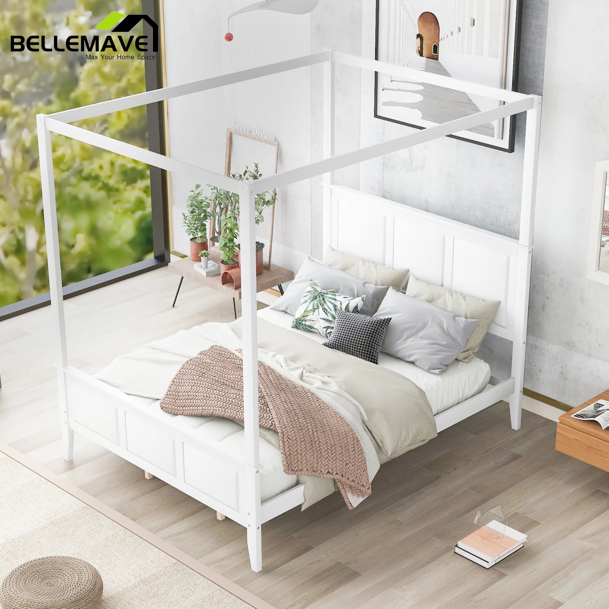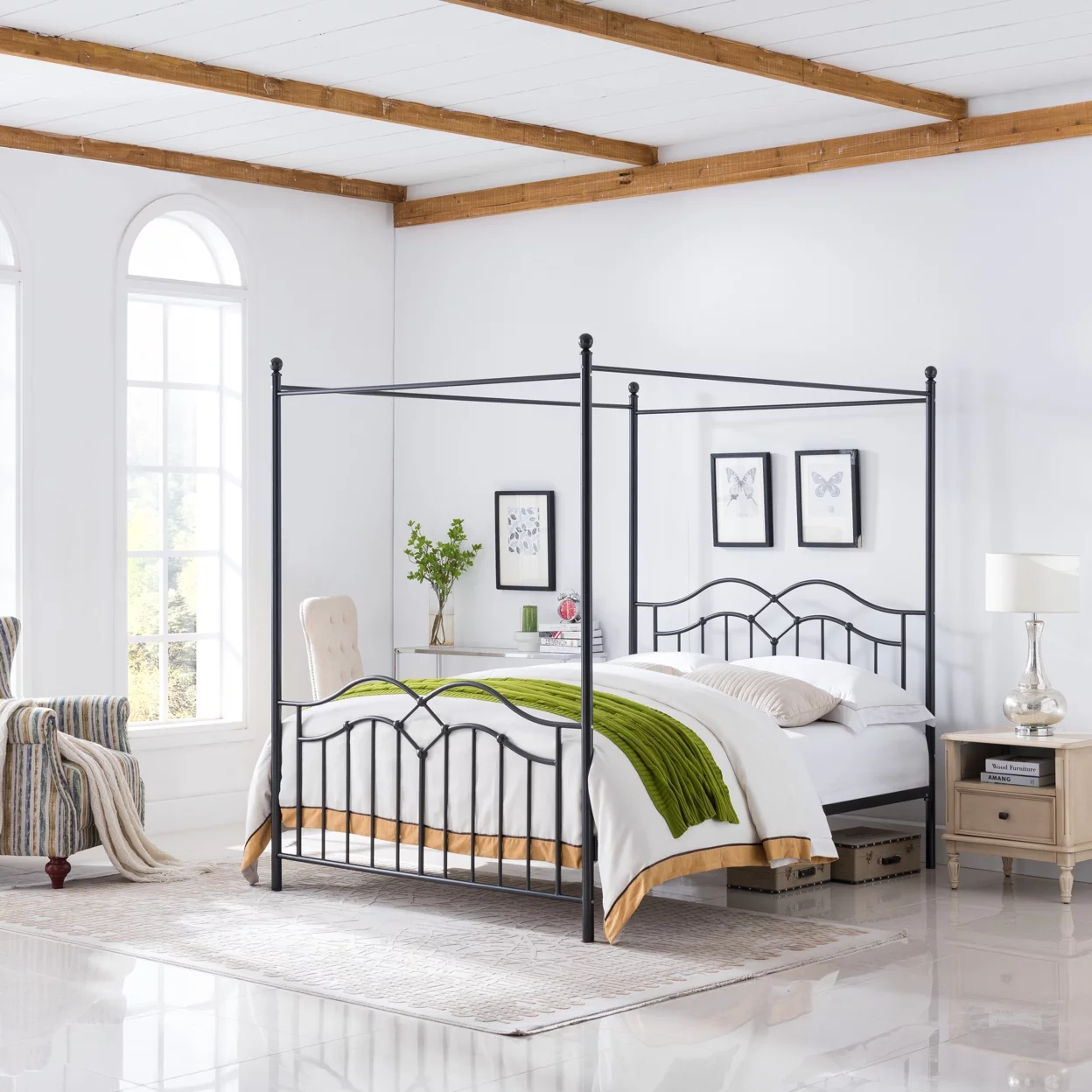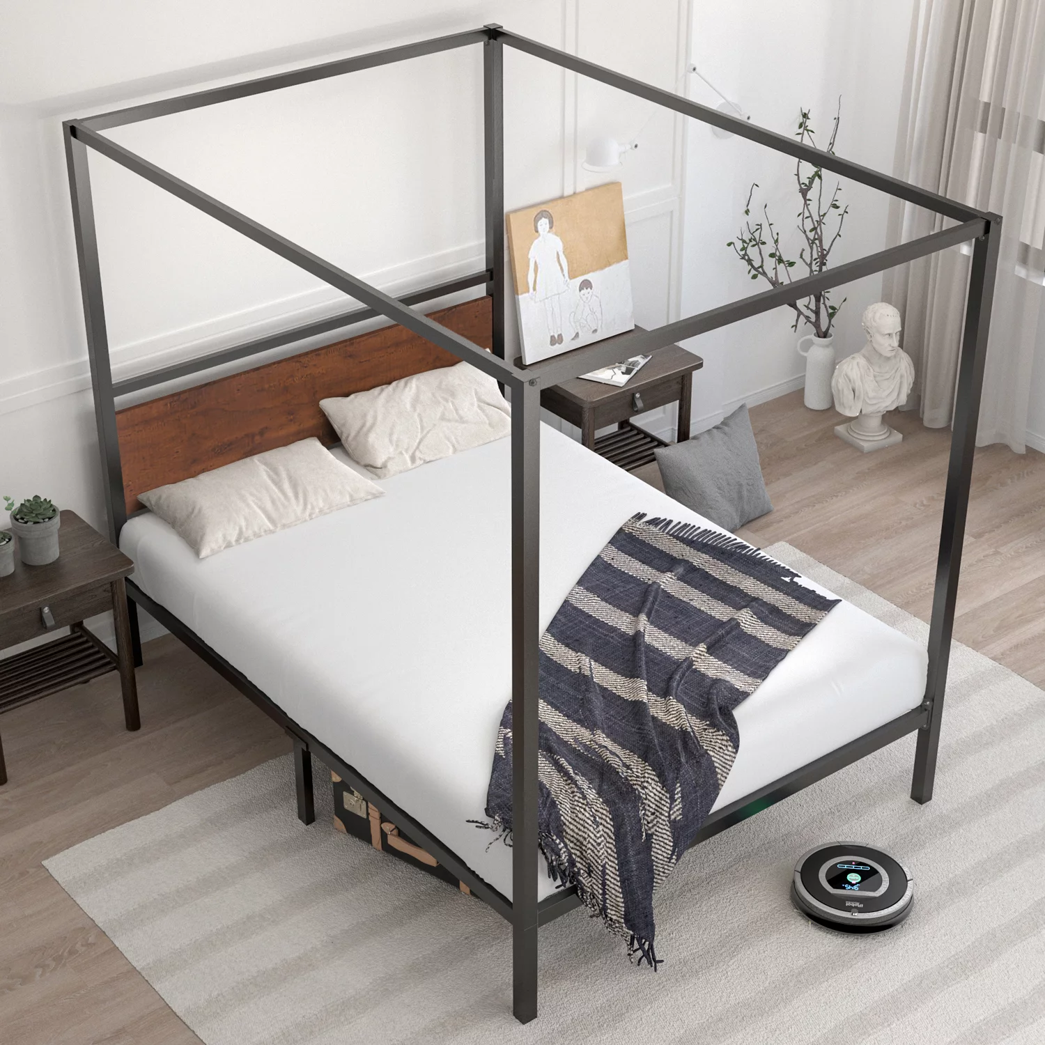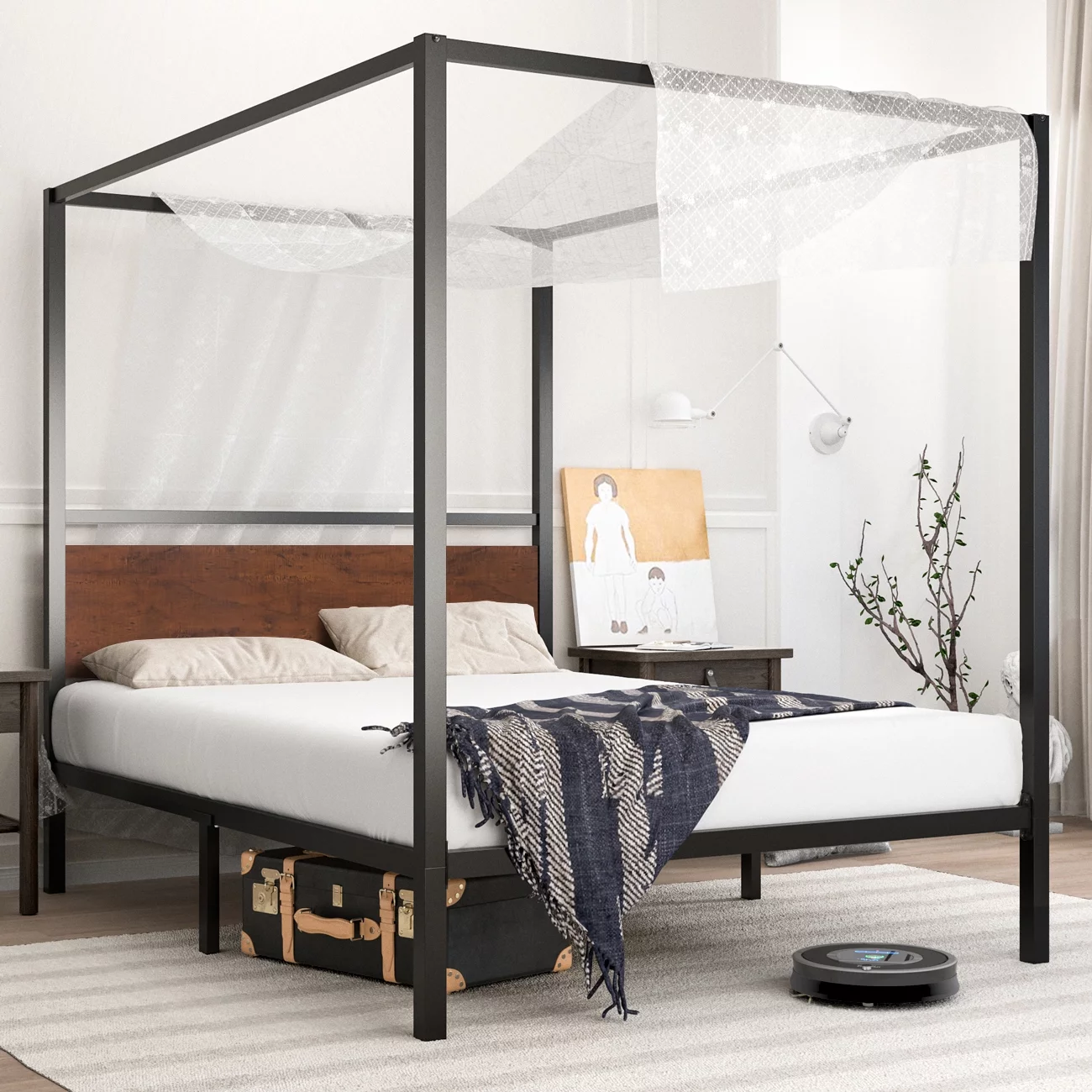 Yaheetech Four-poster Metal Canopy Bed Frame with Graceful Scroll,Full,White