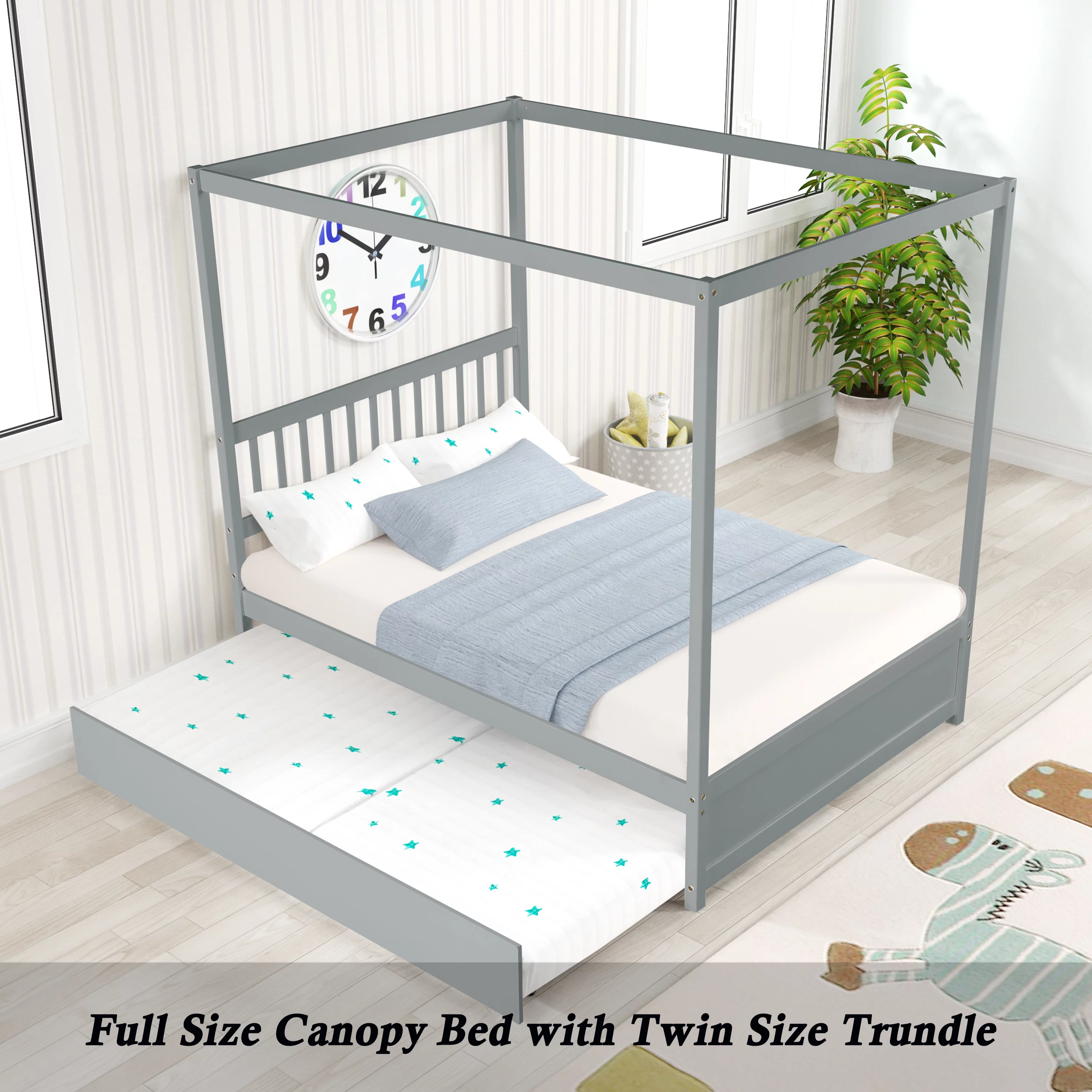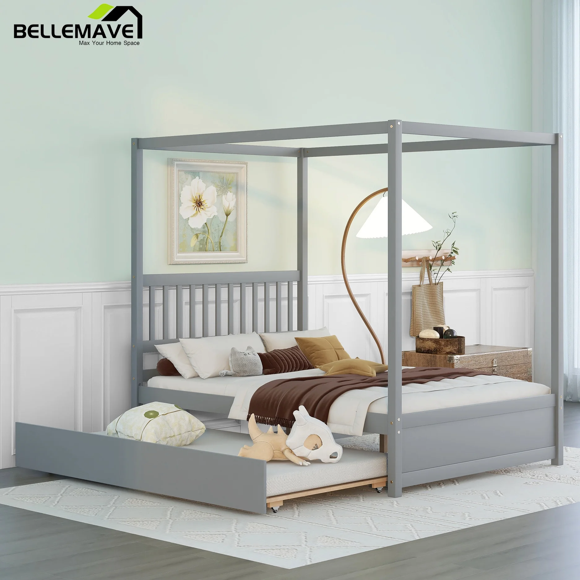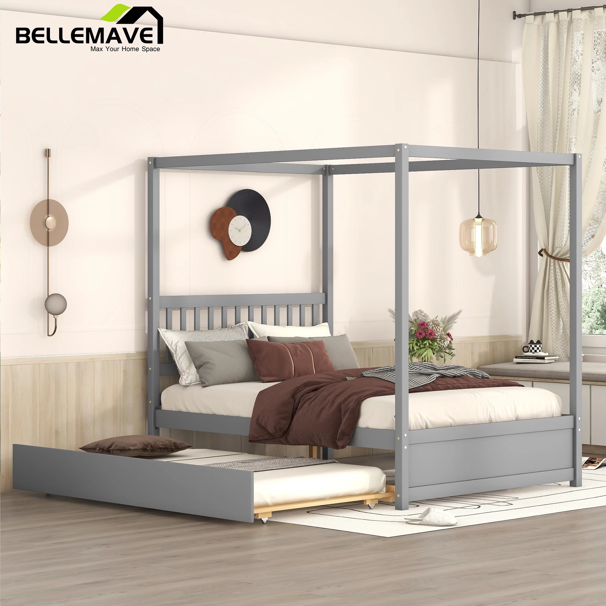Gewnee Wood Canopy Bed ,Full Size Platform Bed Frame with Trundle and Headboard,White