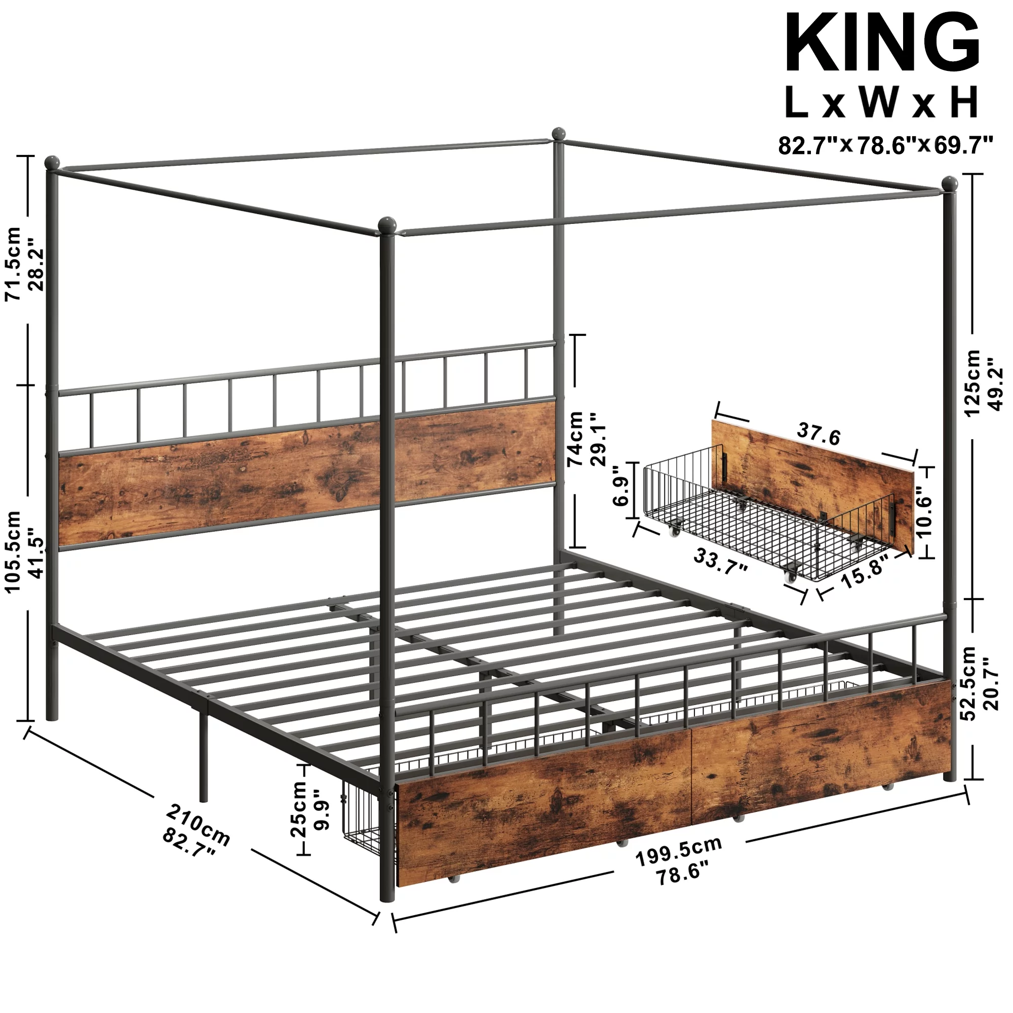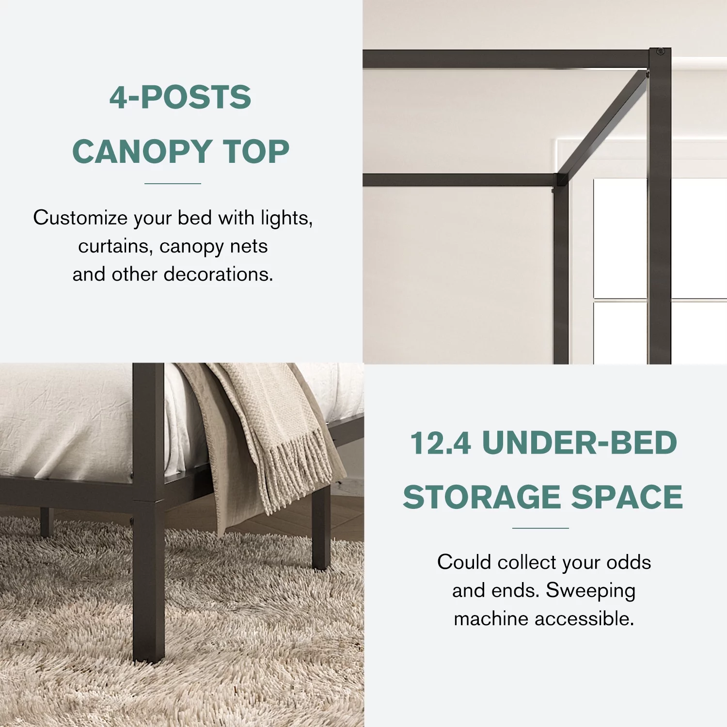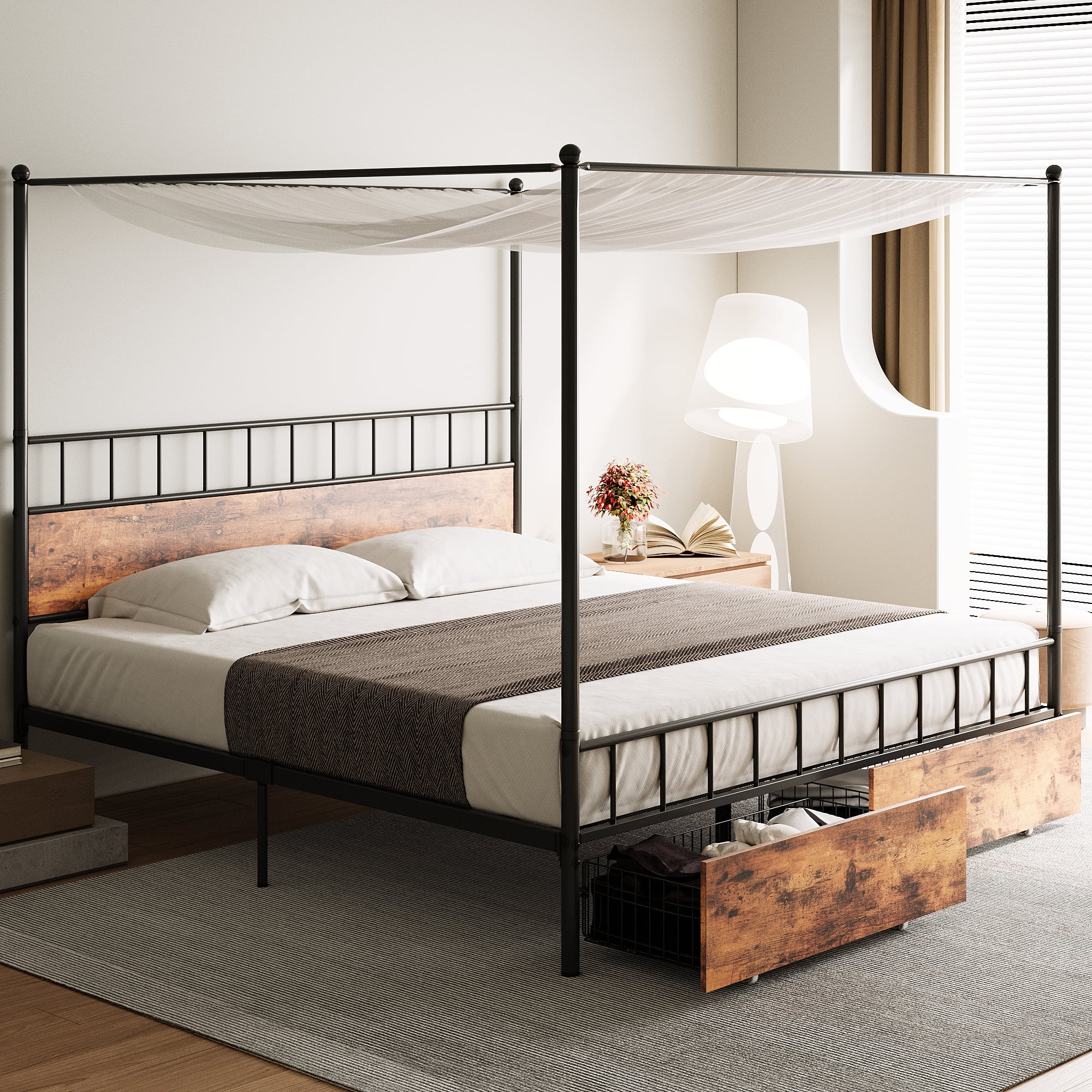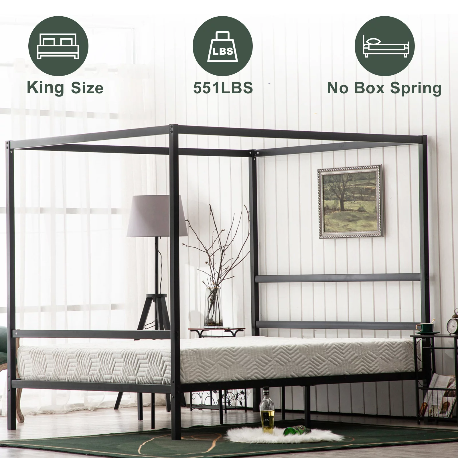 VINGLI Black Canopy Bed Frame King with Headboard, Four Poster Bed Frame King, Metal