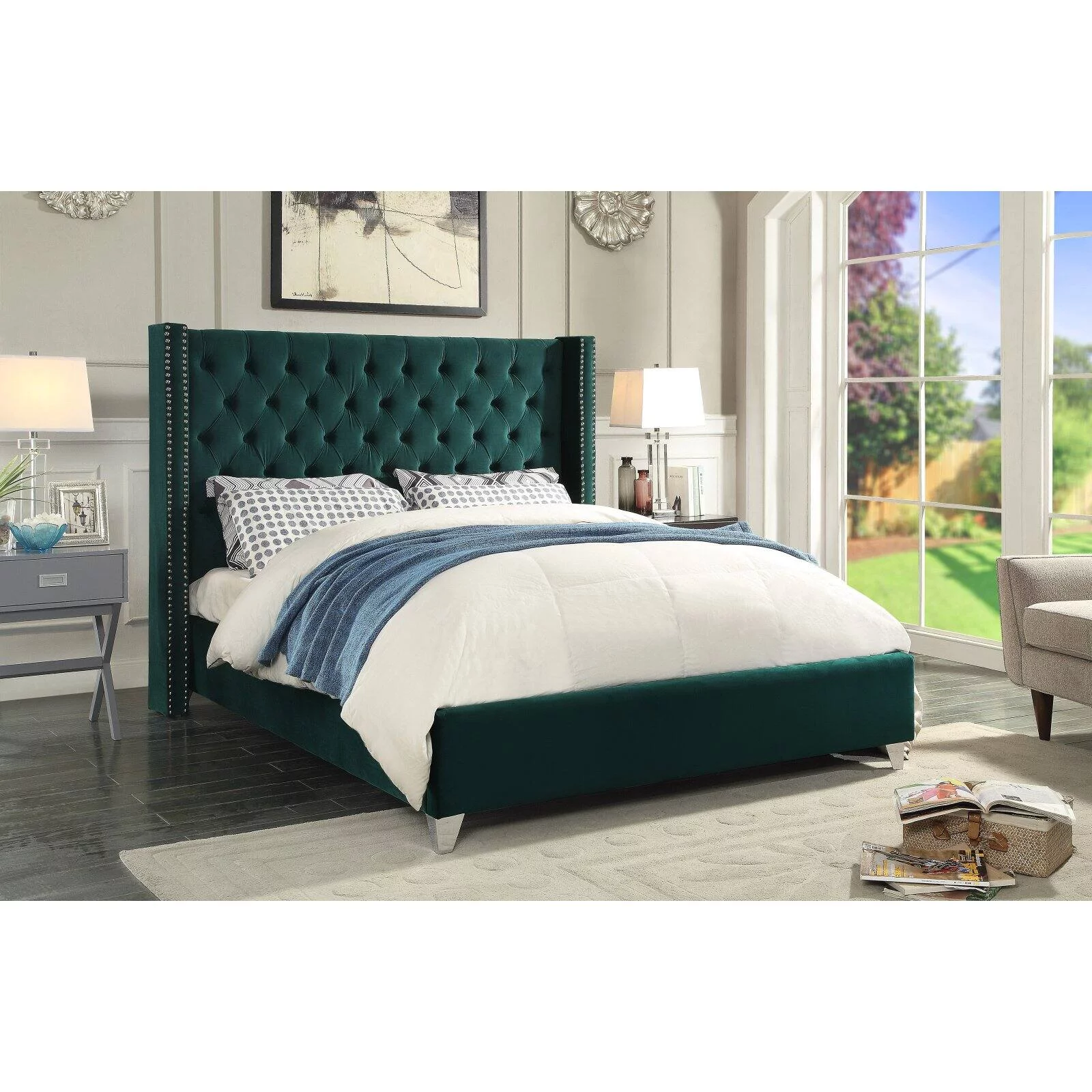 Meridian Furniture Aiden Solid Wood Tufted Velvet Wing Back Twin Bed in Pink