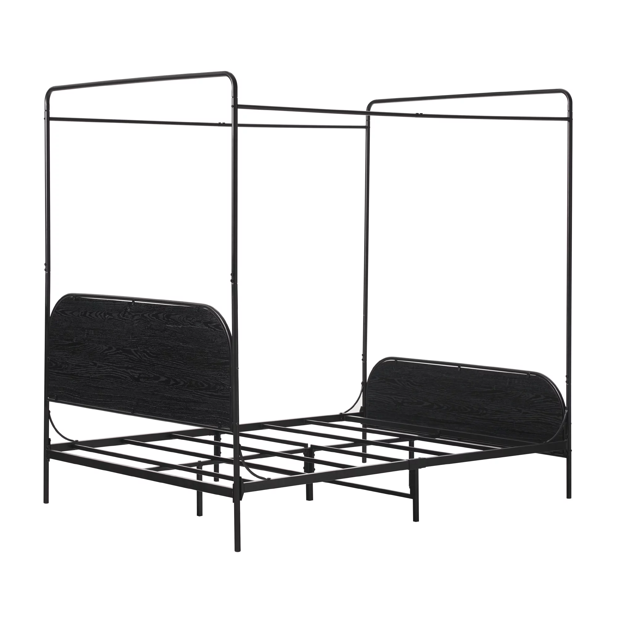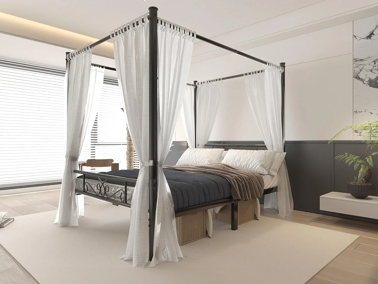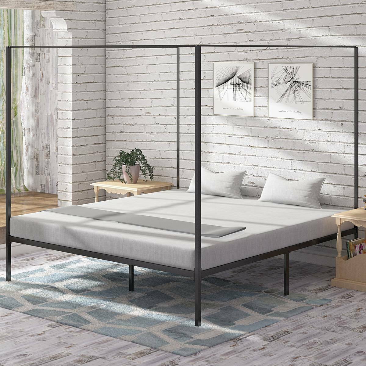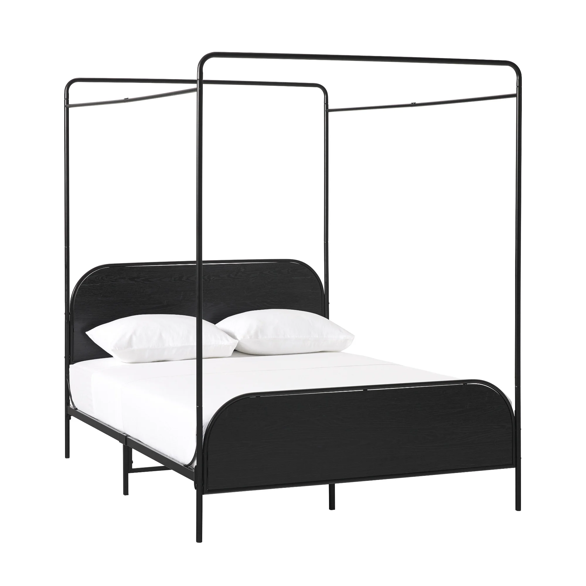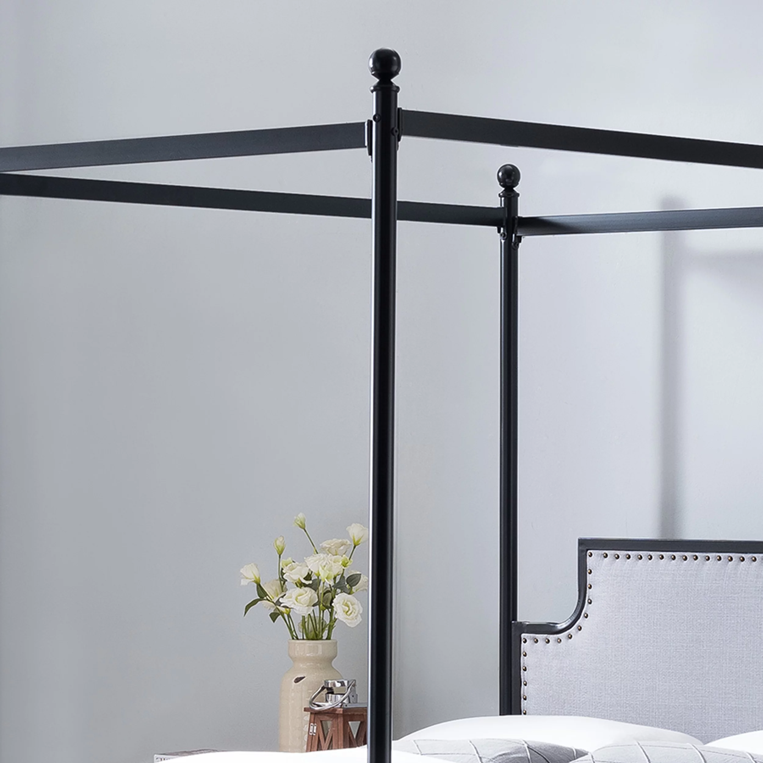 Kama Traditional Fabric Canopy Queen Bed with Iron Frame, Gray and Flat Black