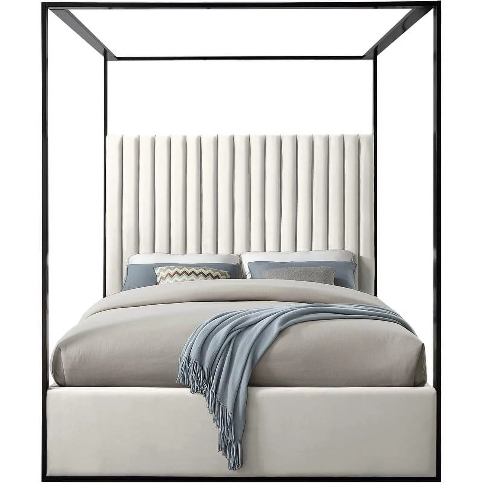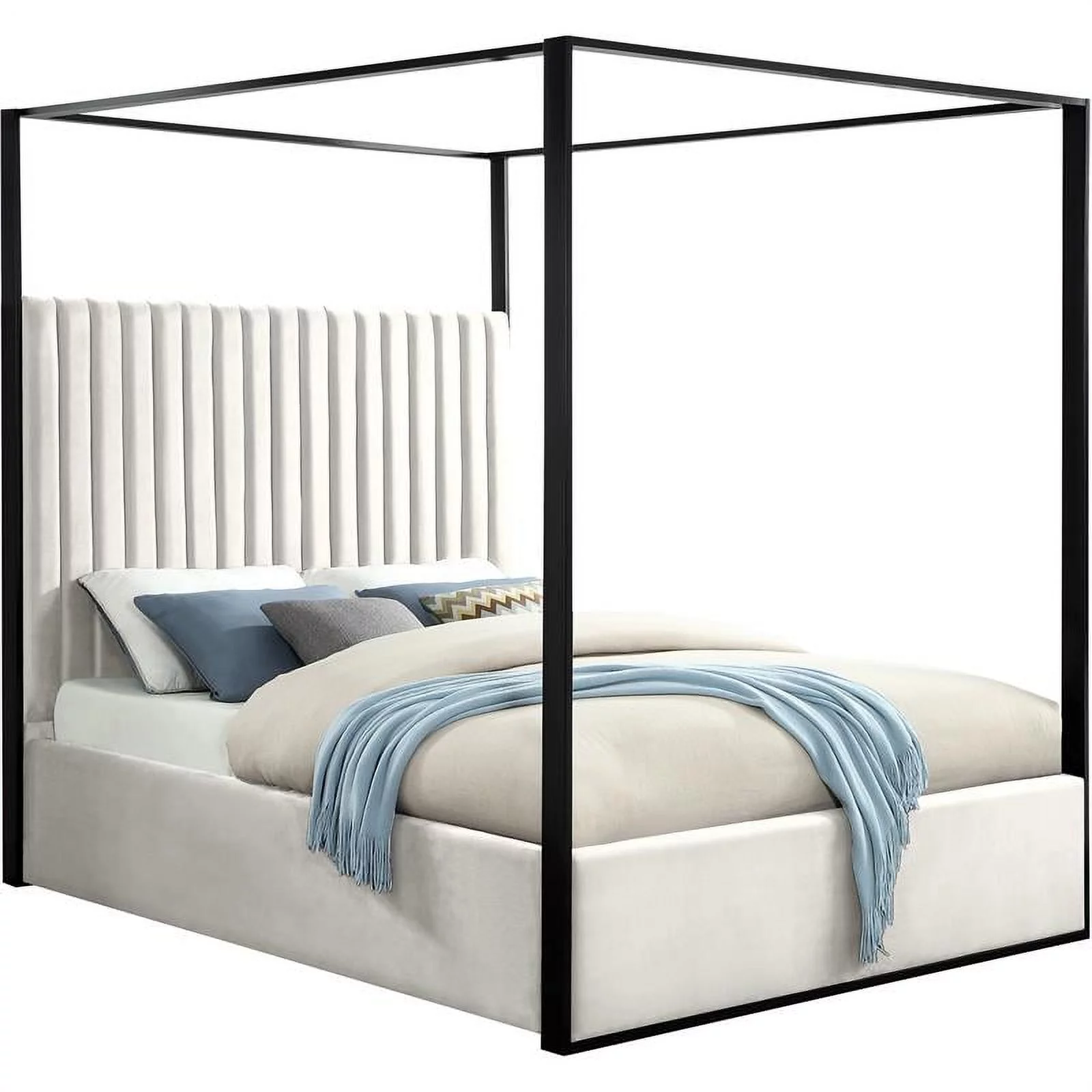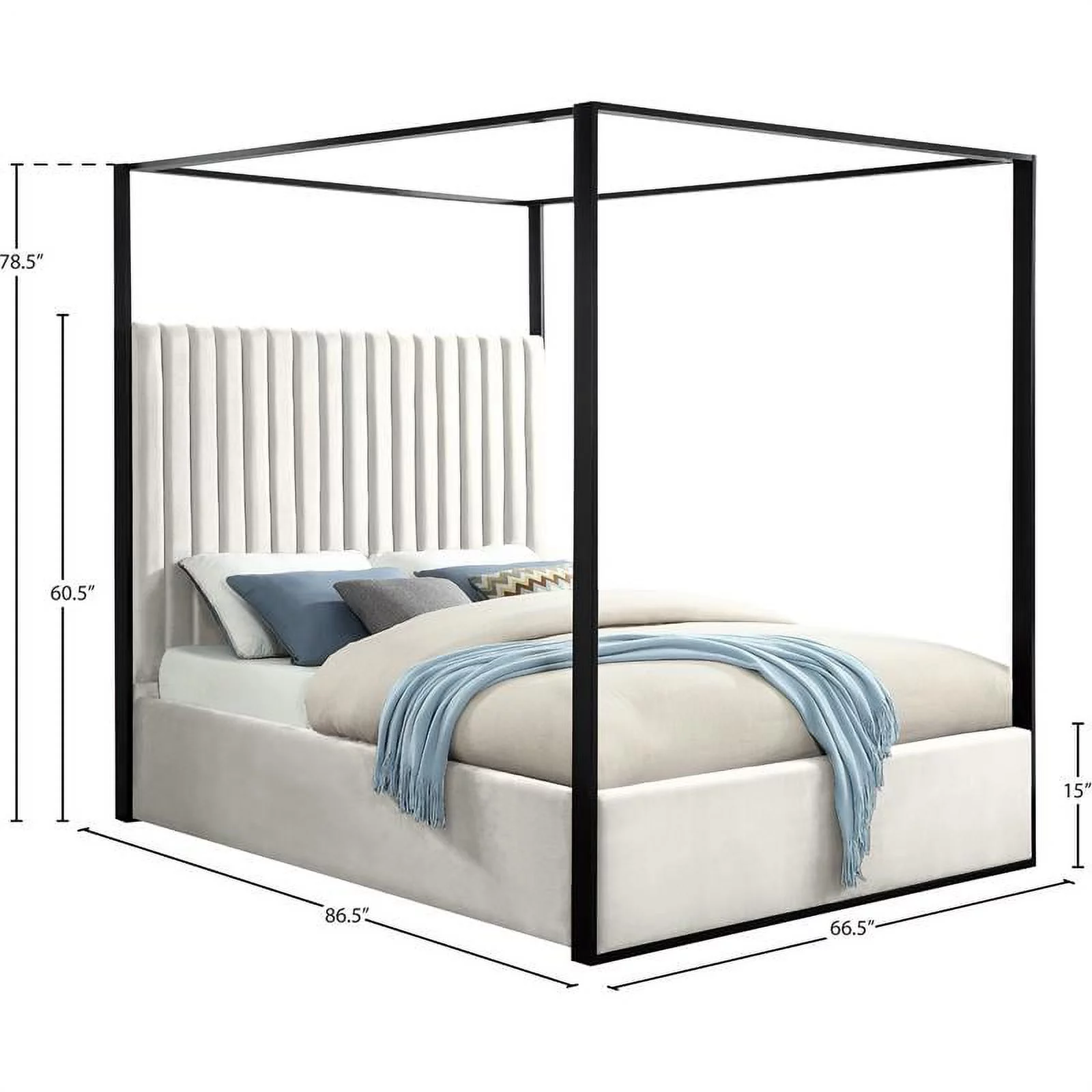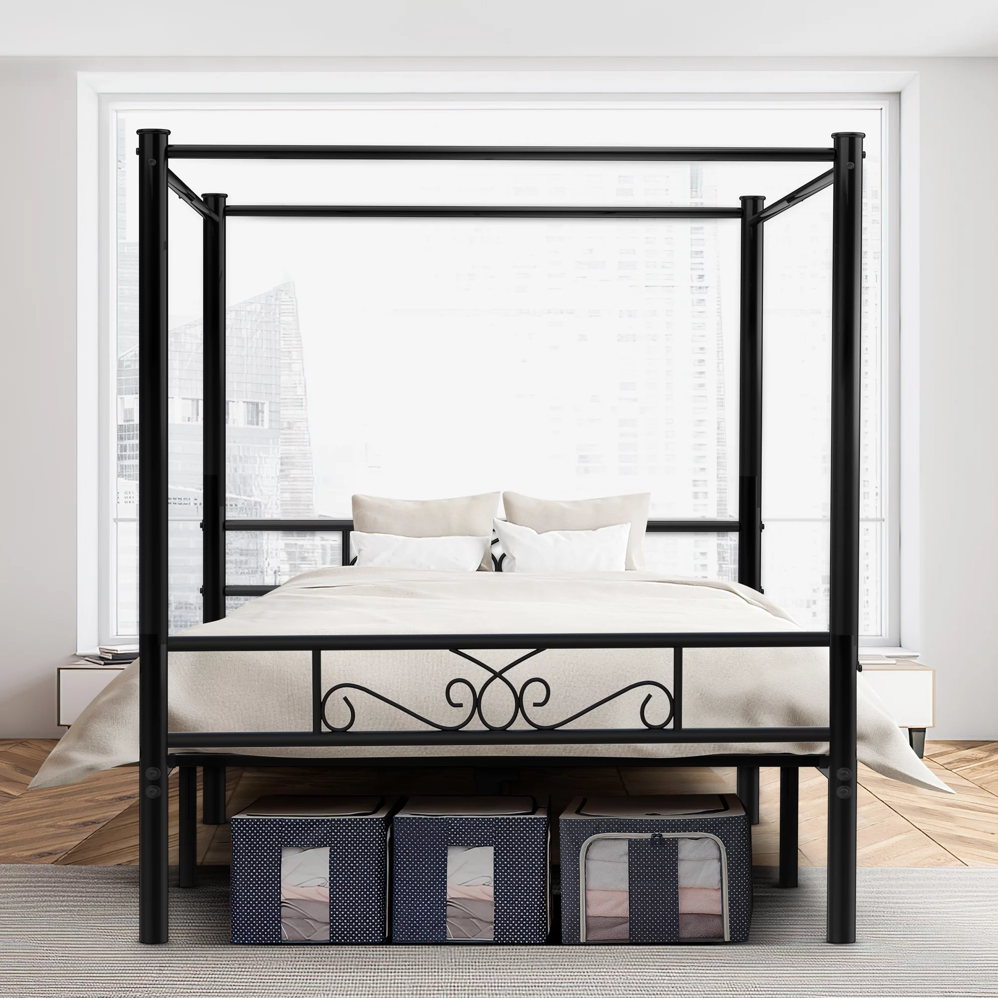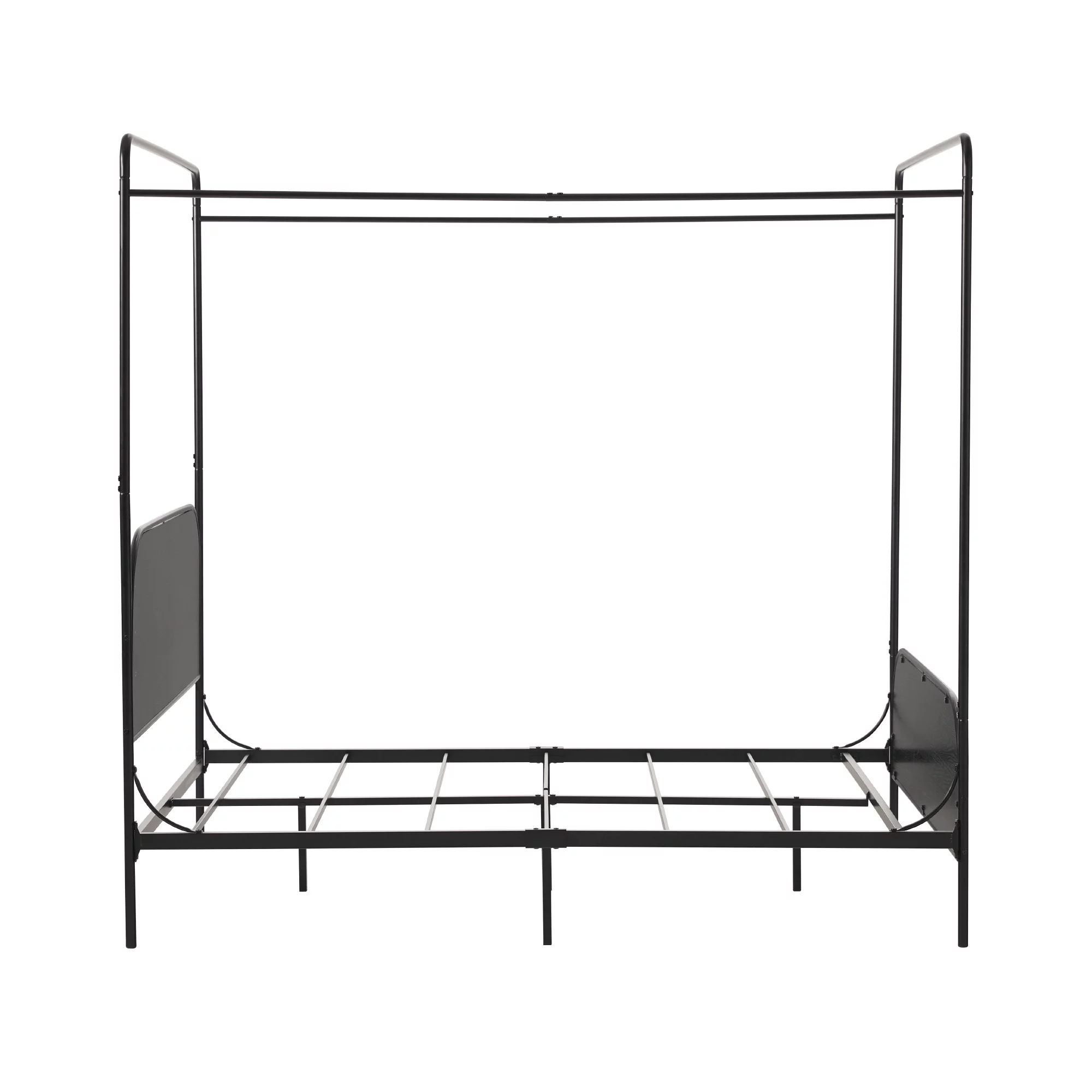 Kama Traditional Fabric Canopy Queen Bed with Iron Frame, Gray and Flat Black