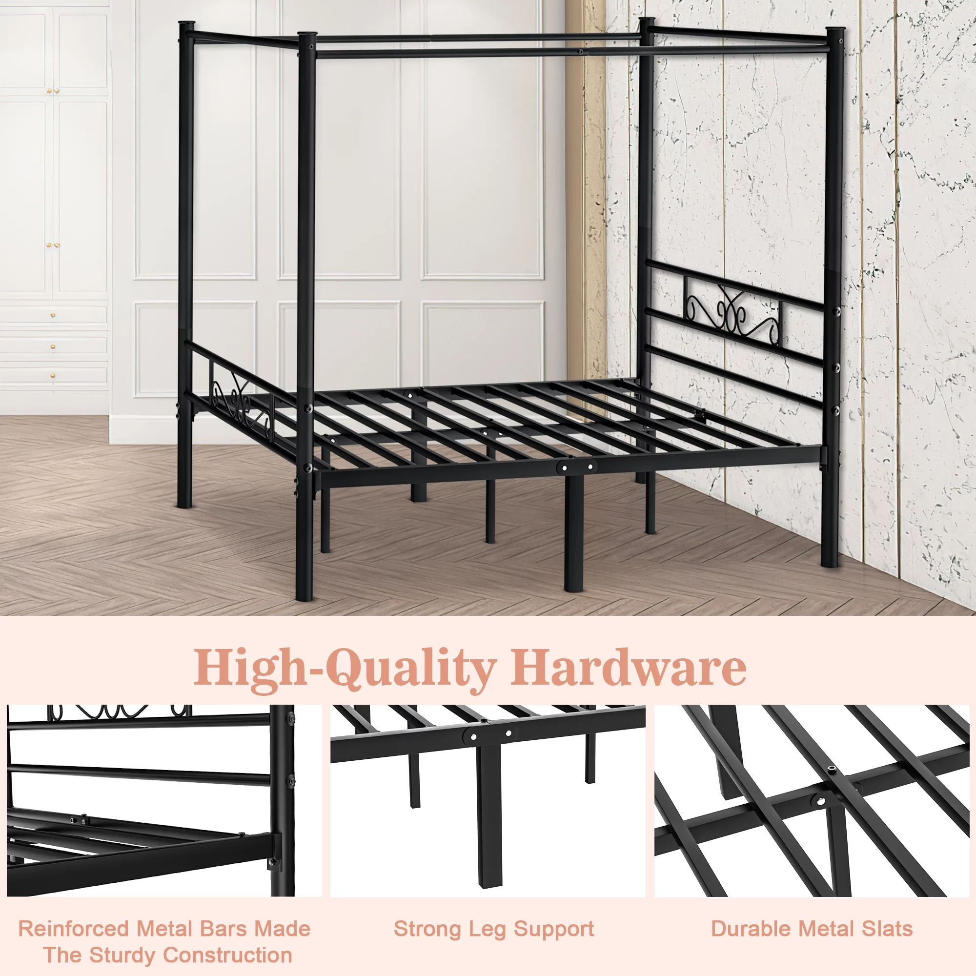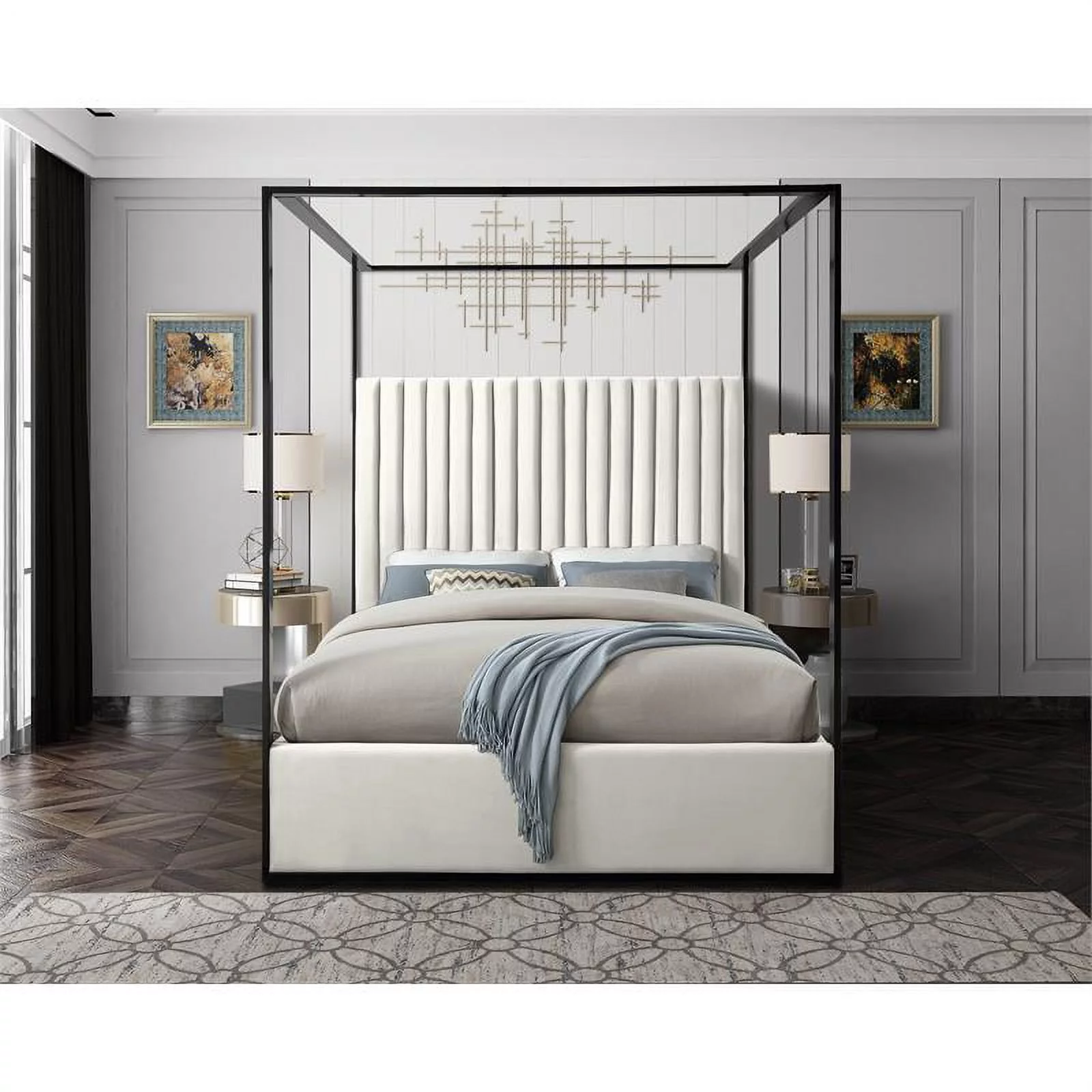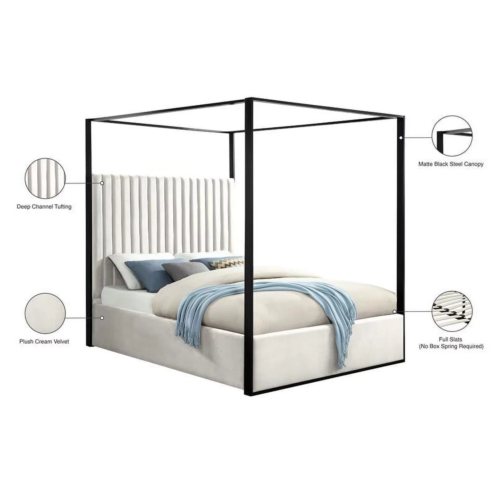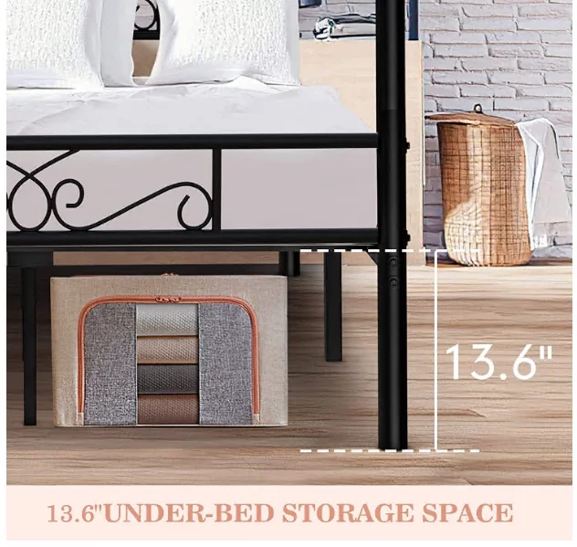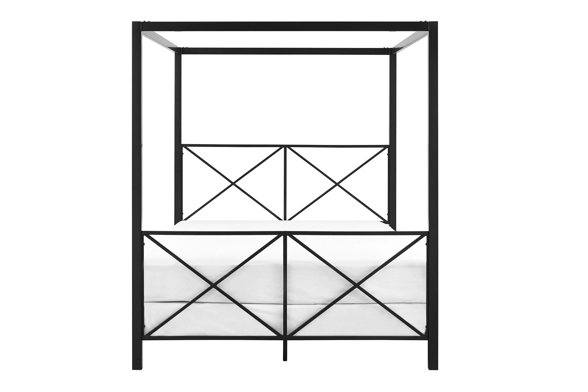 Kama Traditional Fabric Canopy Queen Bed with Iron Frame, Gray and Flat Black