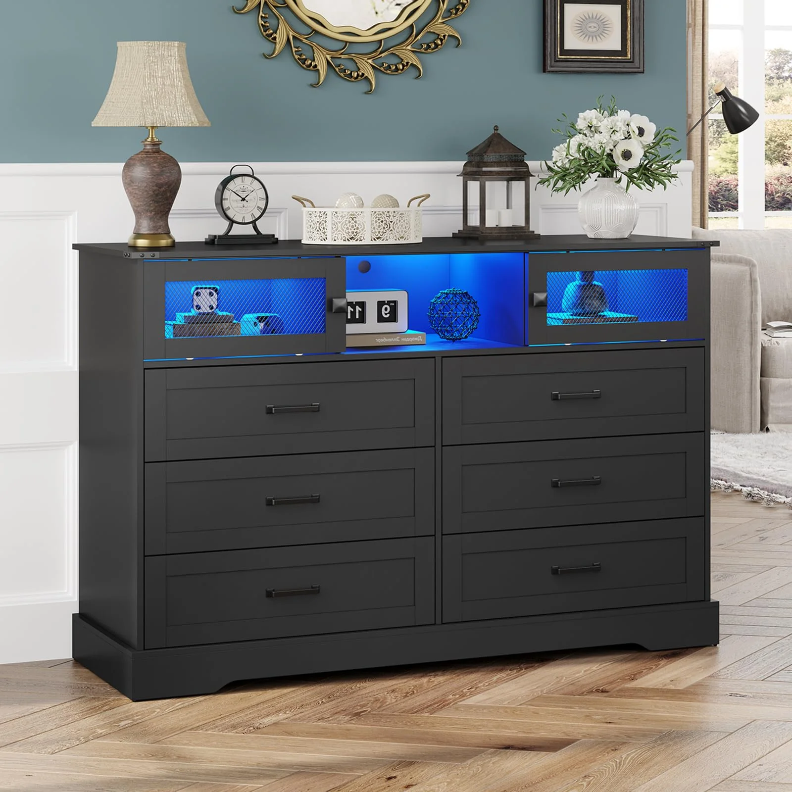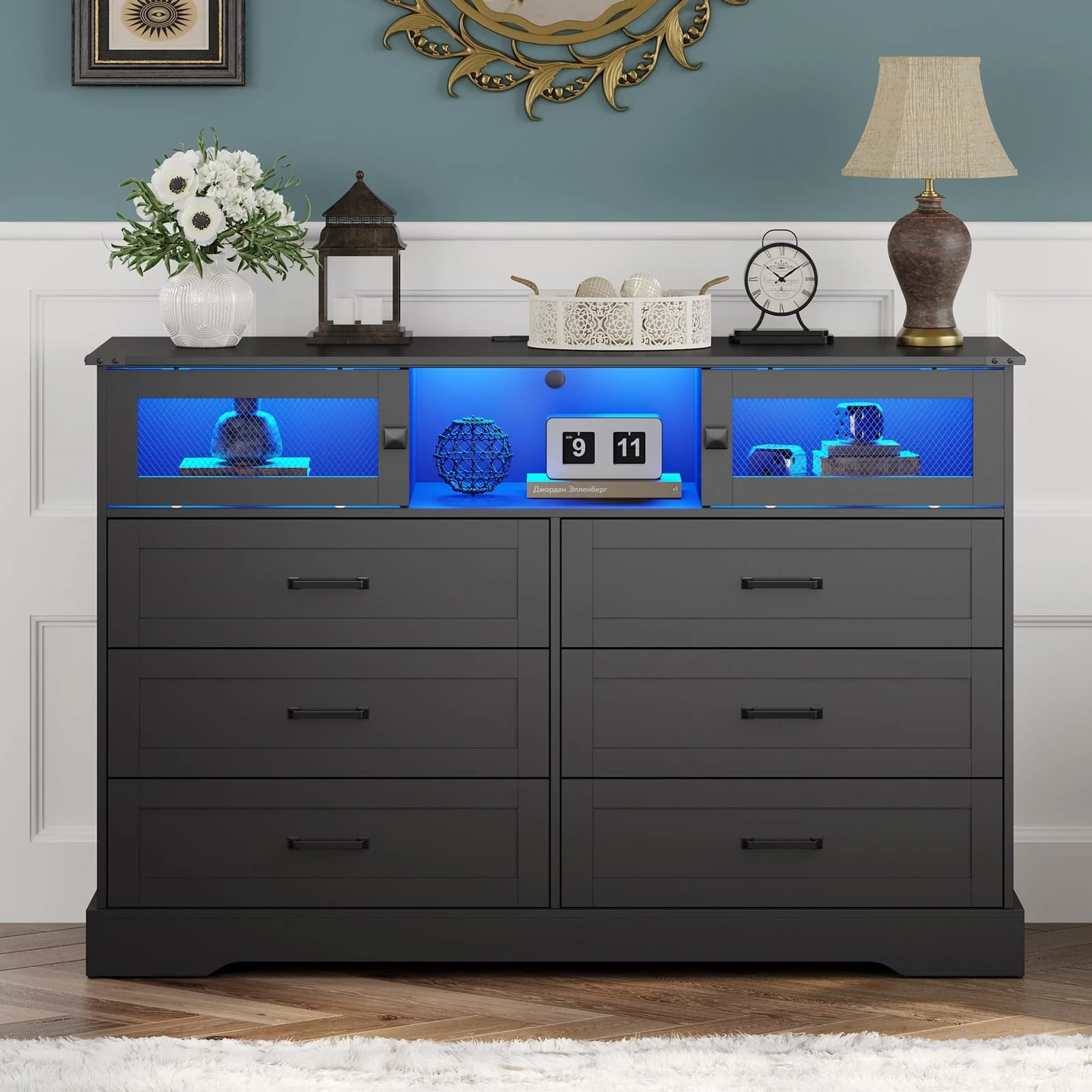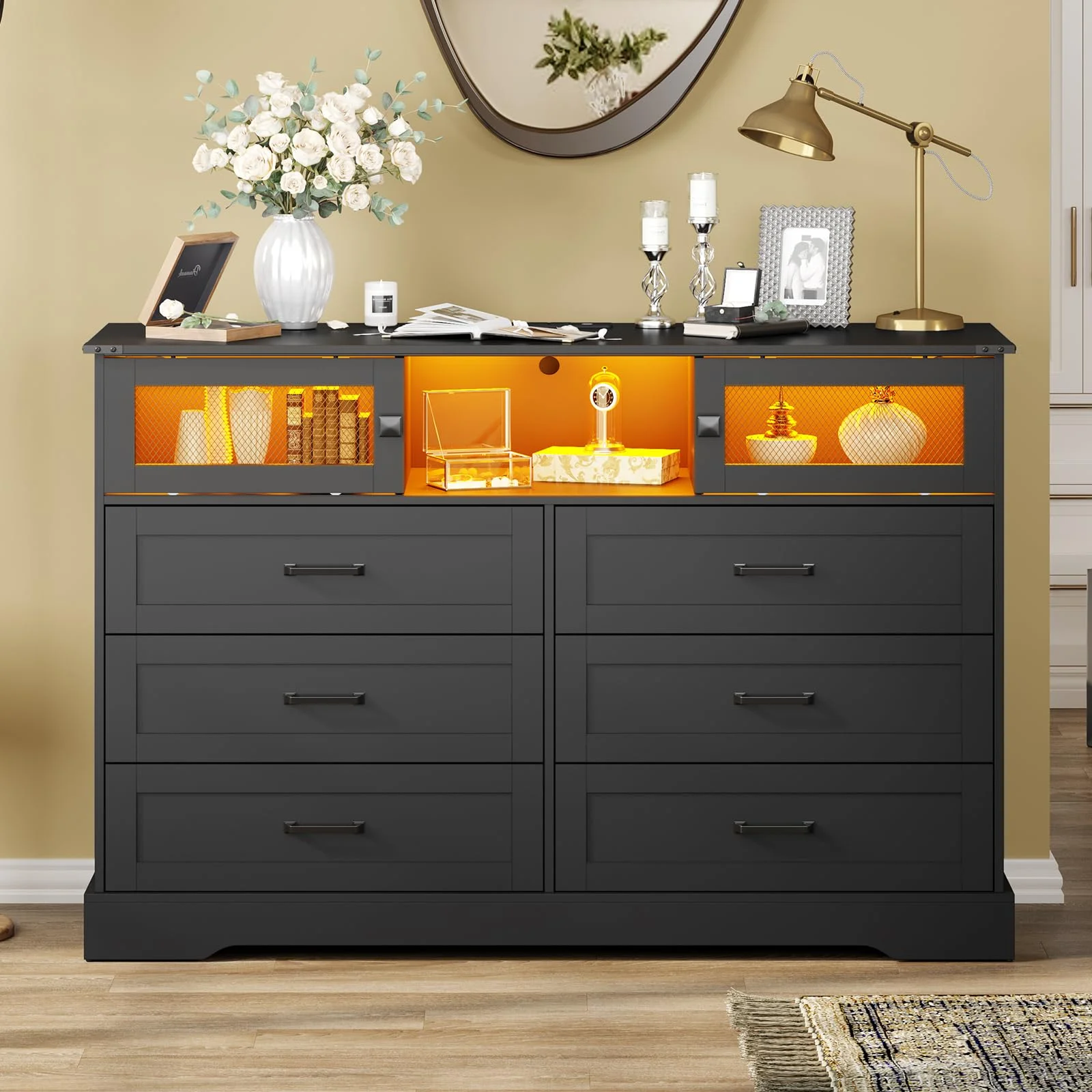 Weiplehoom 6 Drawers Dresser with LED Lights and Charging Station, Black