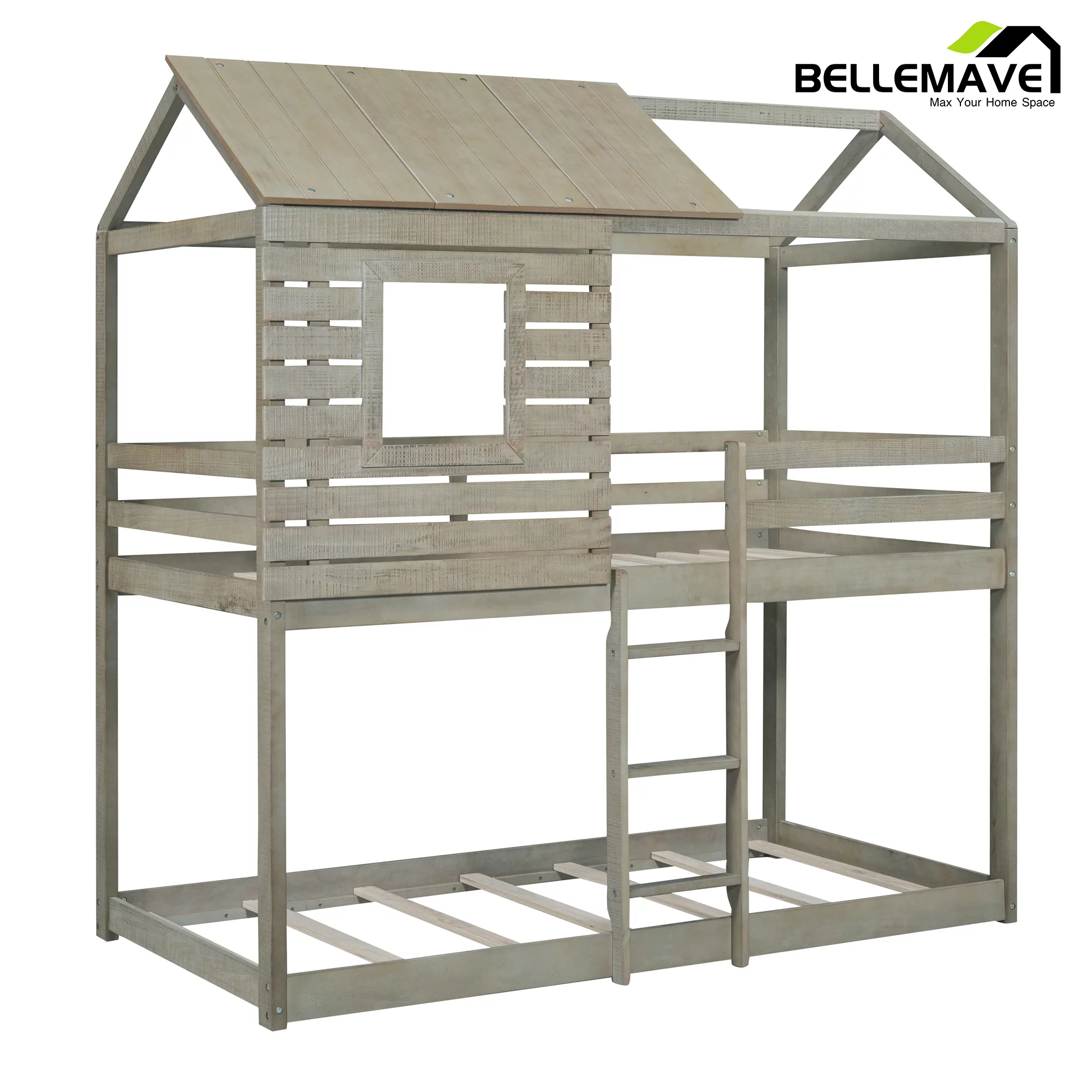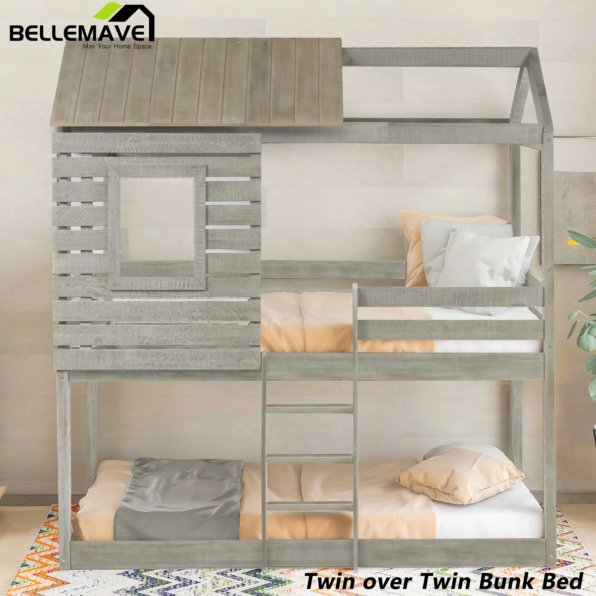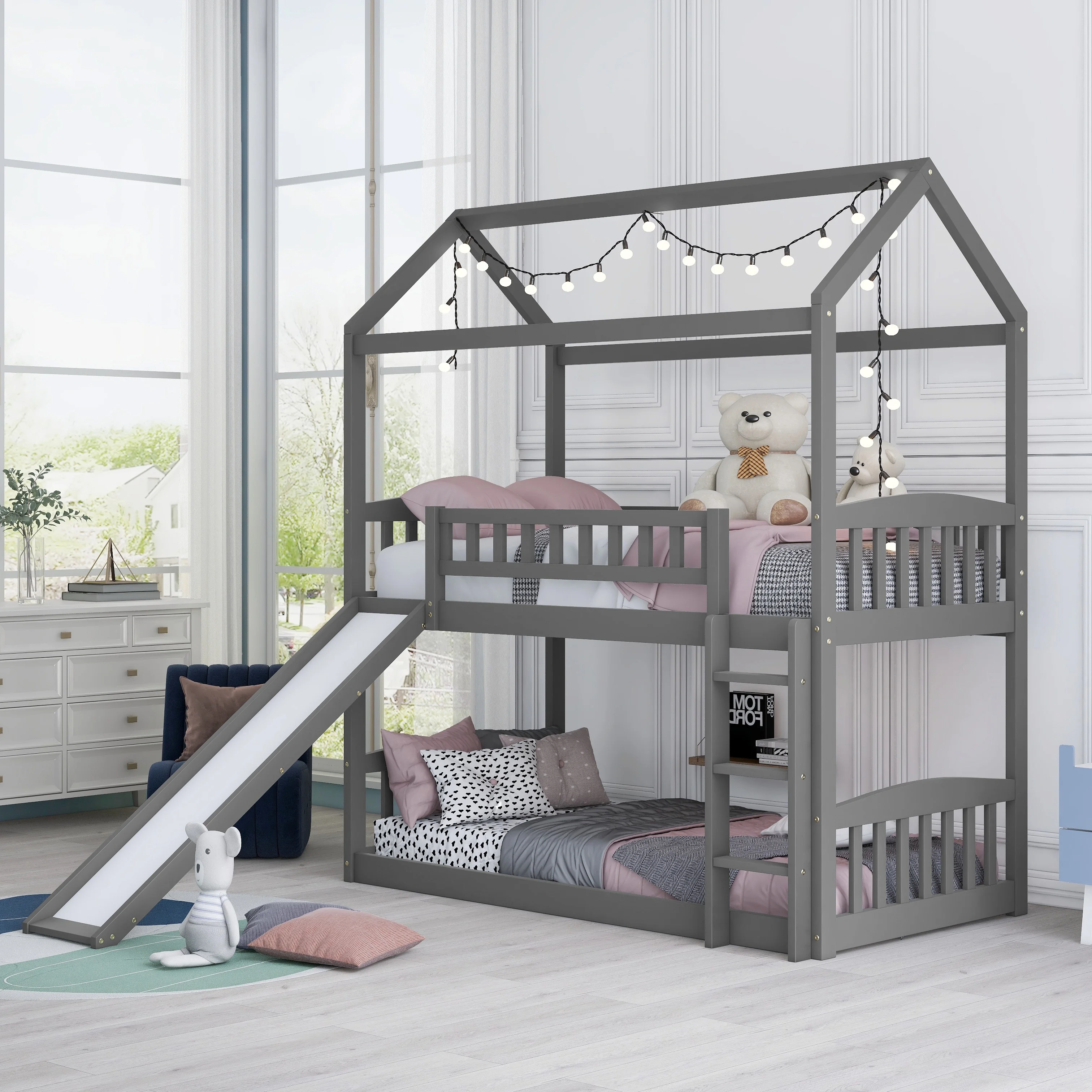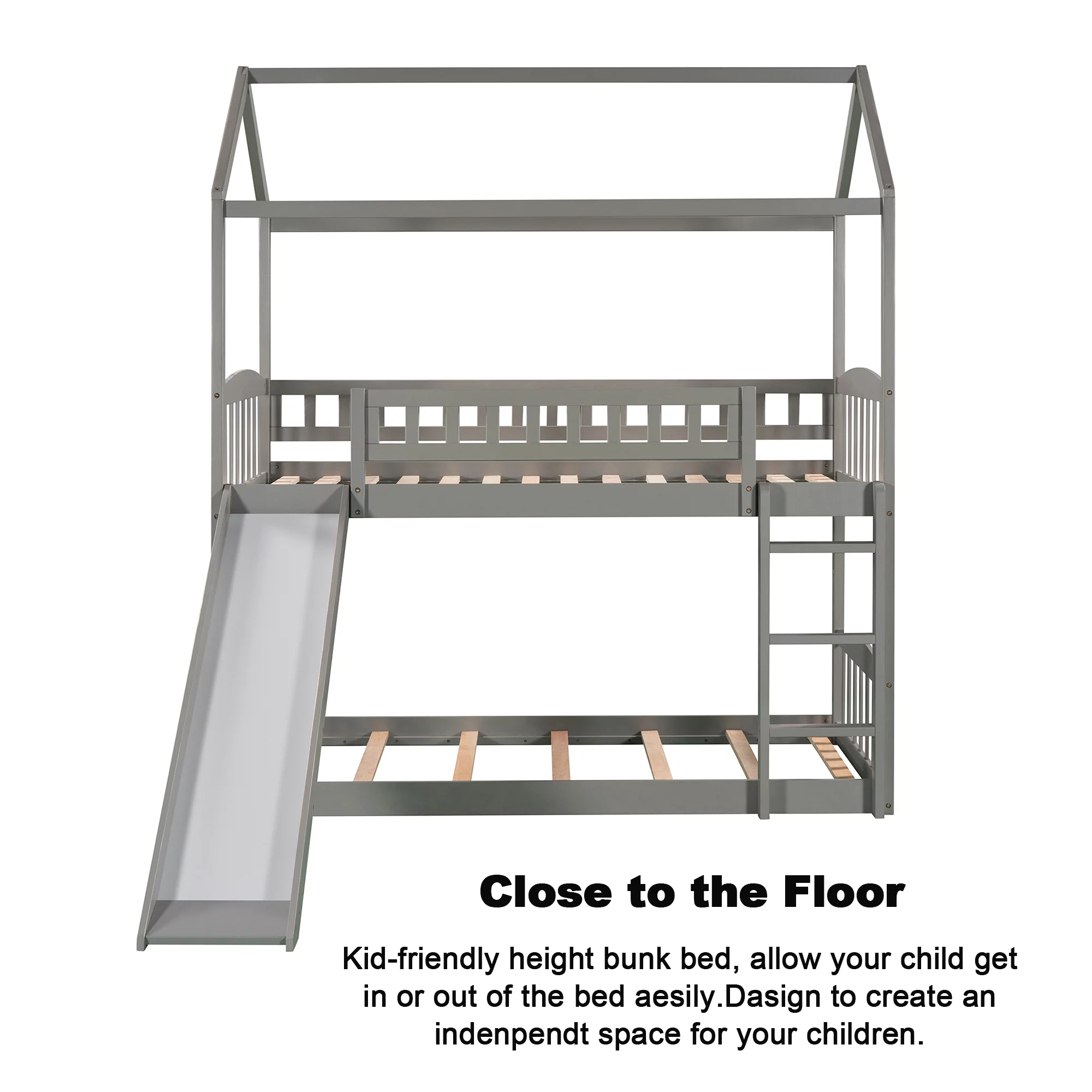 Bellemave Bunk Bed with Slide, Wood Twin Over Twin House Bed Frame with Ladder for Kids Teens(Gray)