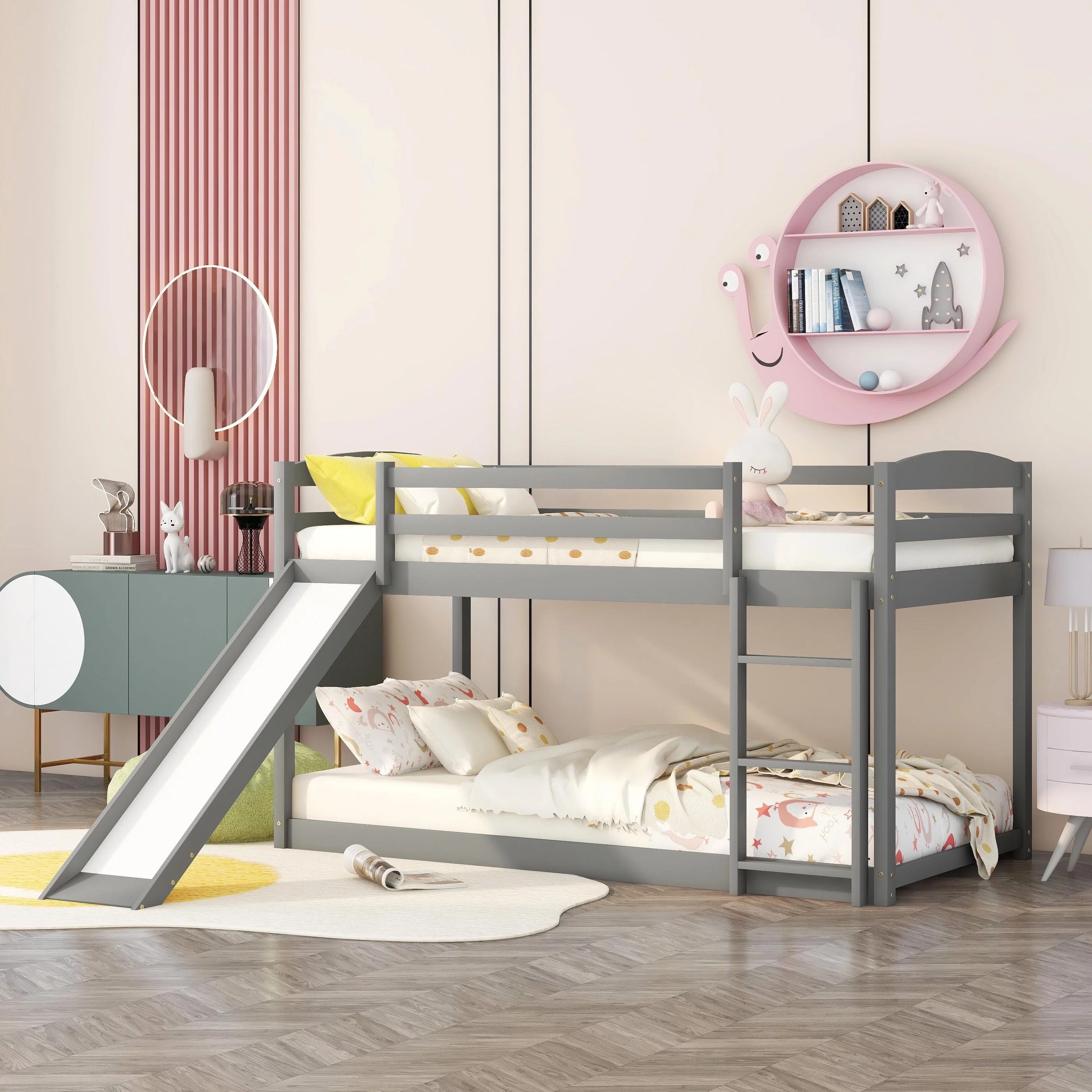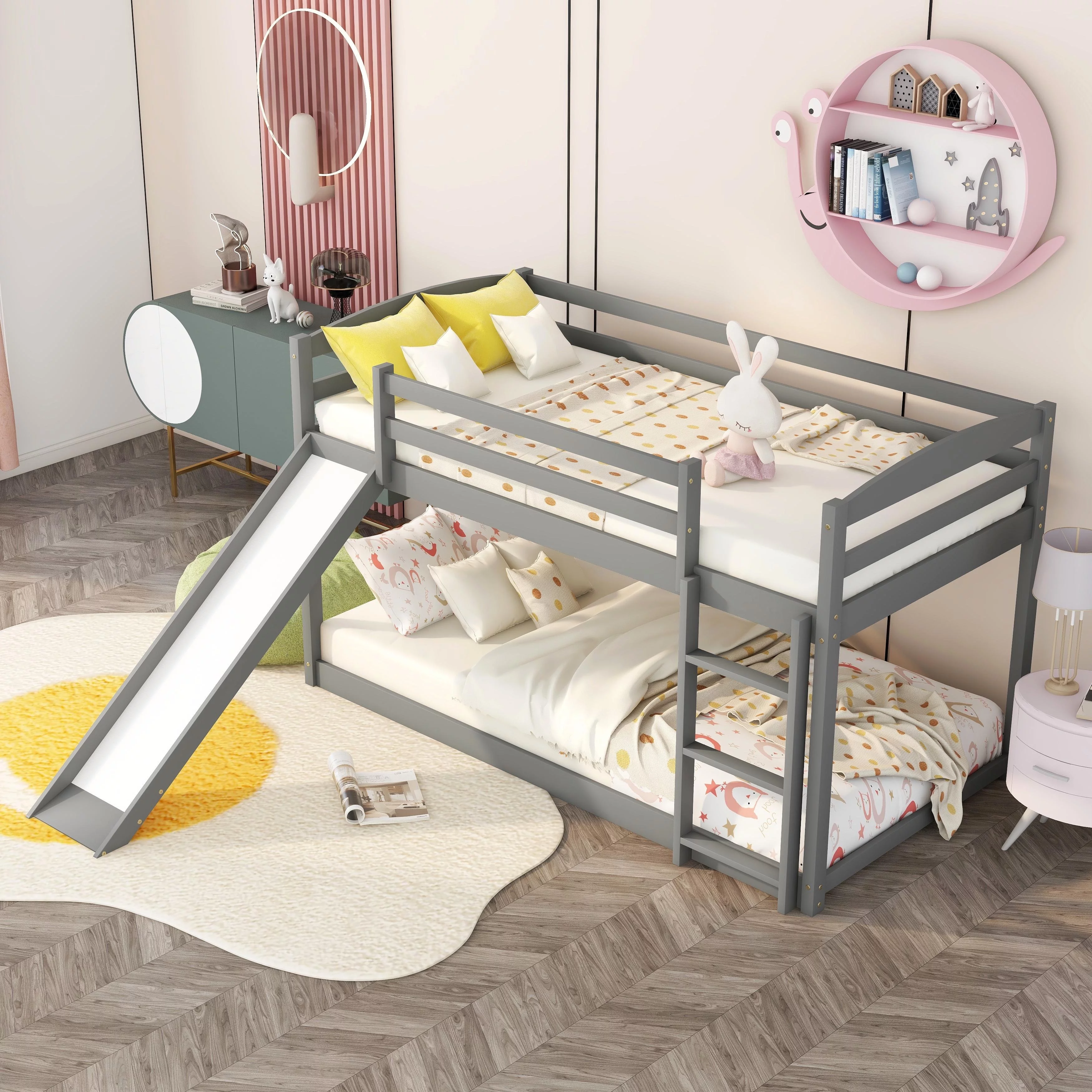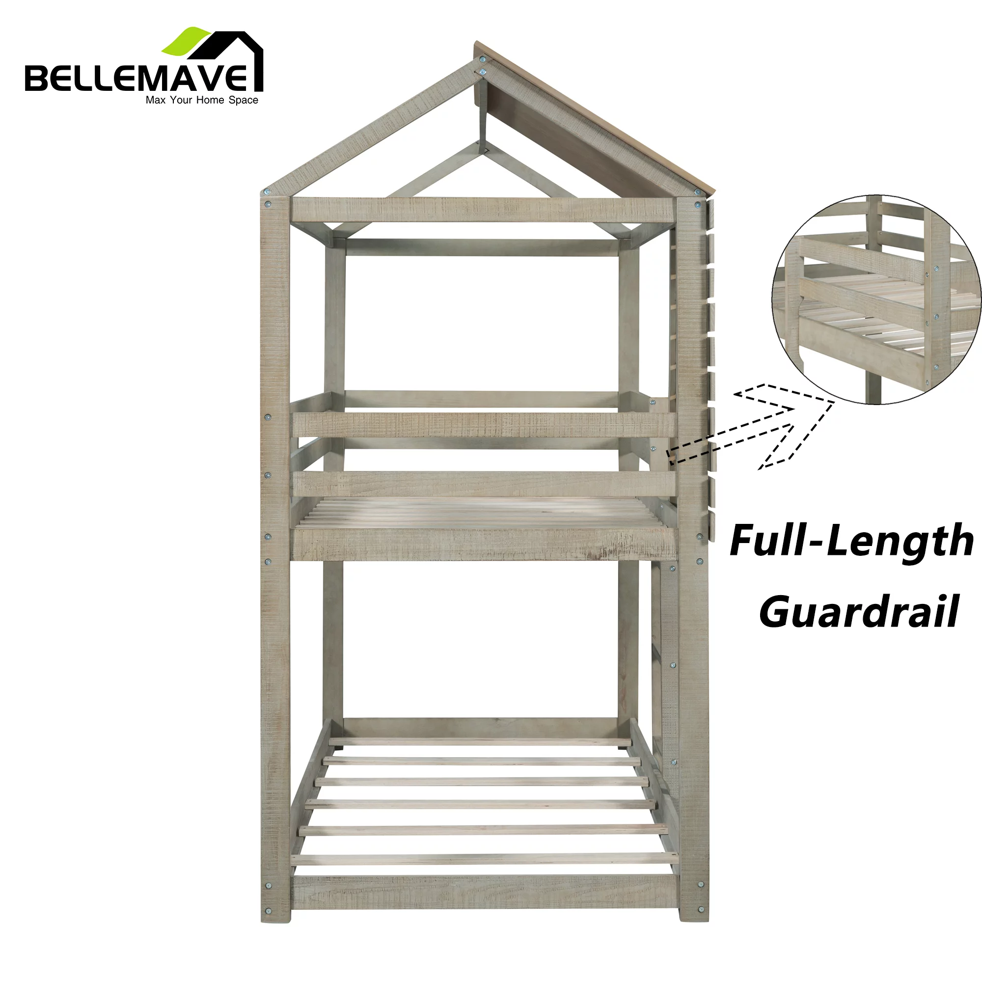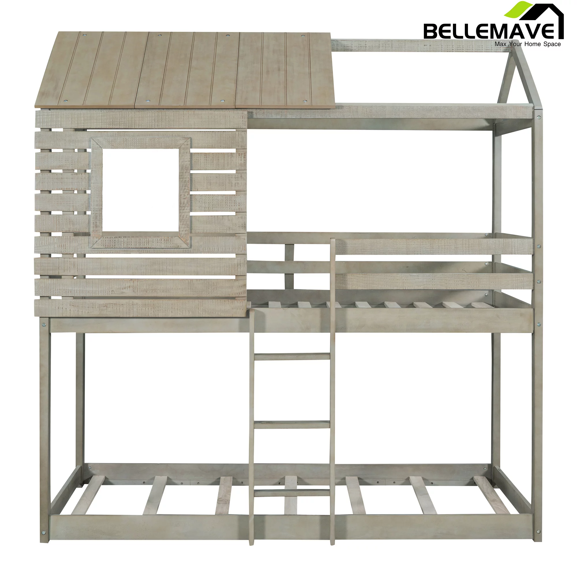 Bellemave Bunk Bed with Slide, Wood Twin Over Twin House Bed Frame with Ladder for Kids Teens(Gray)