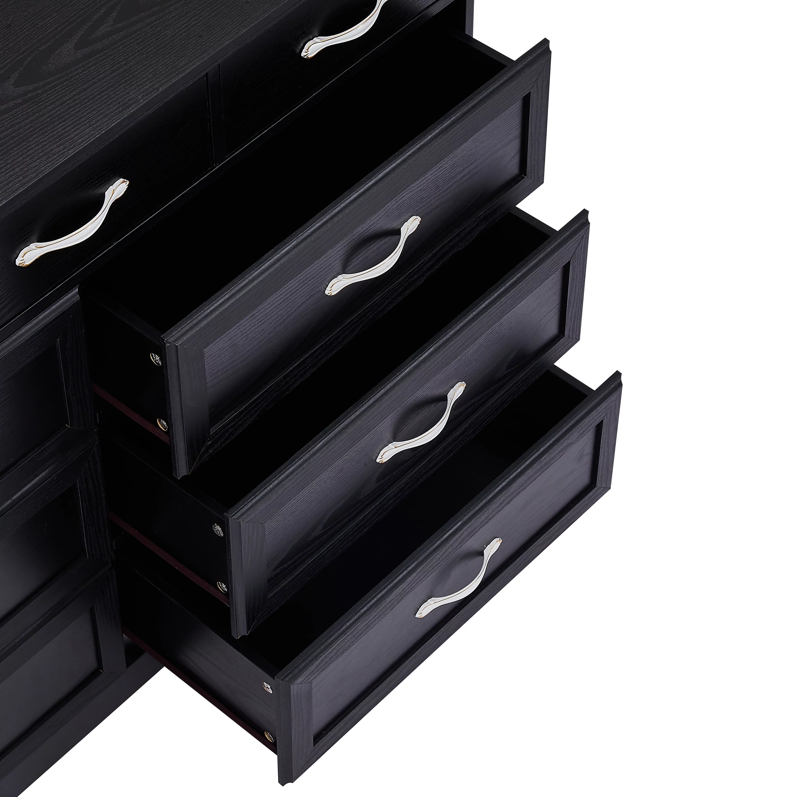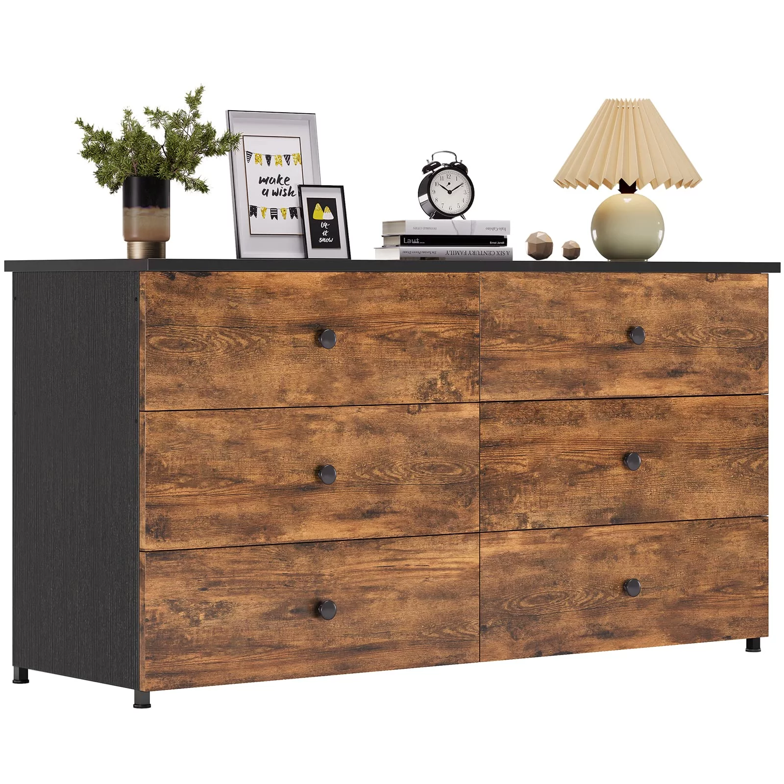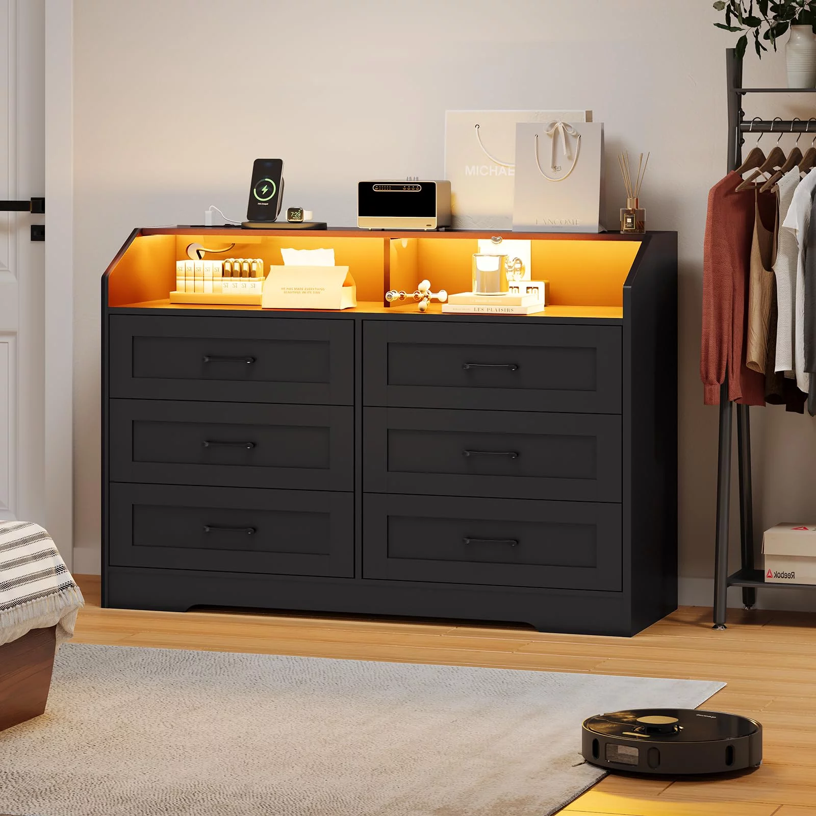 Black 6 Drawer Dresser for Bedroom Large Double Dresser with Wide Drawers and Gold Handles Chest of Drawers