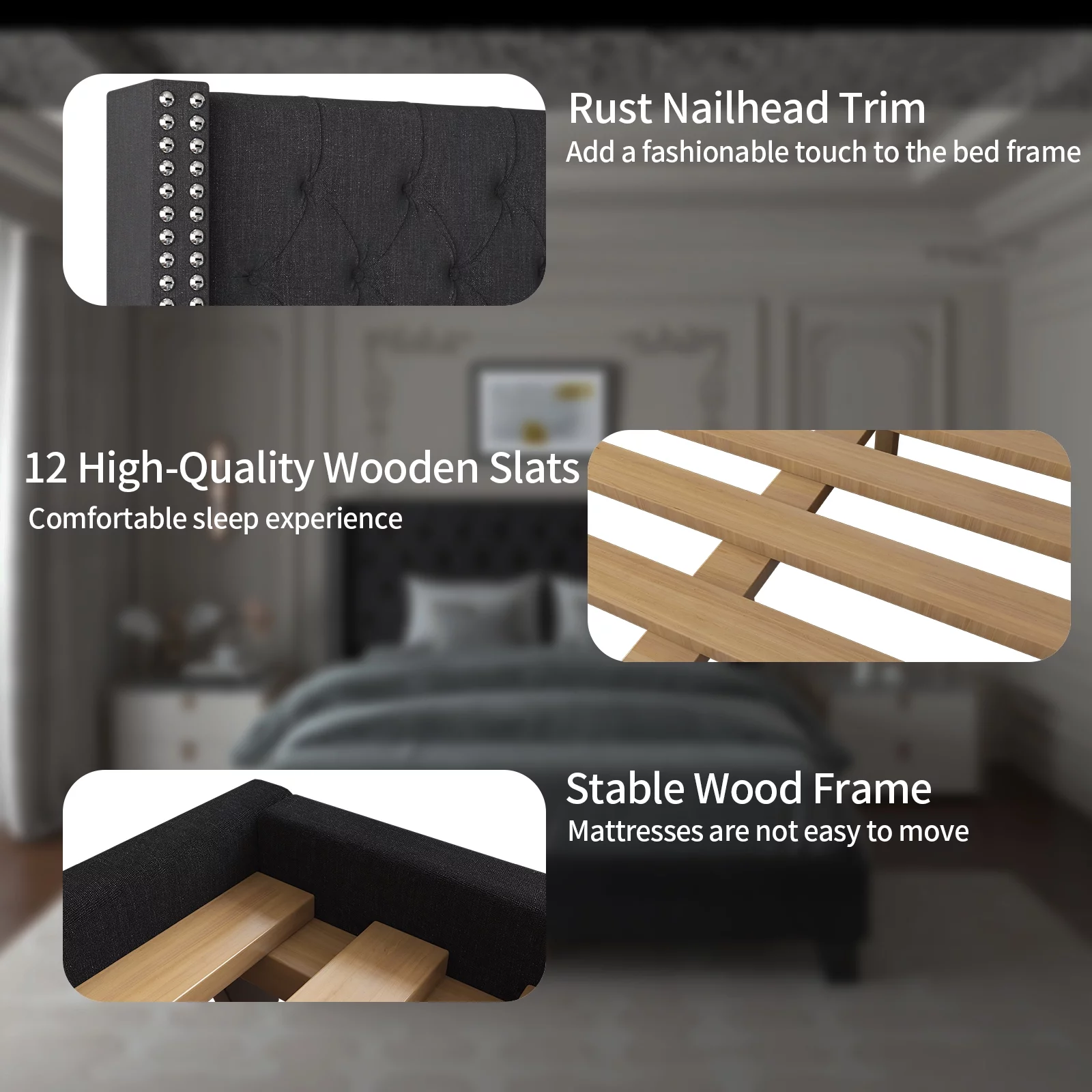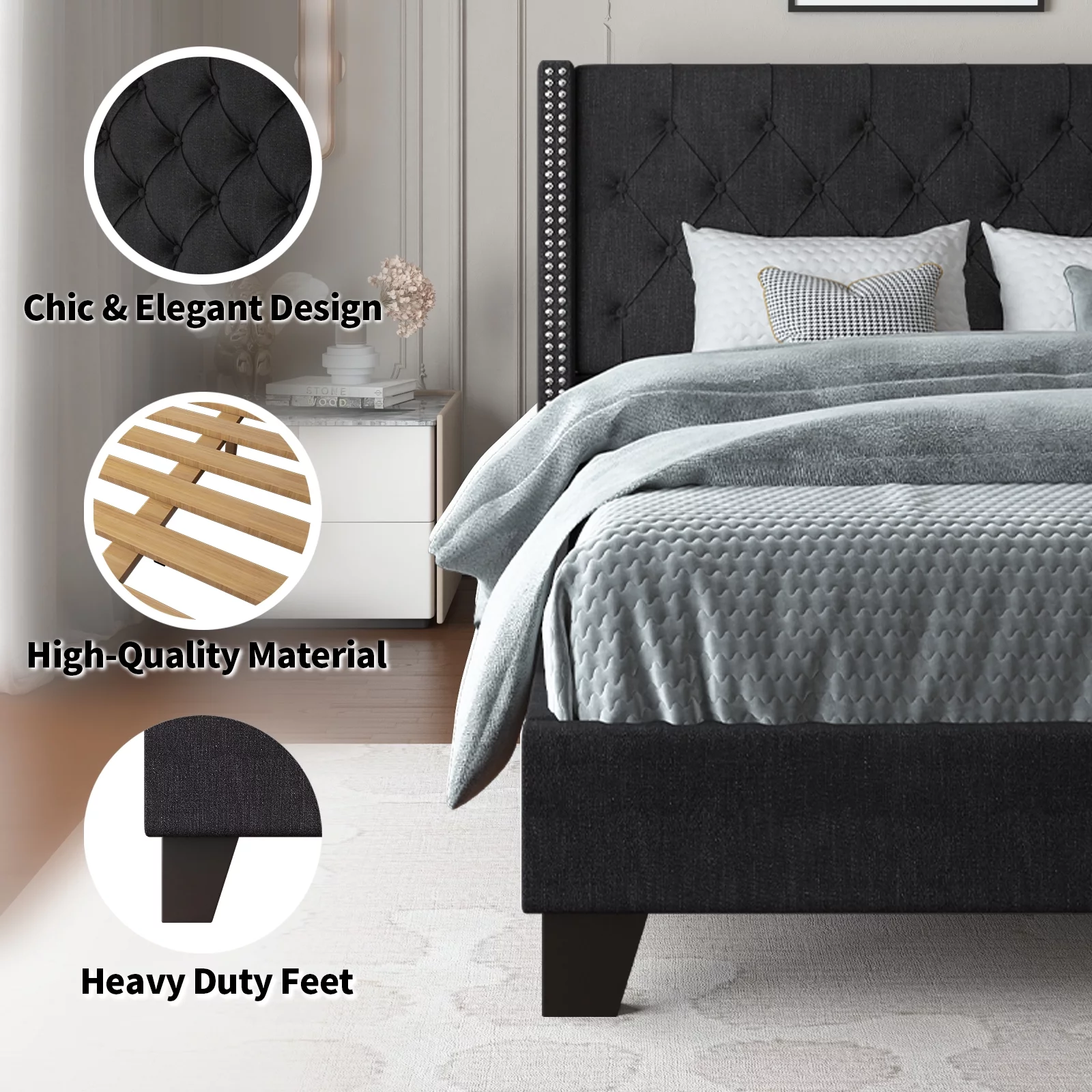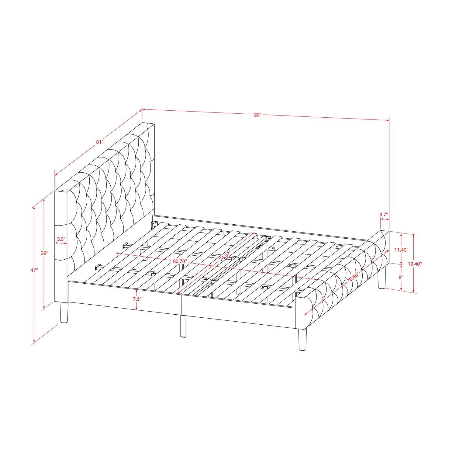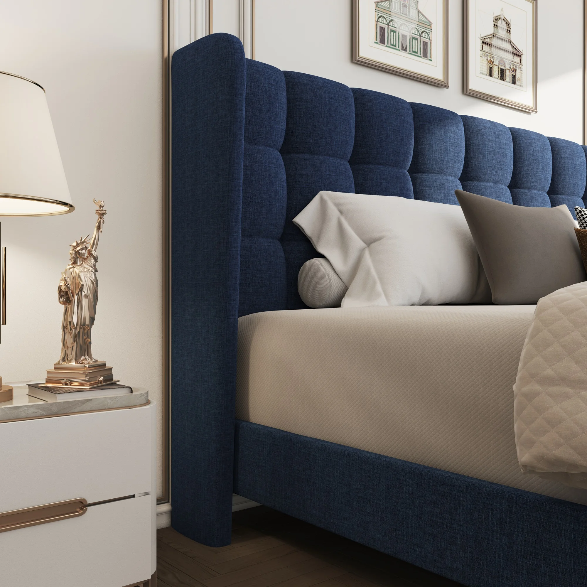 Sha Cerlin Blue King Size Platform Bed Frame with Tufted Headboard & Wingback, Adult