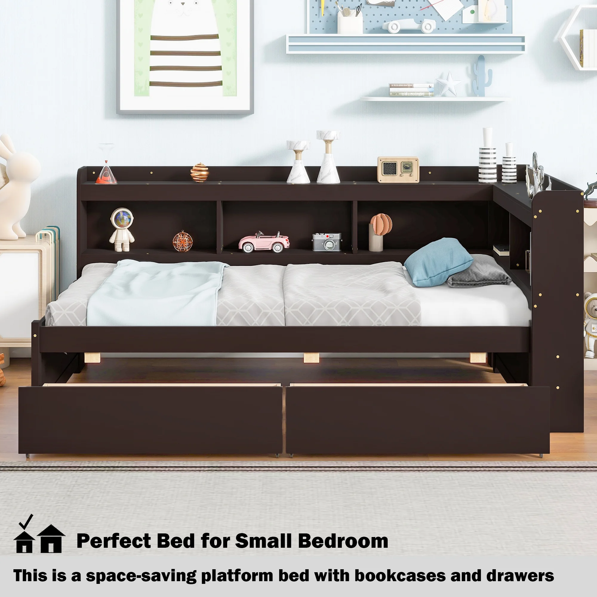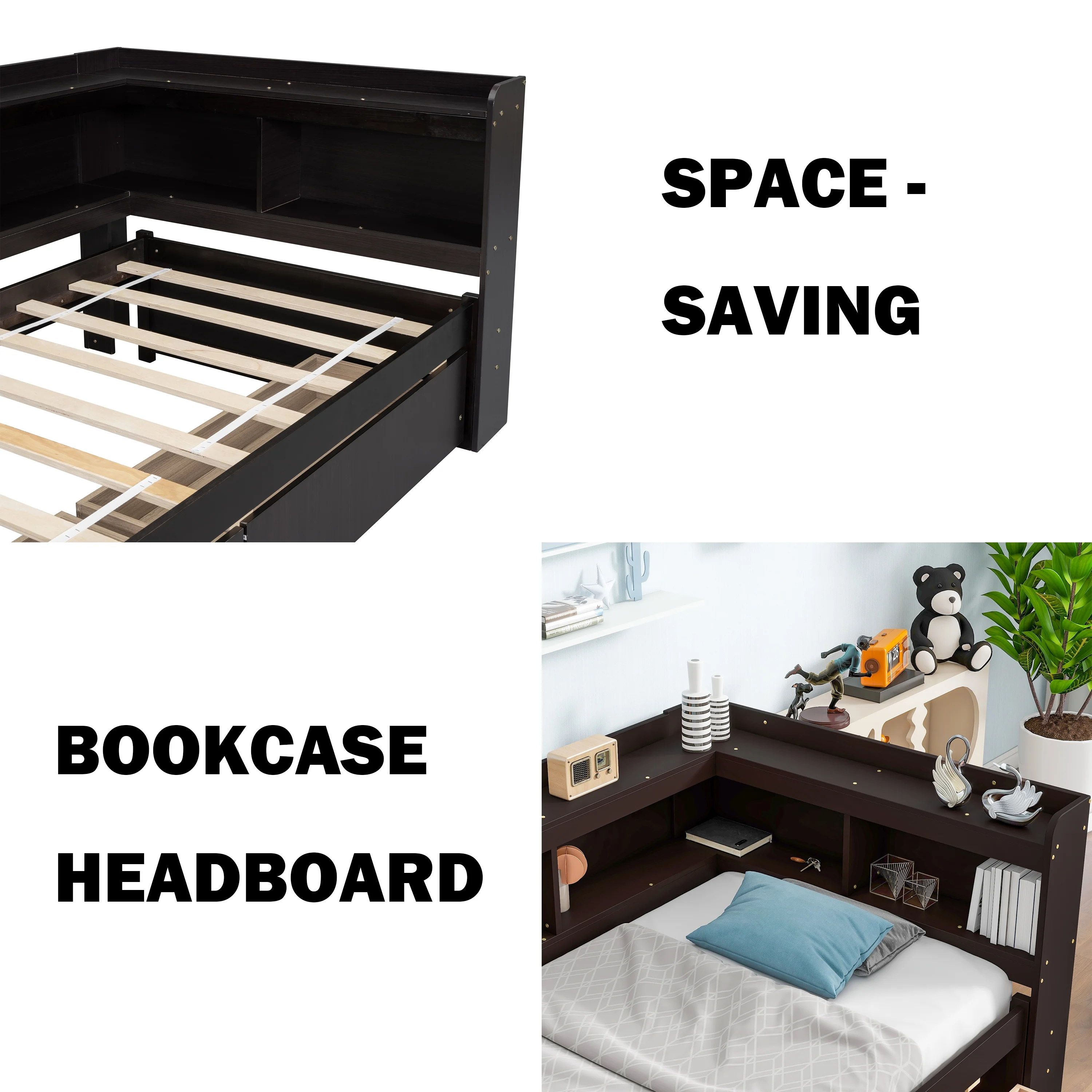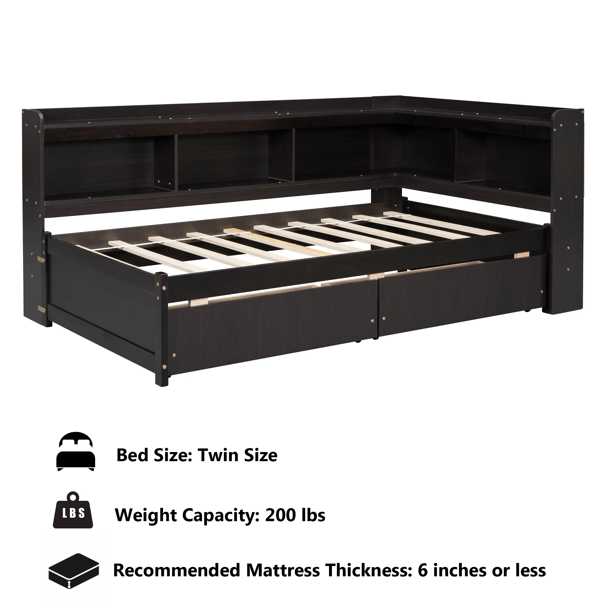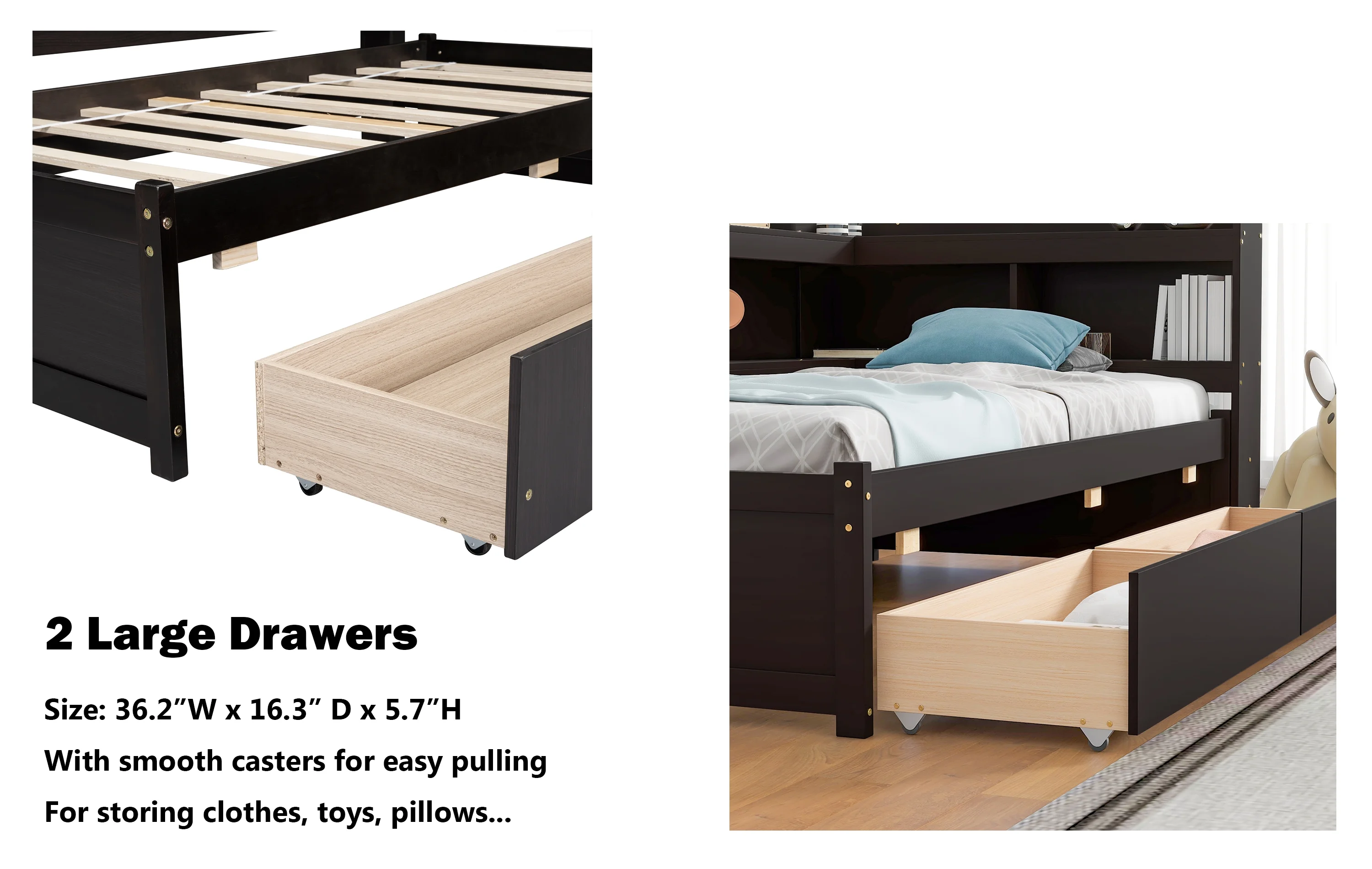 Euroco Wood Twin Platform Bed with Headboard & 2 Storage Drawers for Kids, Espresso