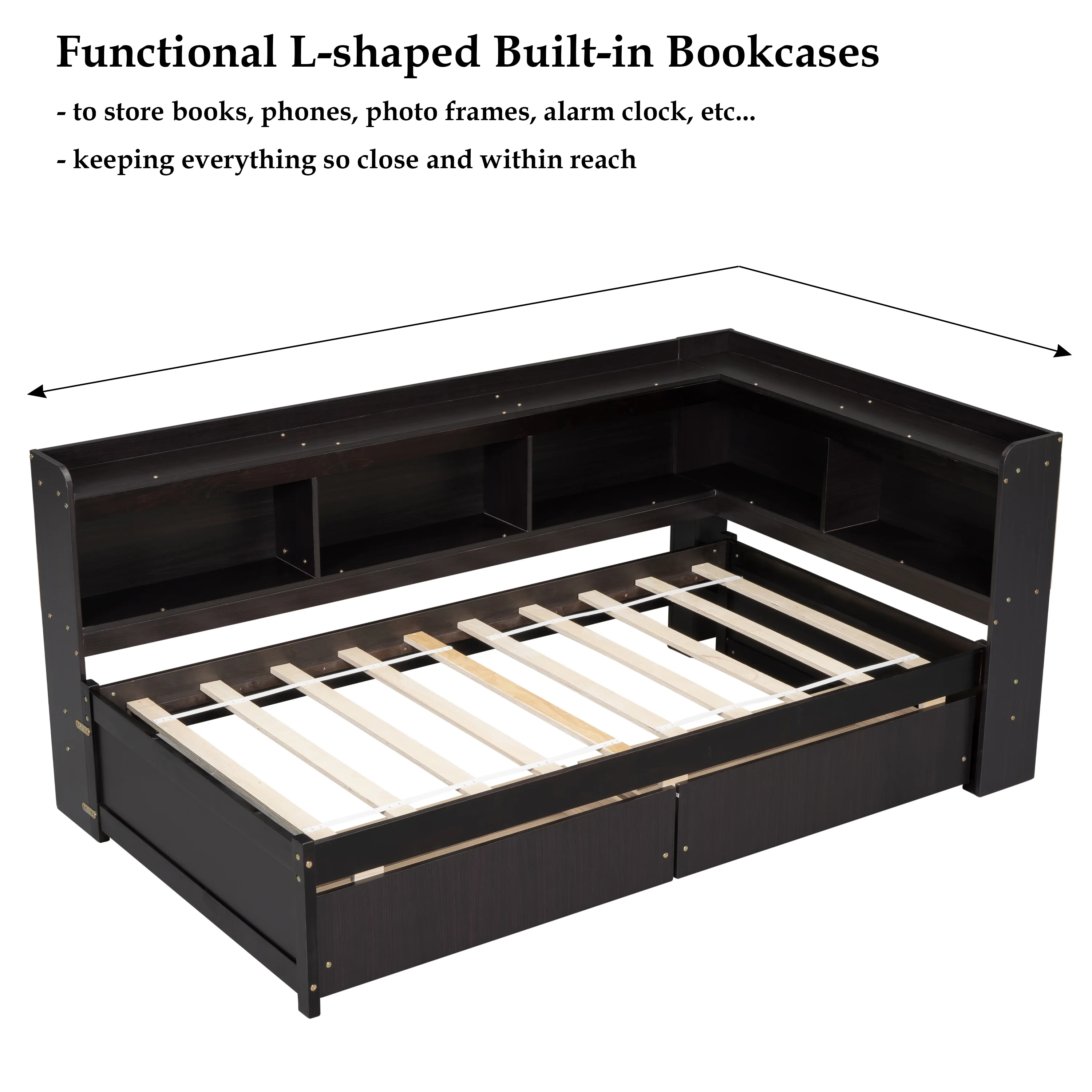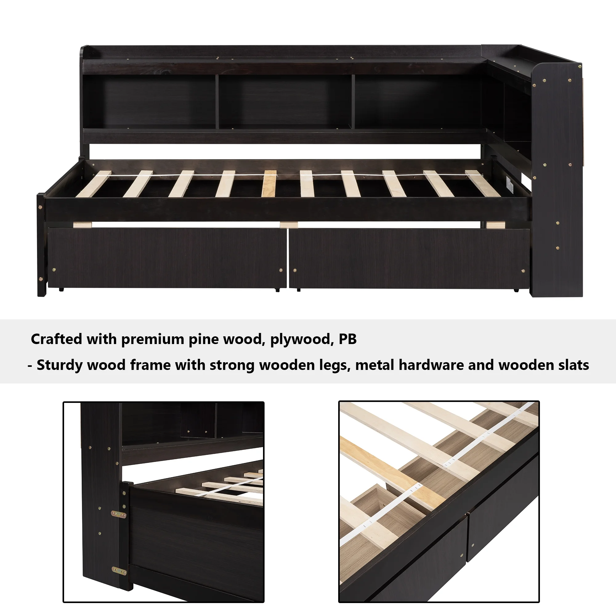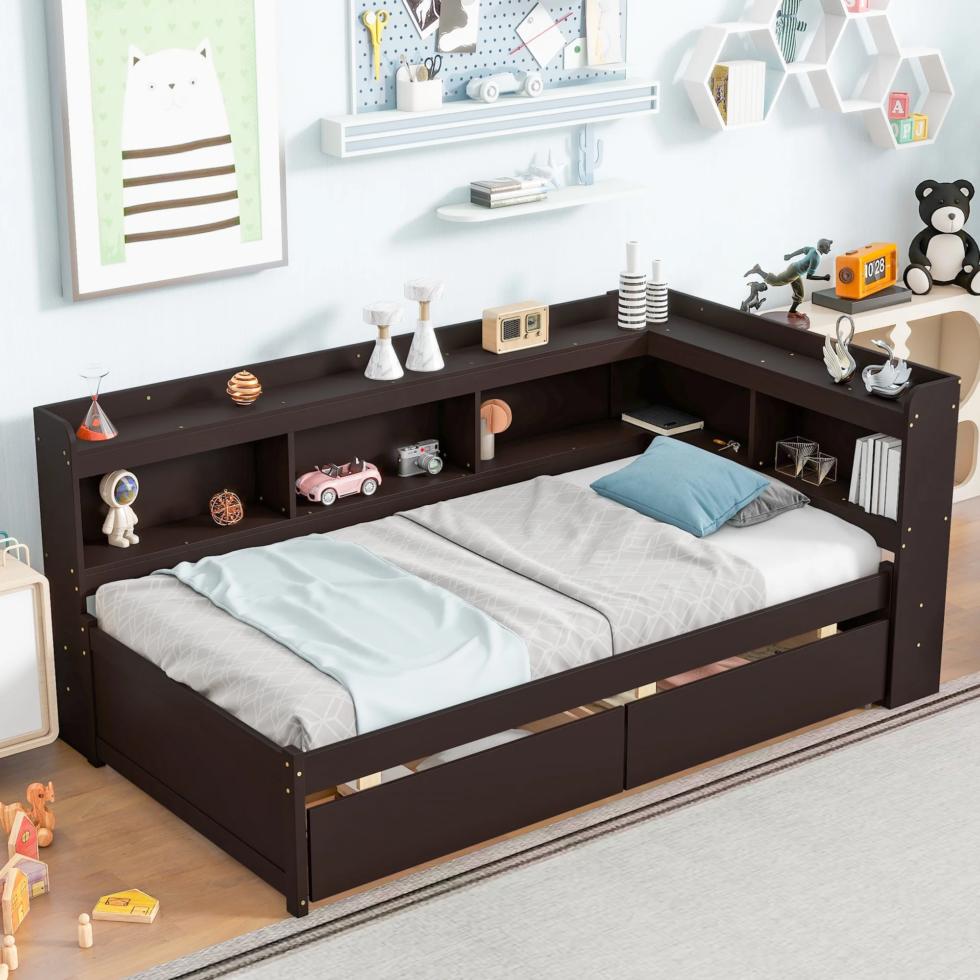 Euroco Wood Twin Platform Bed with Headboard & 2 Storage Drawers for Kids, Espresso