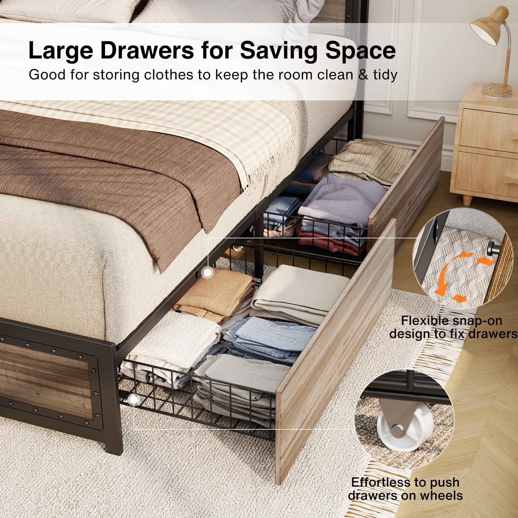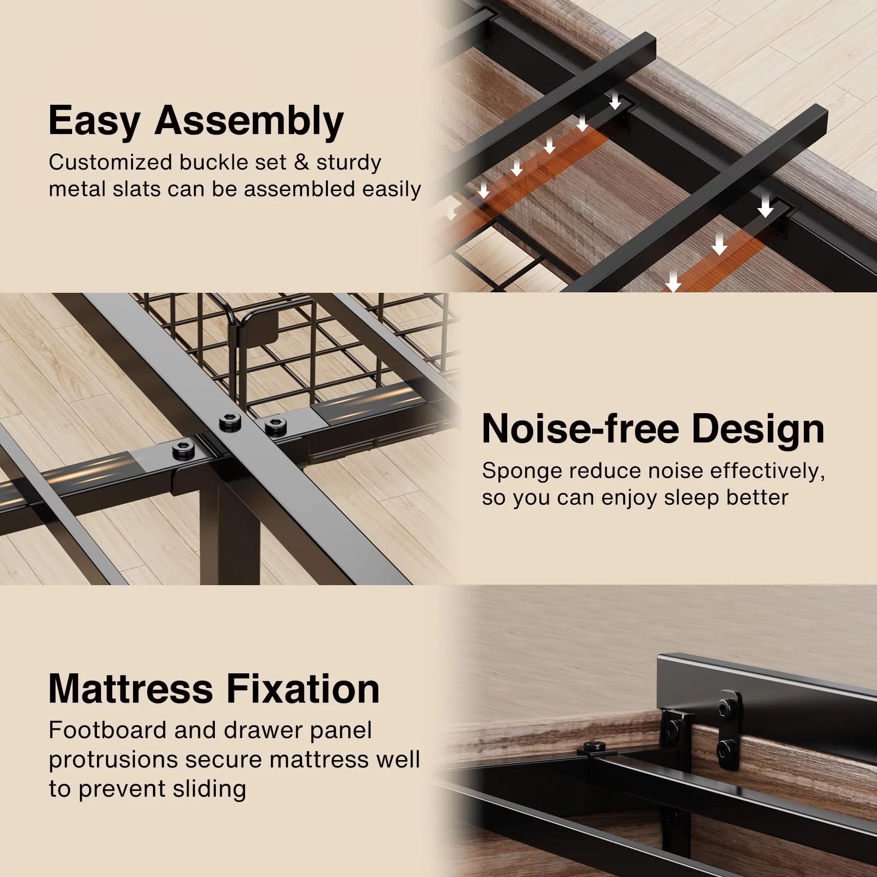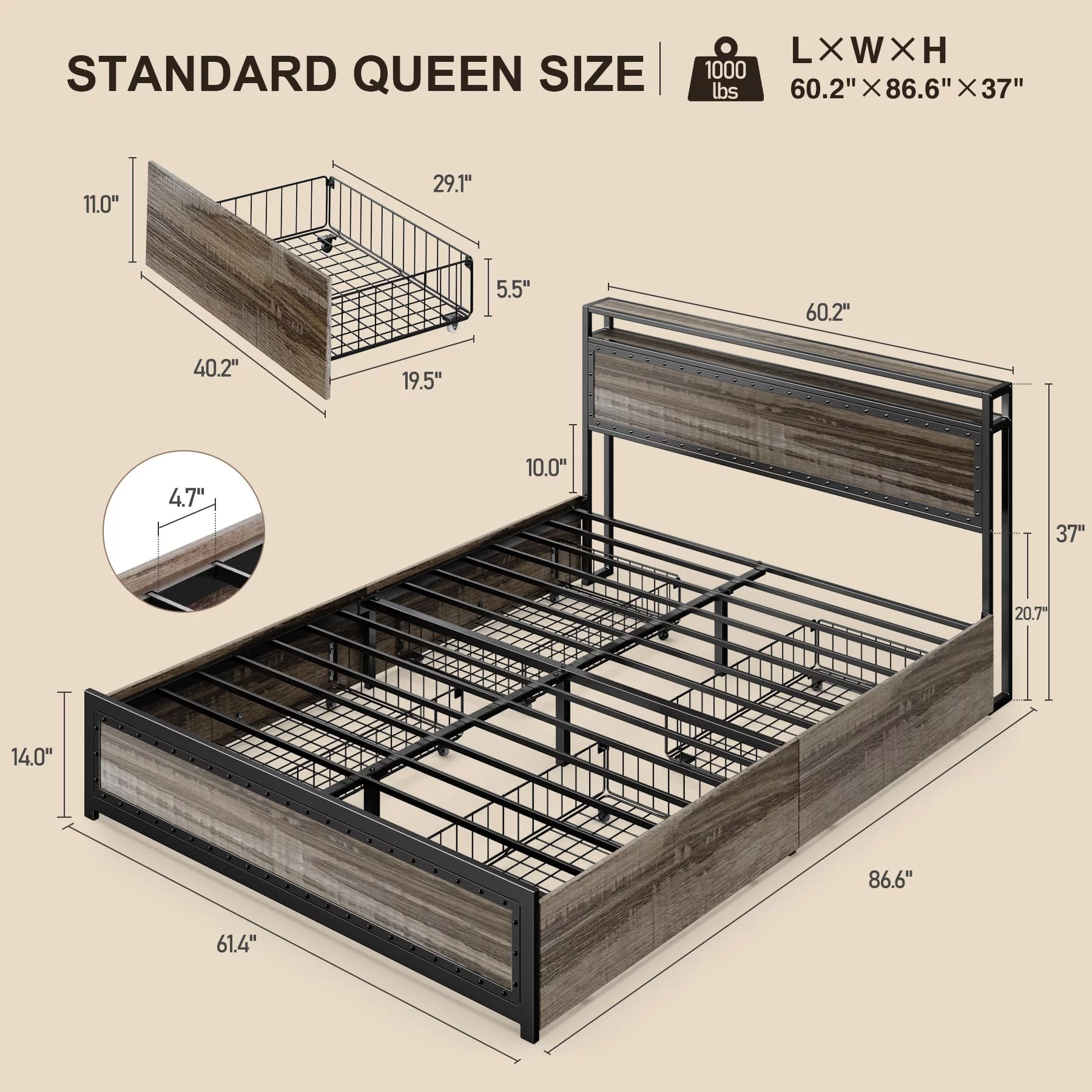 Lofka Queen Bed Frame with 4 Storage Drawers, Metal Platform Bed with Sturdy Steel Slats - Grey