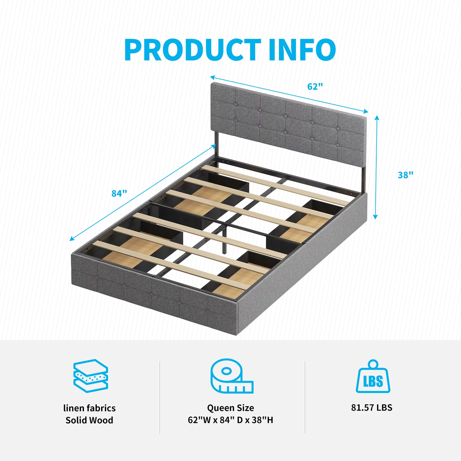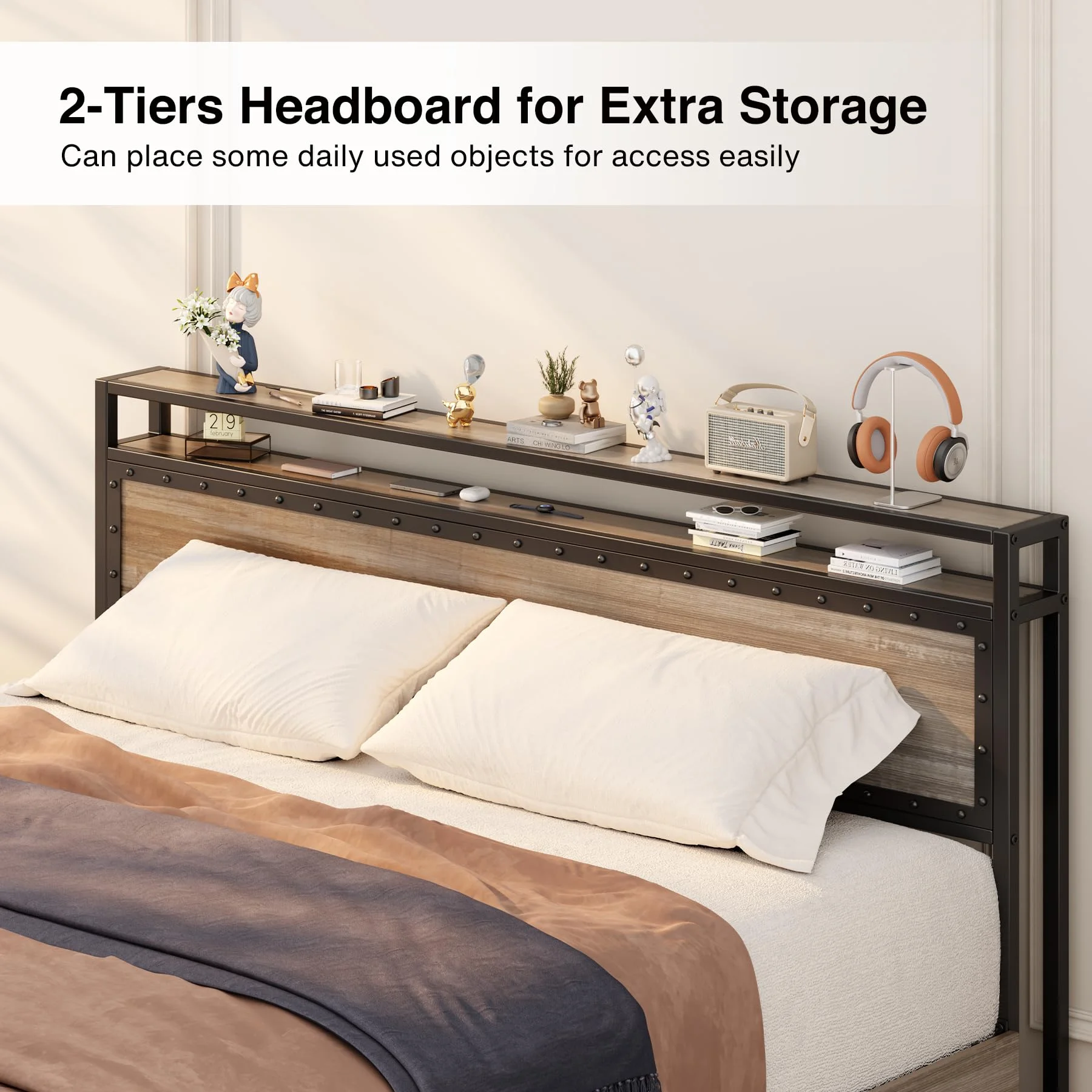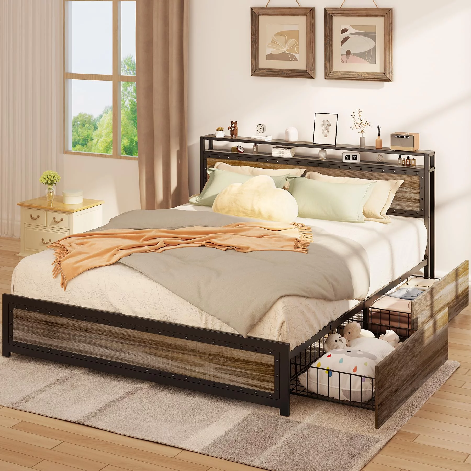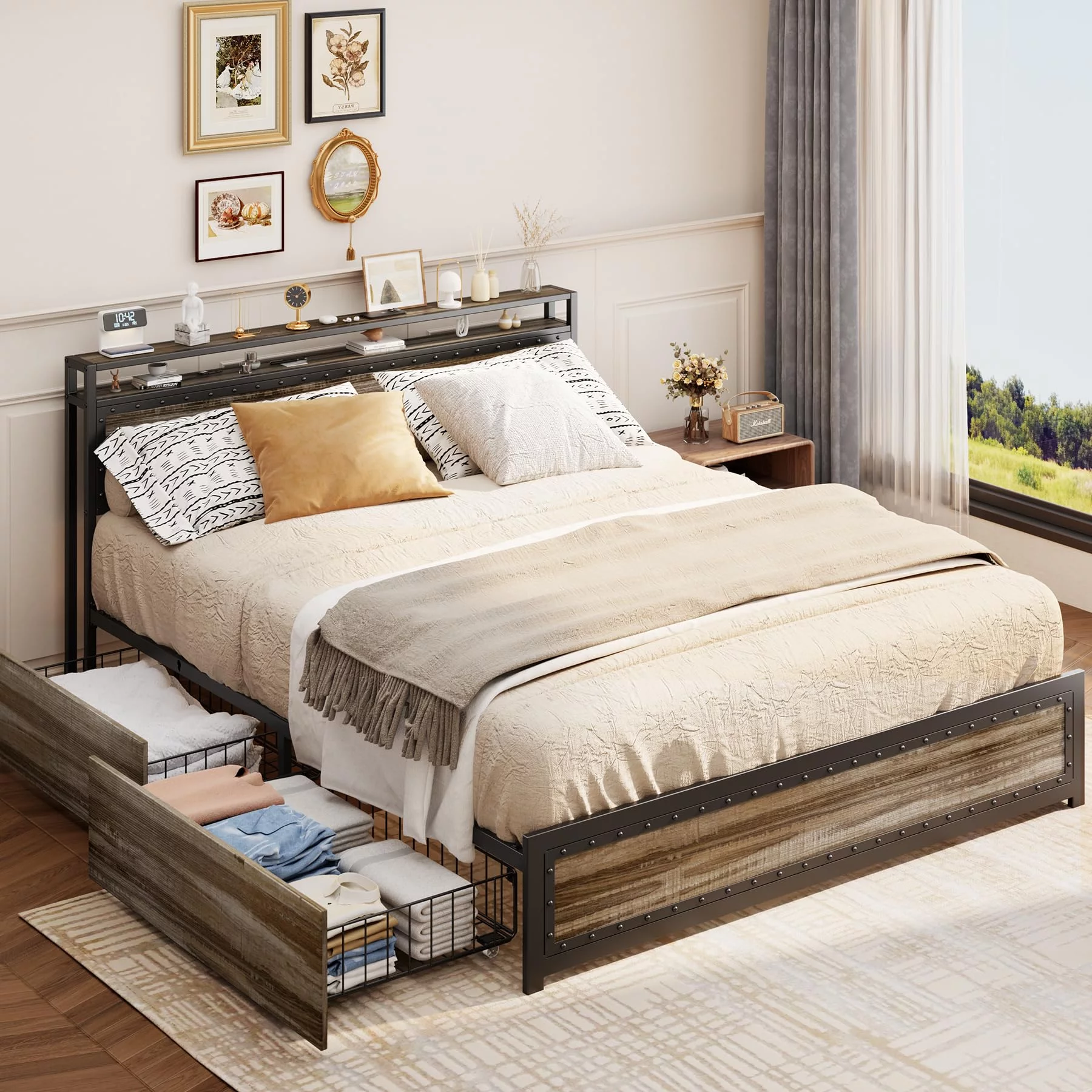 Lofka Queen Bed Frame with 4 Storage Drawers, Metal Platform Bed with Sturdy Steel Slats - Grey