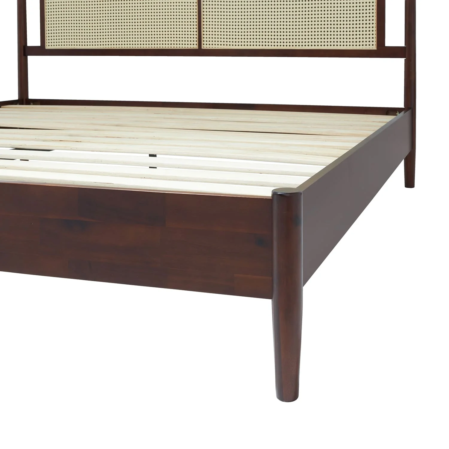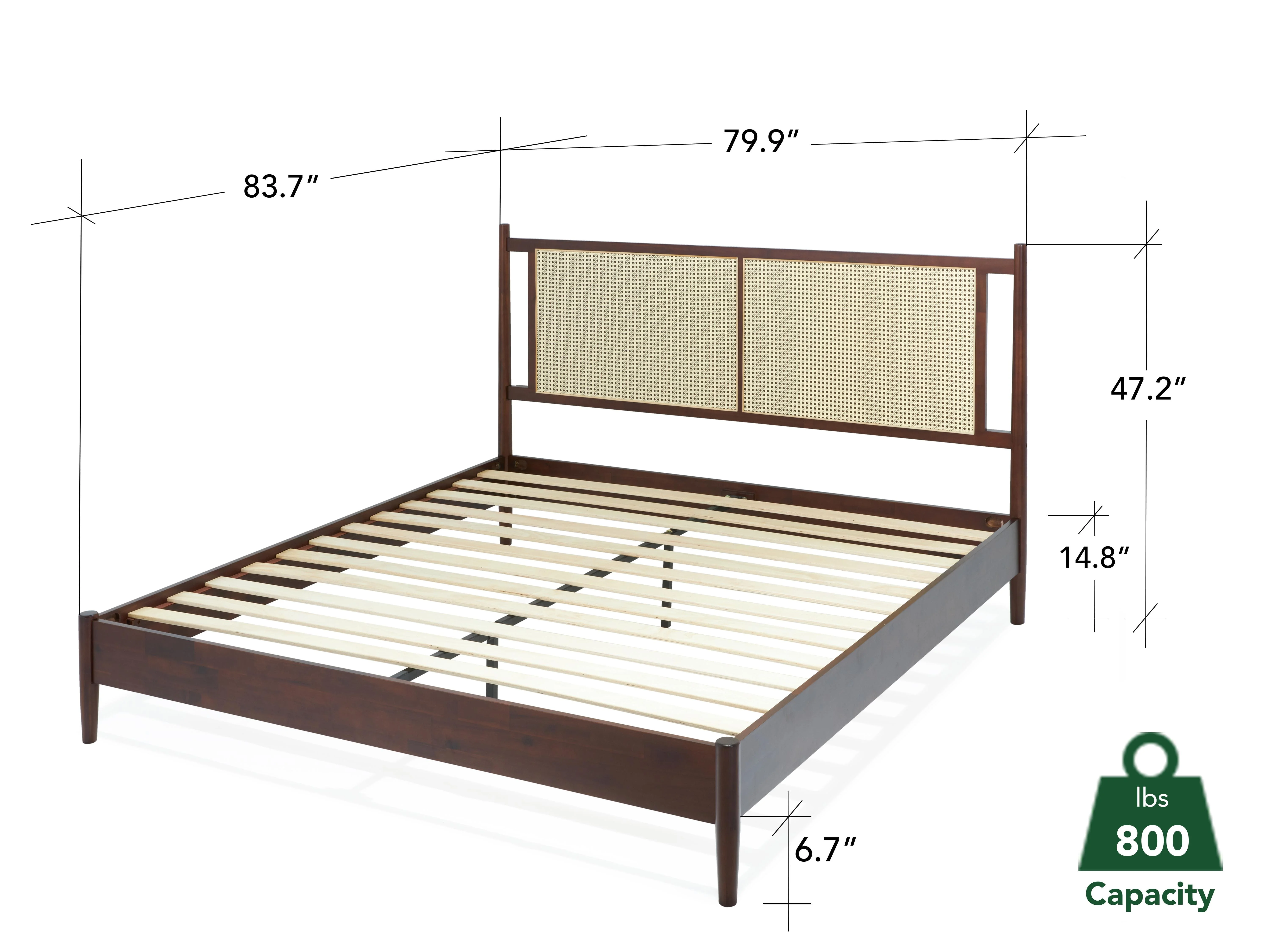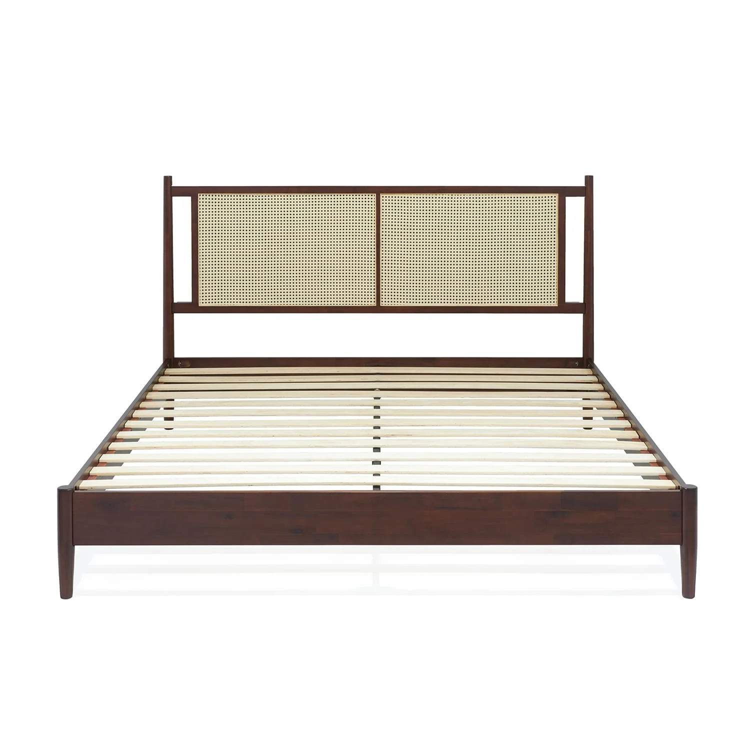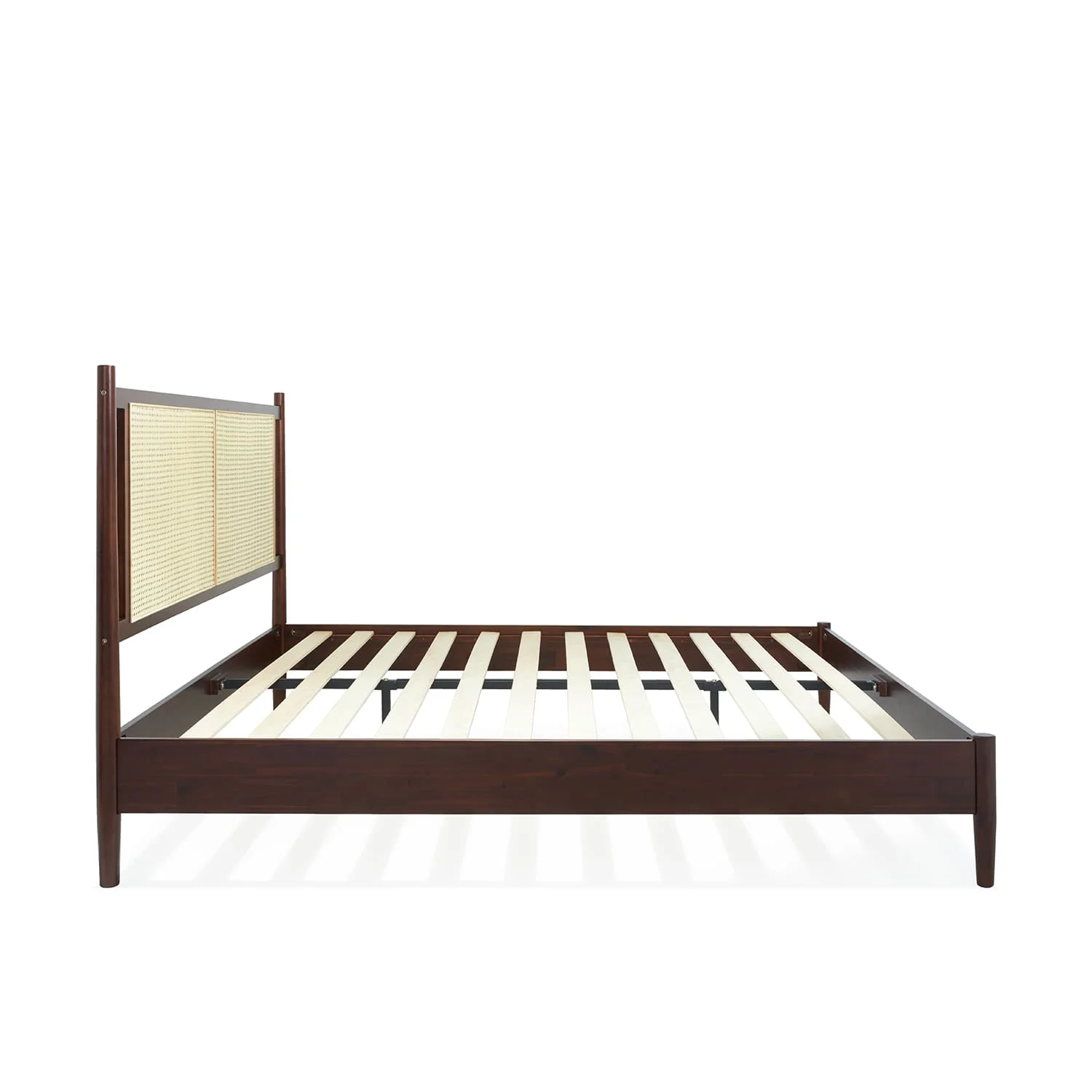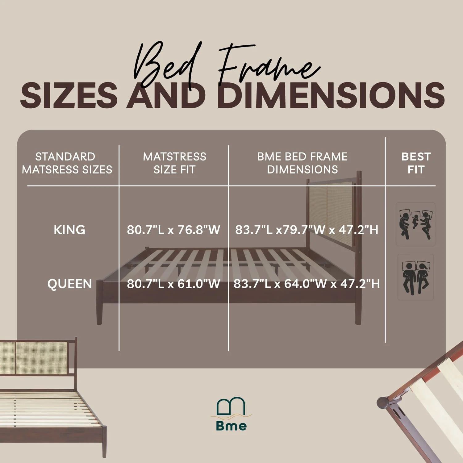 BME Asher 47" King Platform Bed Frame, Rattan Headboard, Mid Century and Boho, Solid Wood, Walnut