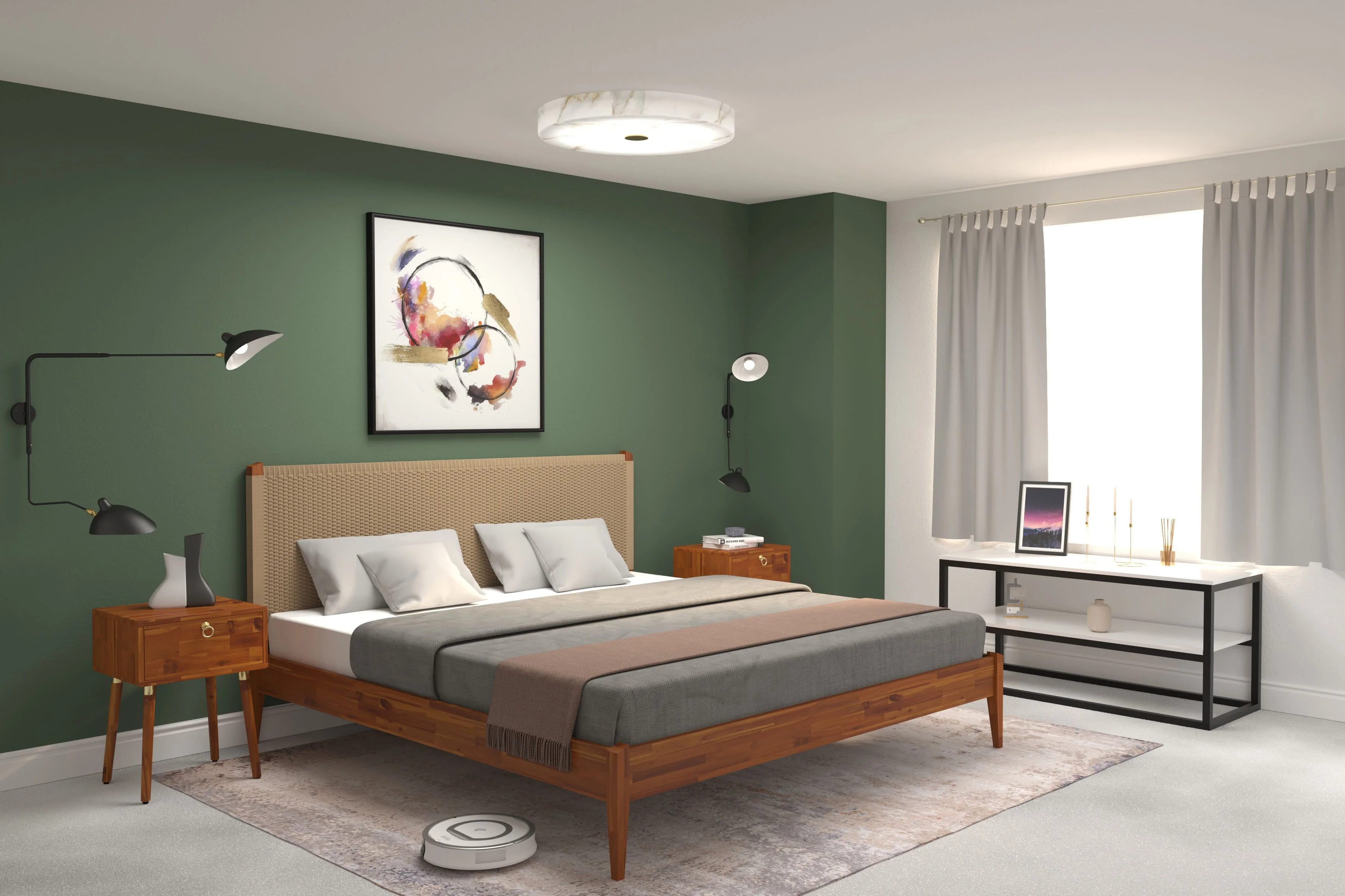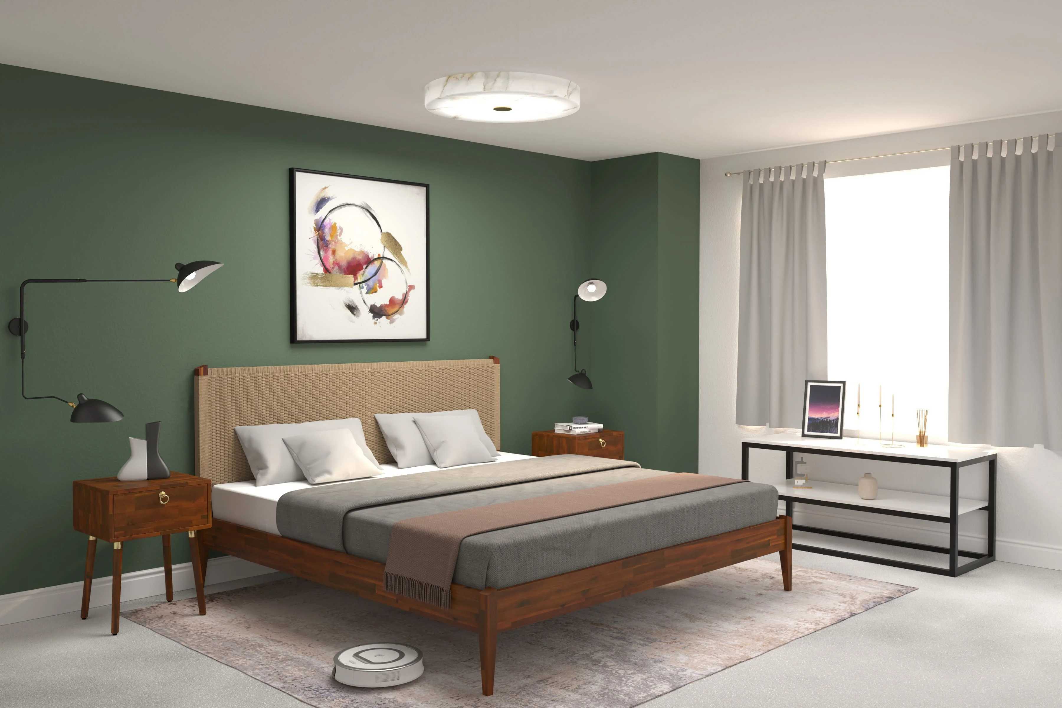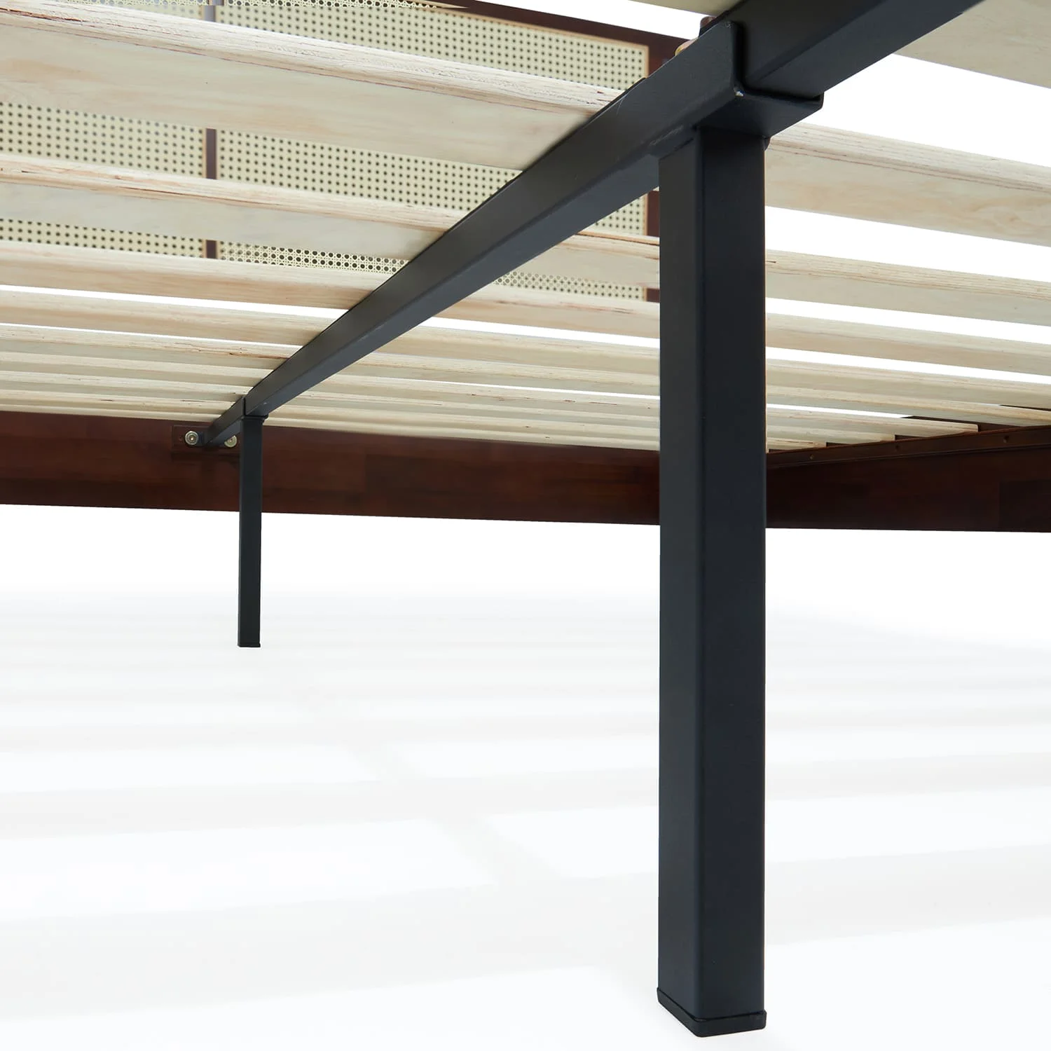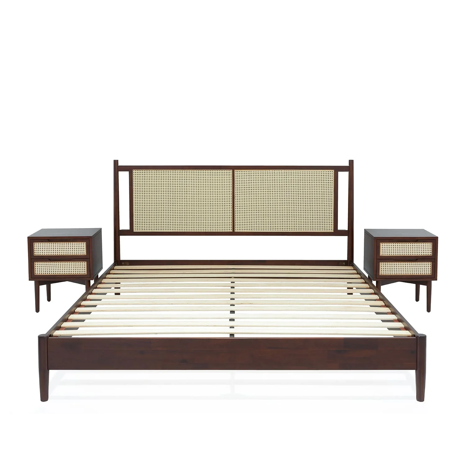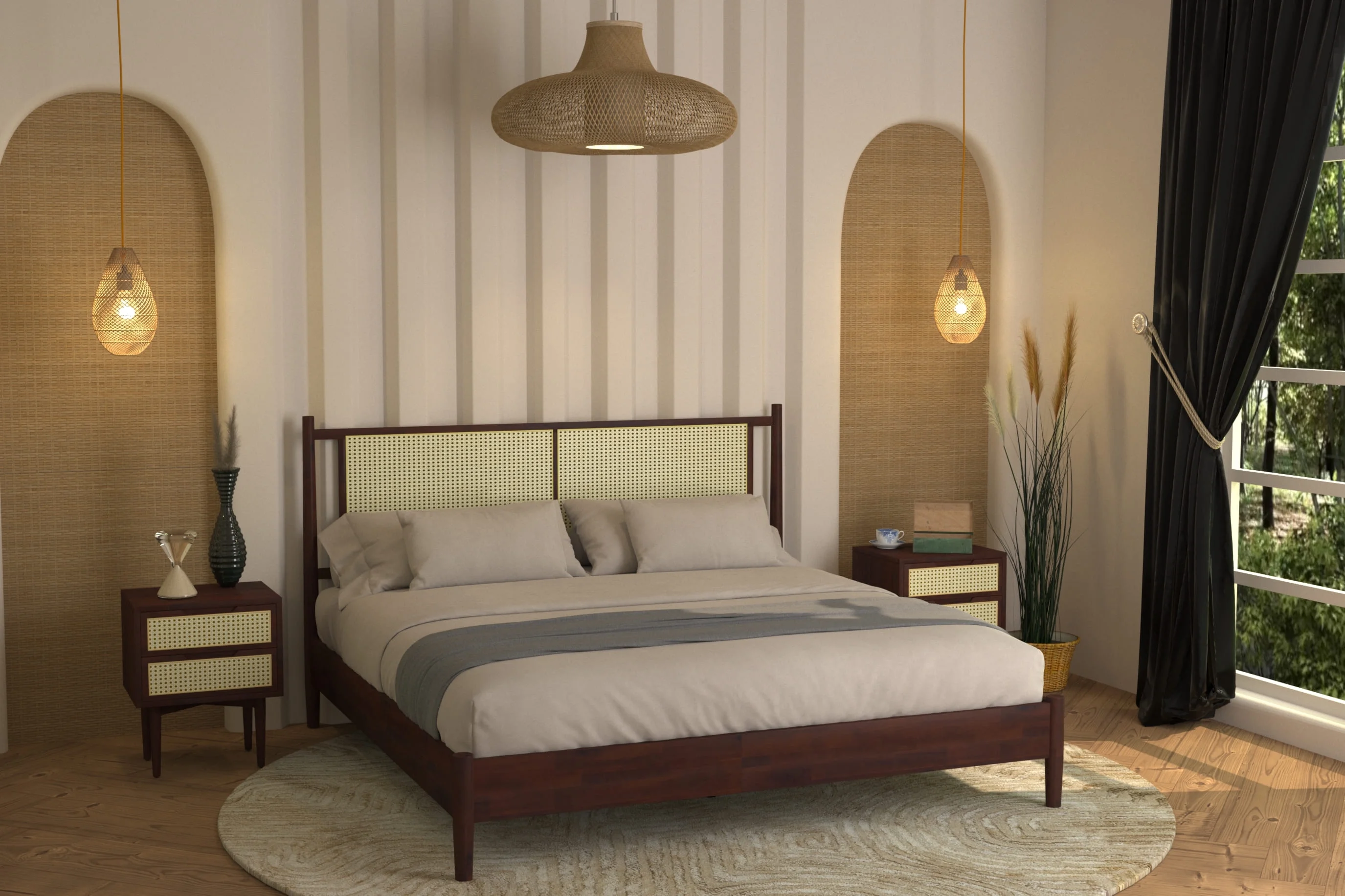 BME Asher 47" King Platform Bed Frame, Rattan Headboard, Mid Century and Boho, Solid Wood, Walnut