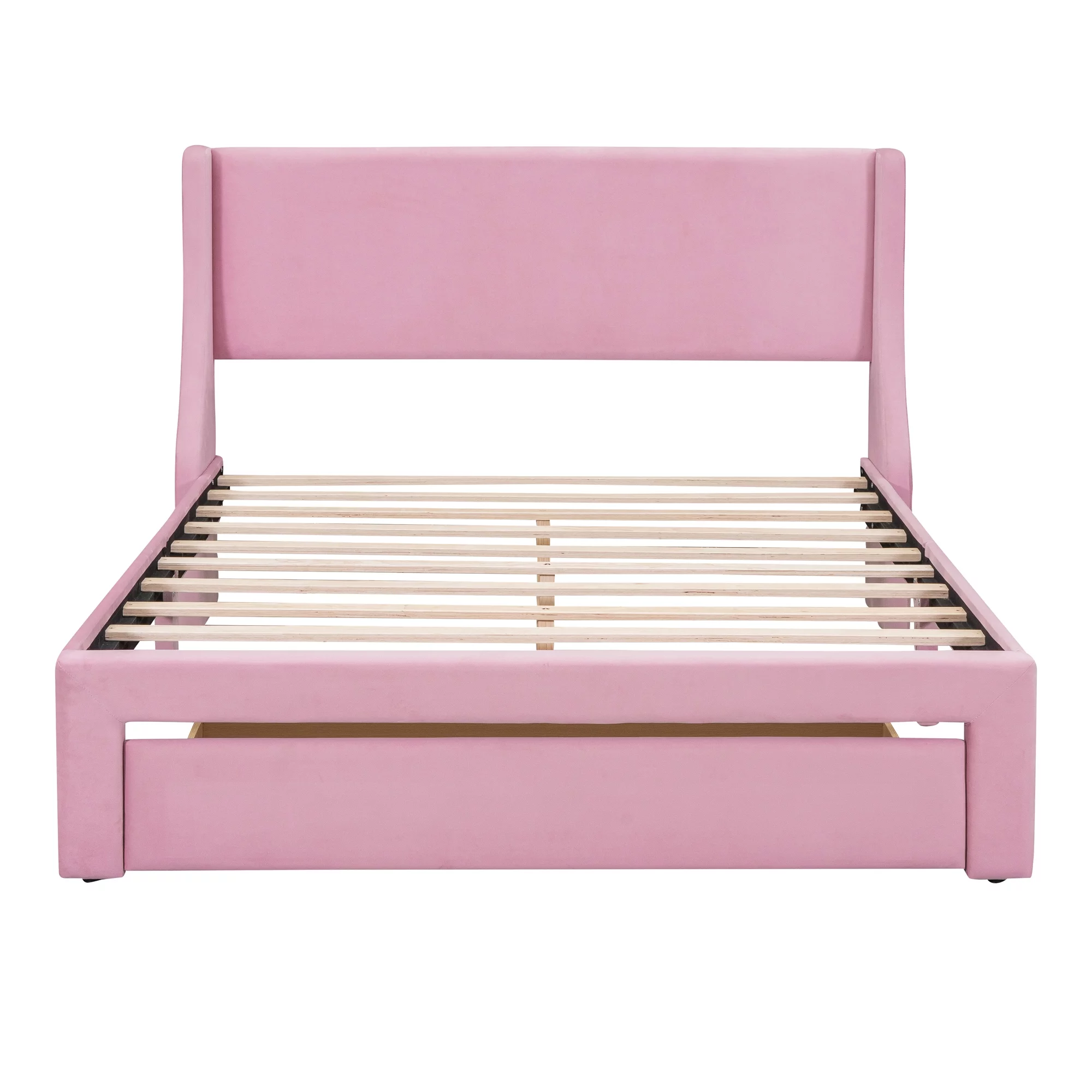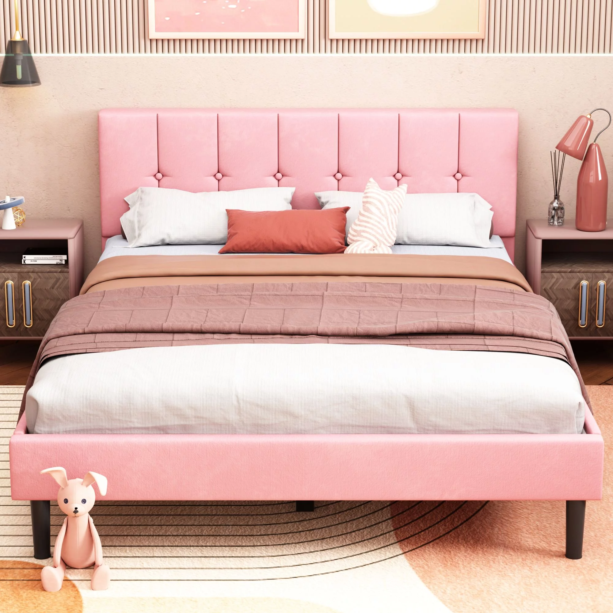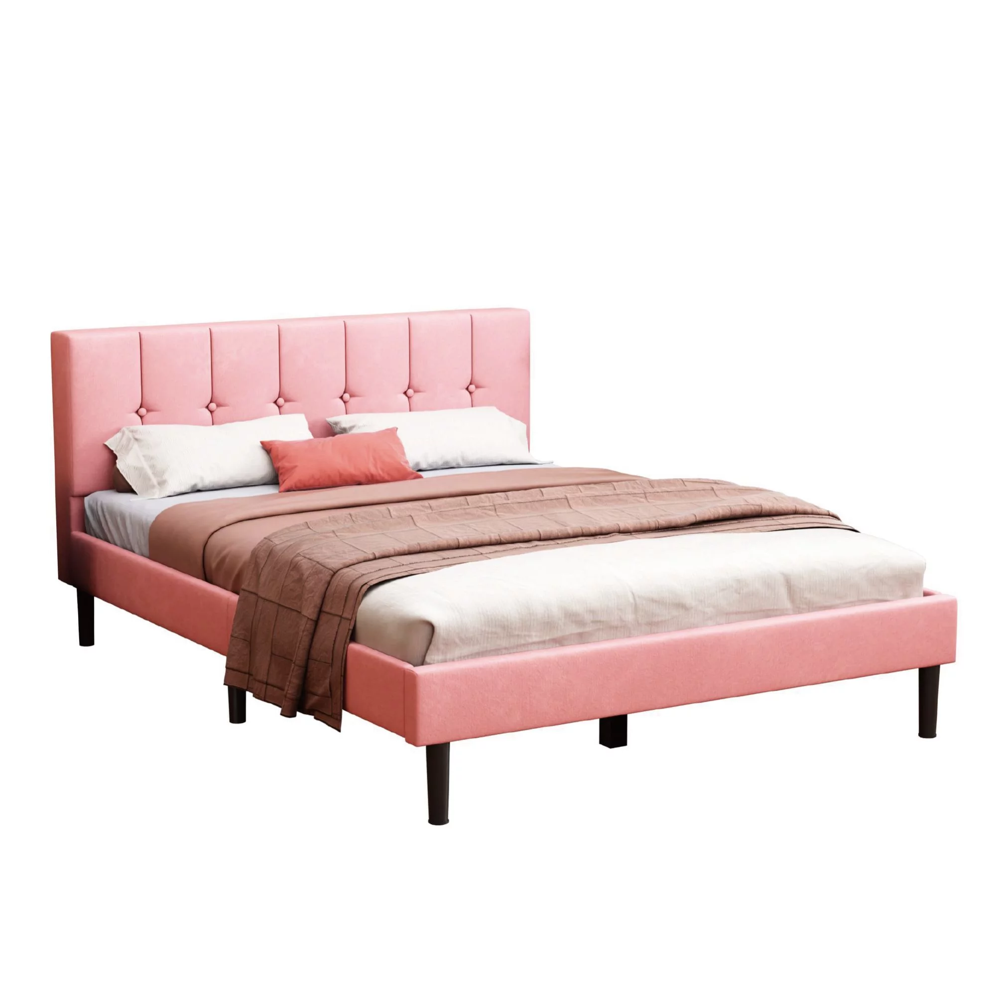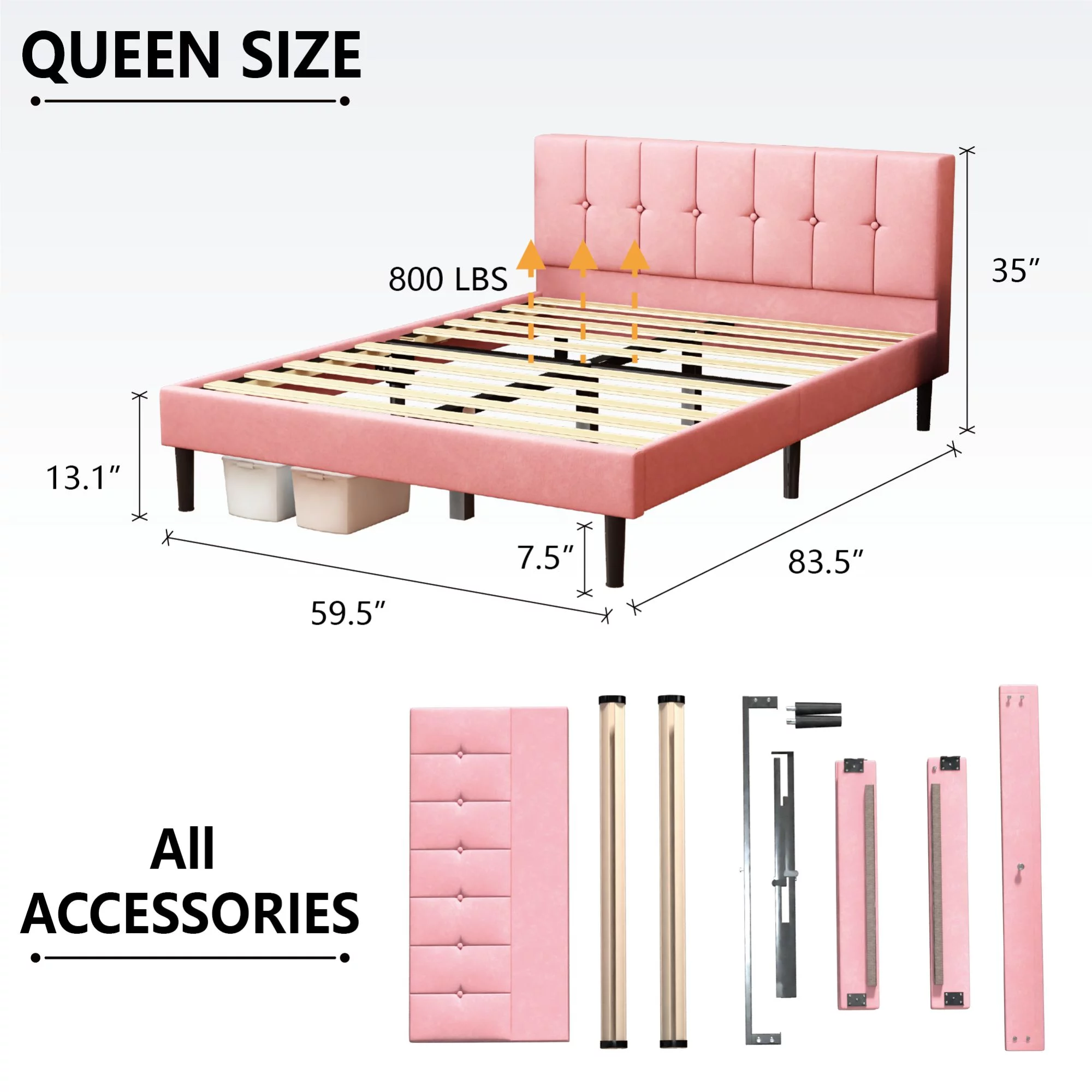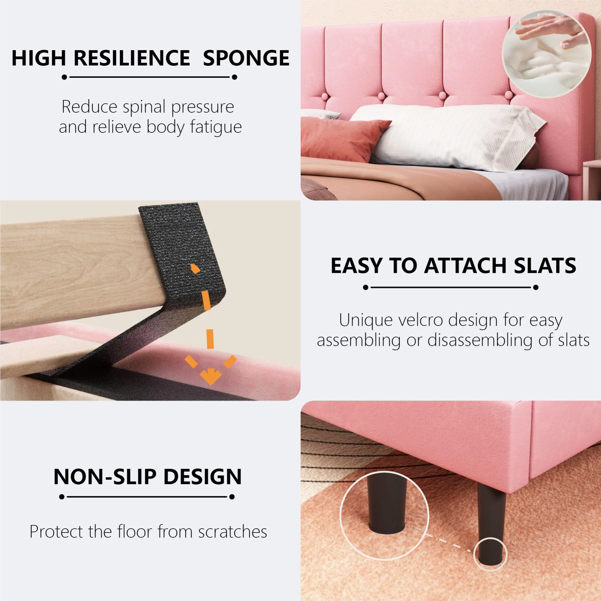 Lijimei Queen Bed Frame with Upholstered Headboard, Button Tufted Style, Pink, Velvet