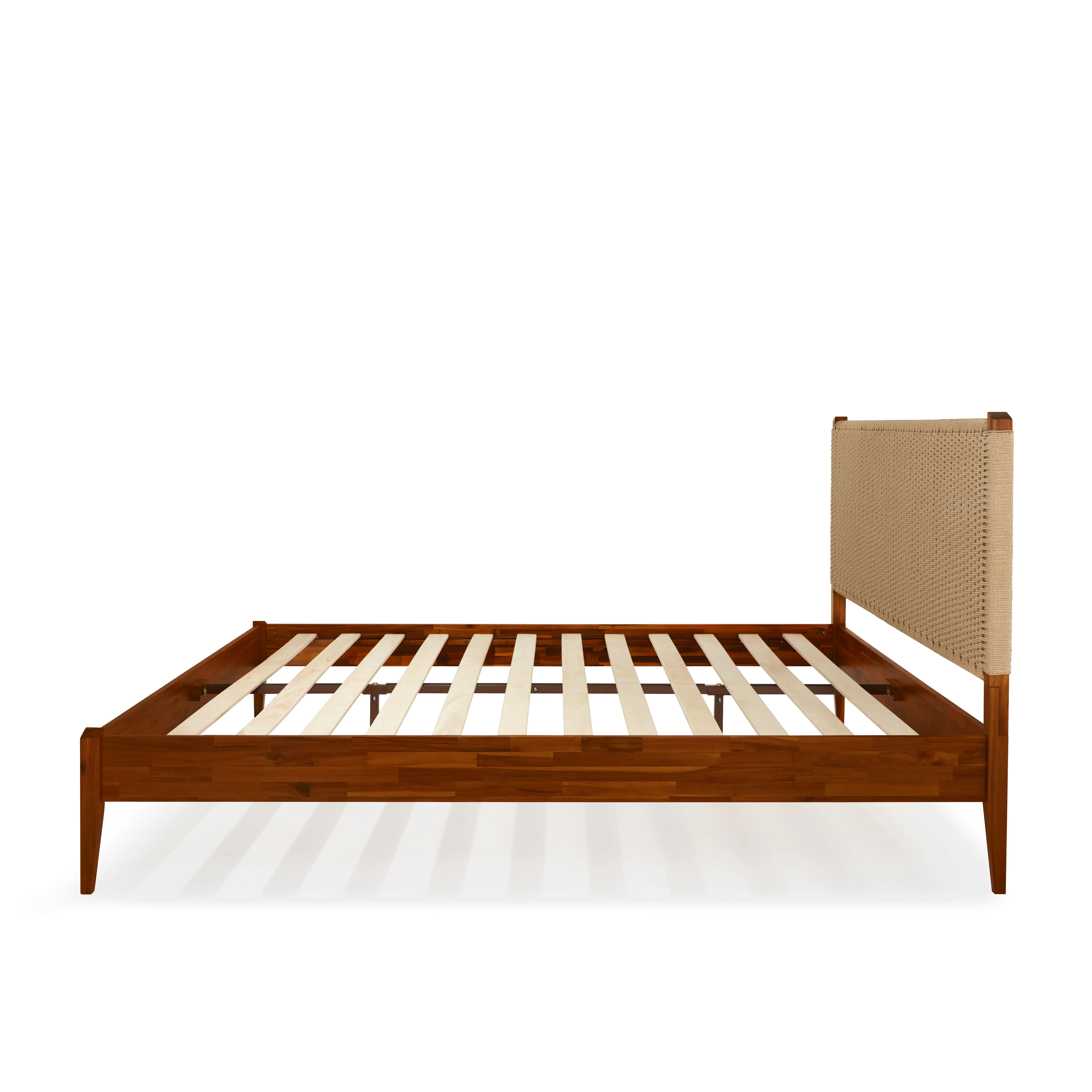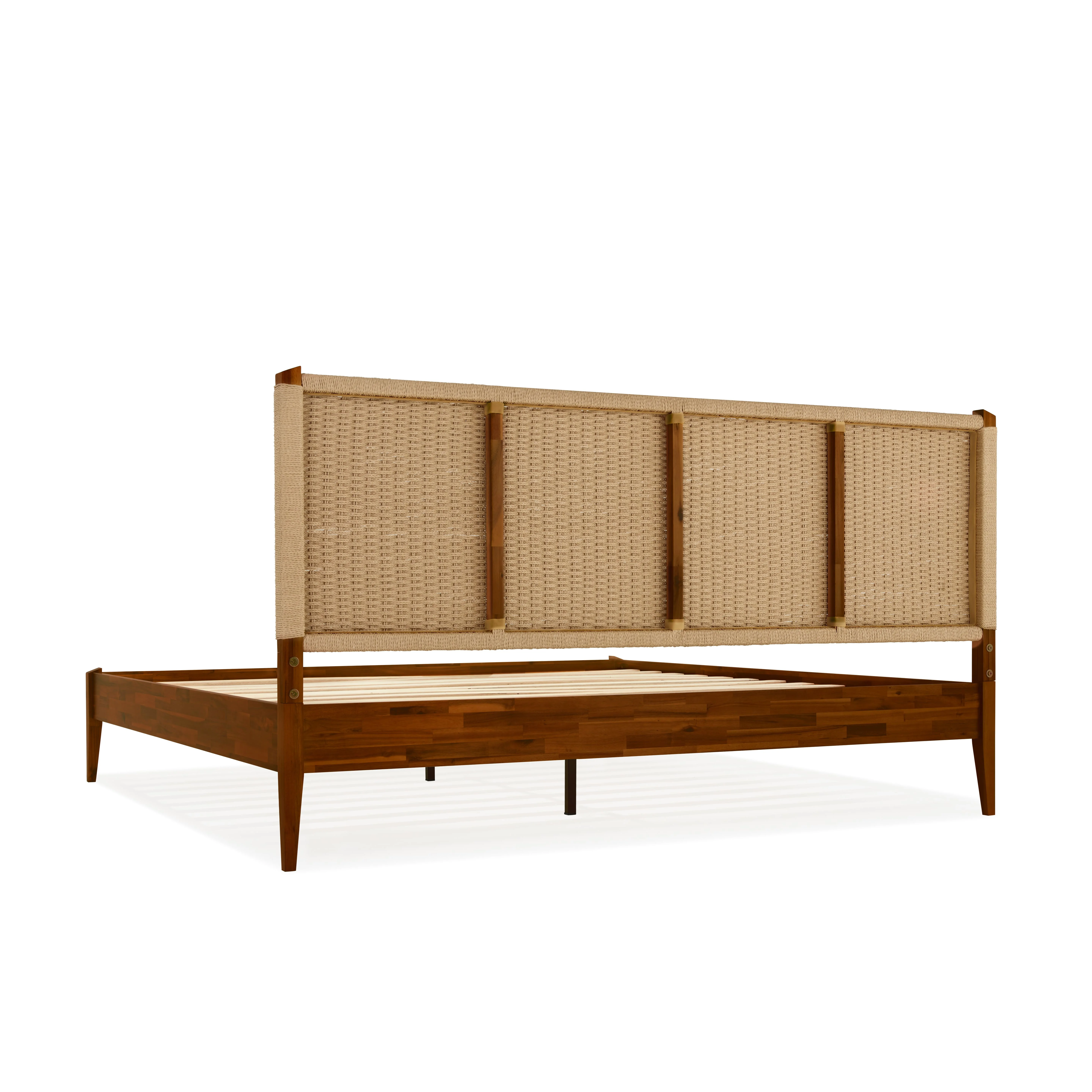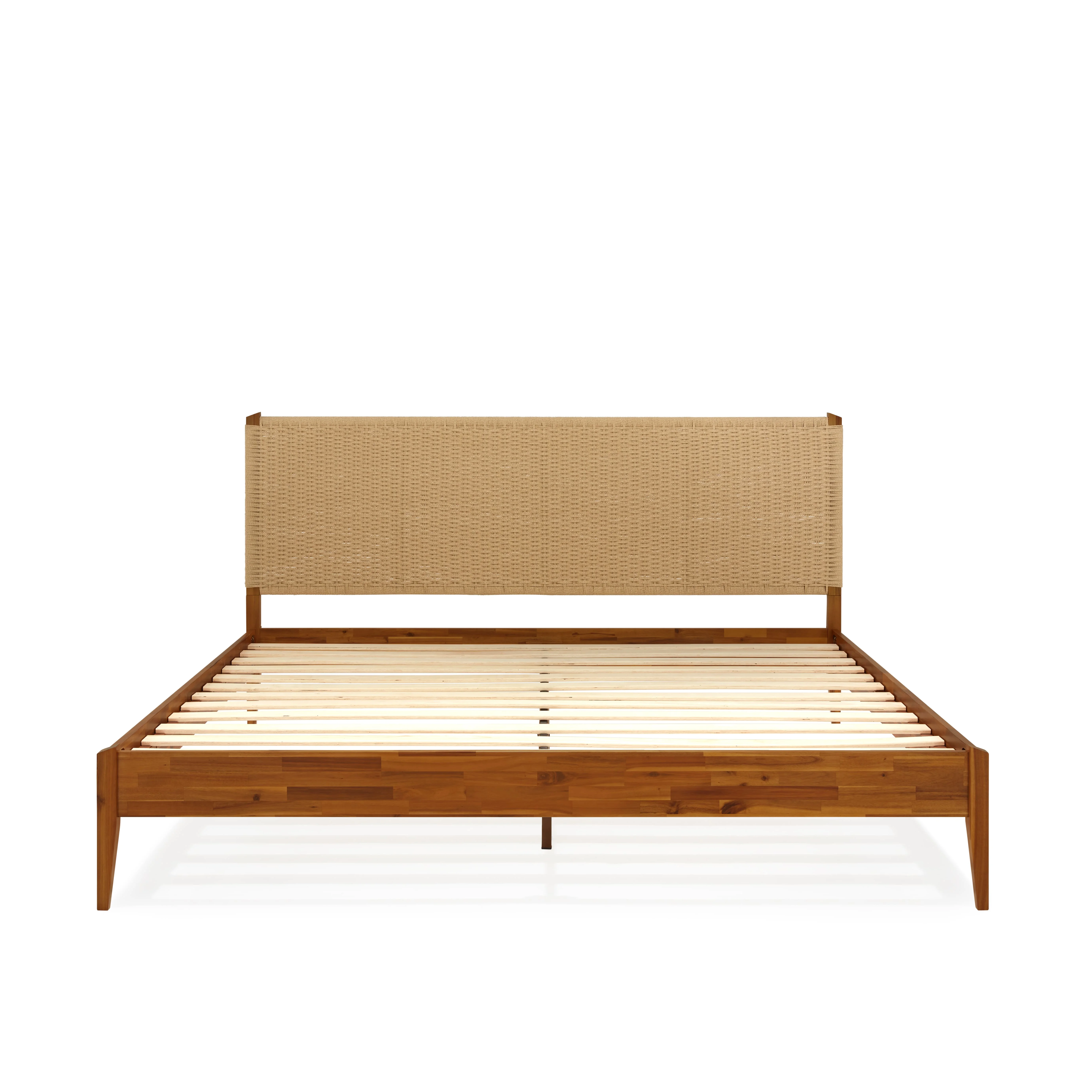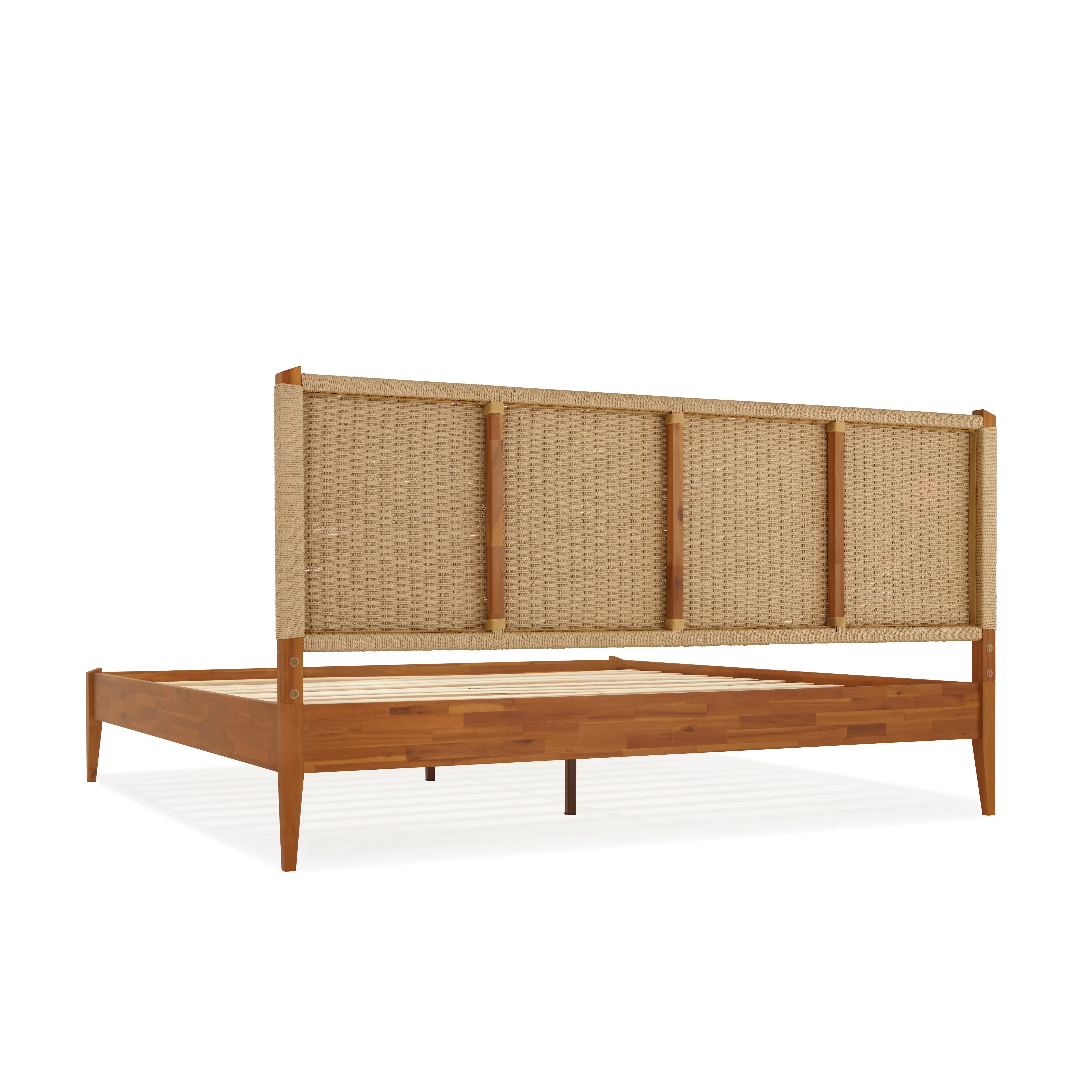 BME Selena 43" King Bed Frame, Handcrafted Paper Cord Headboard, Mid-Century, Solid Wood, Caramel