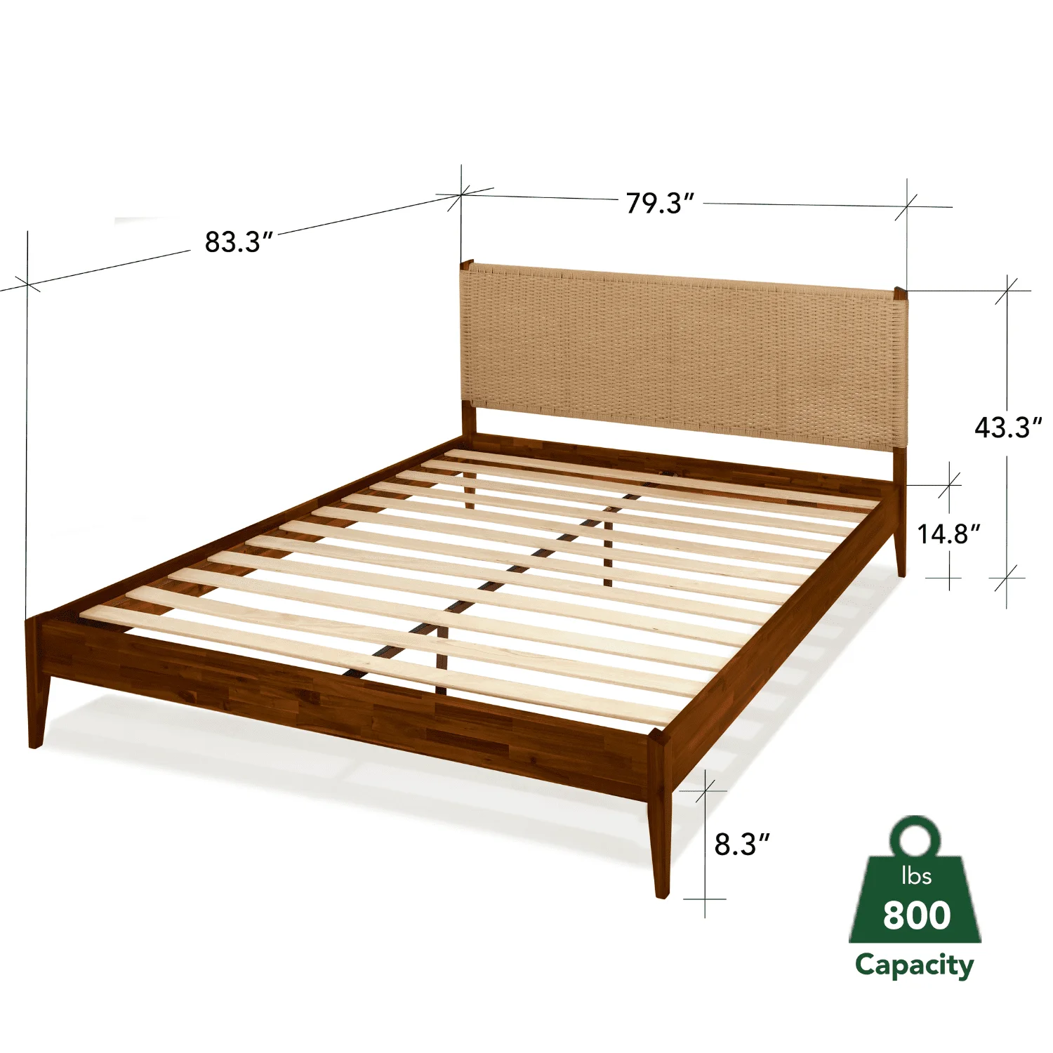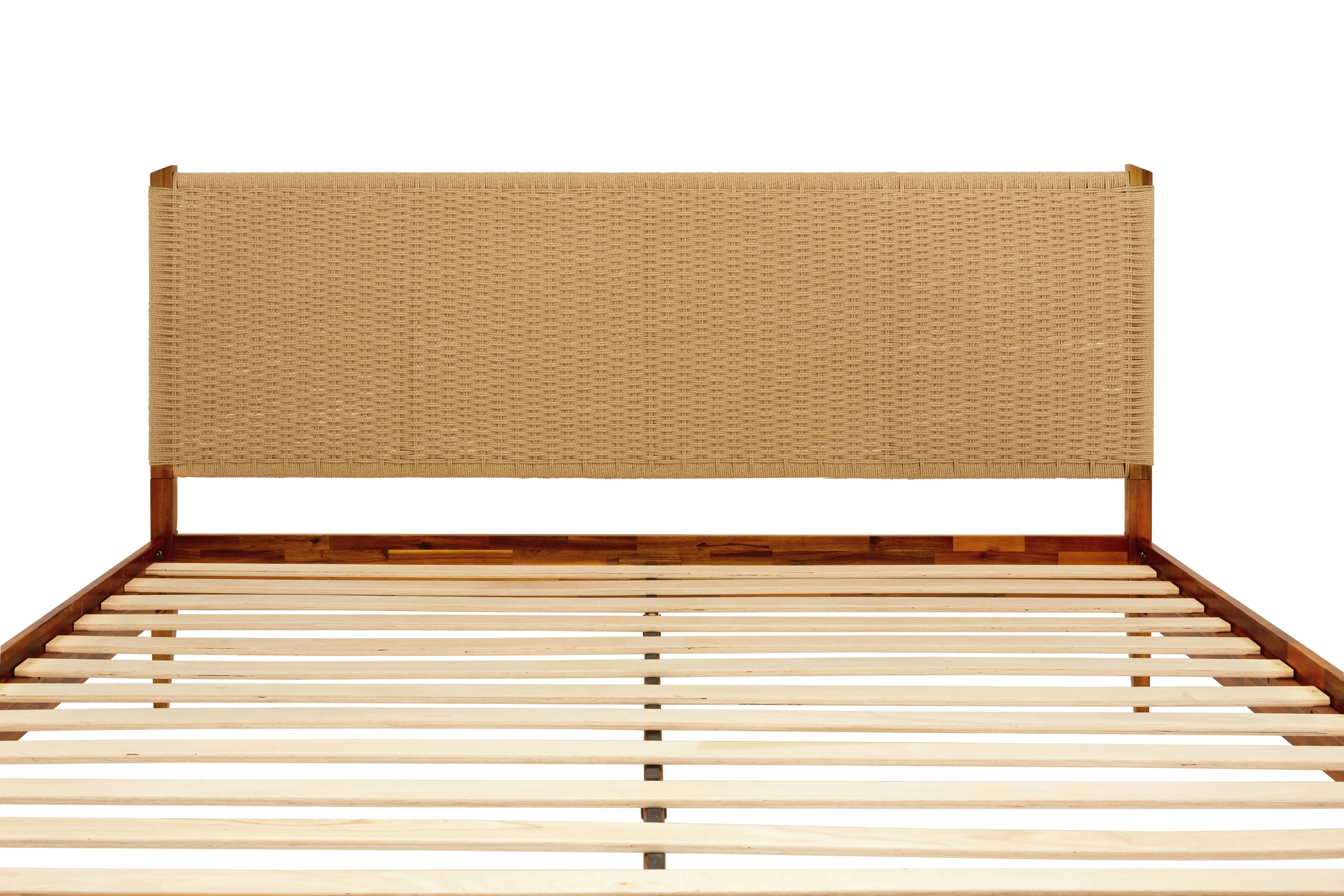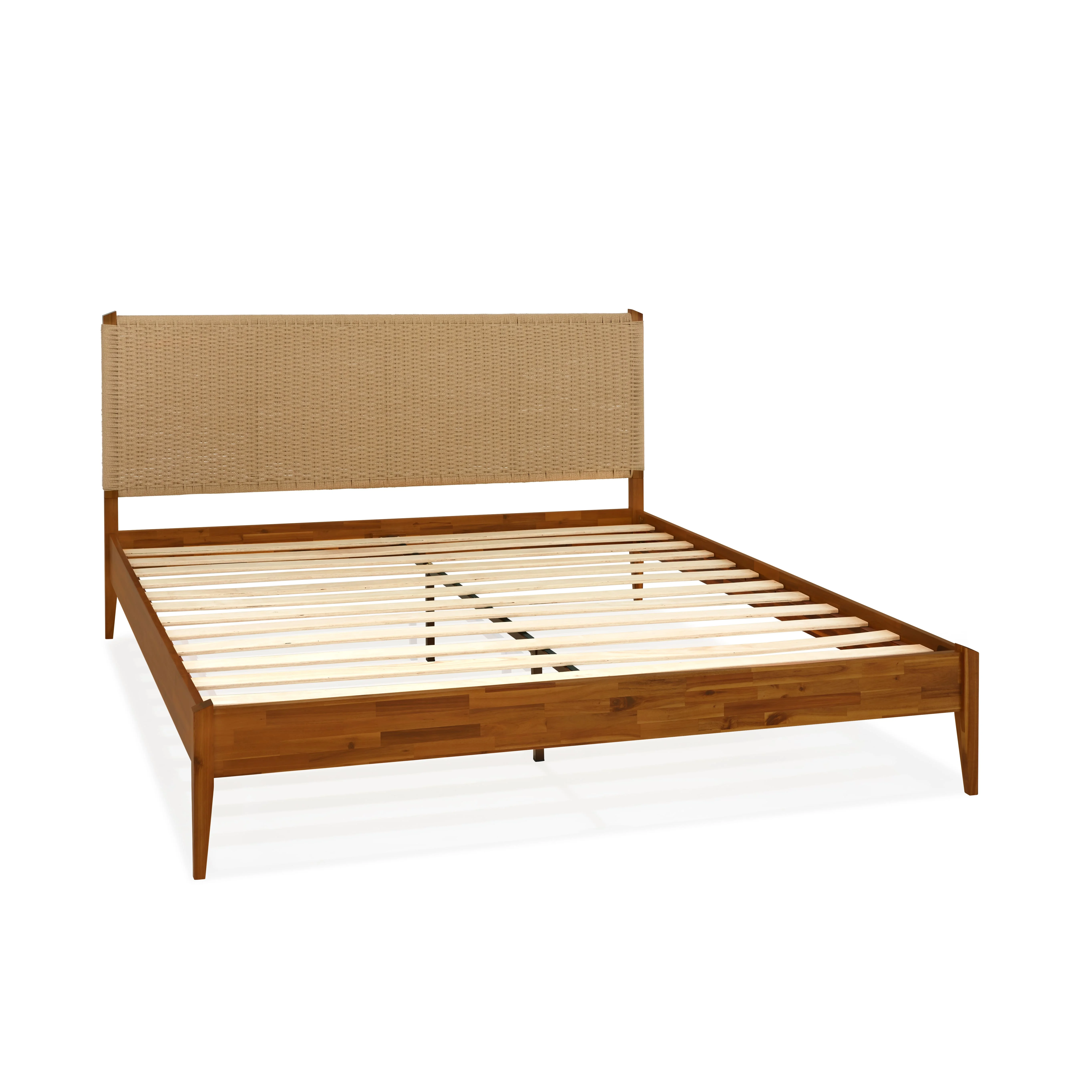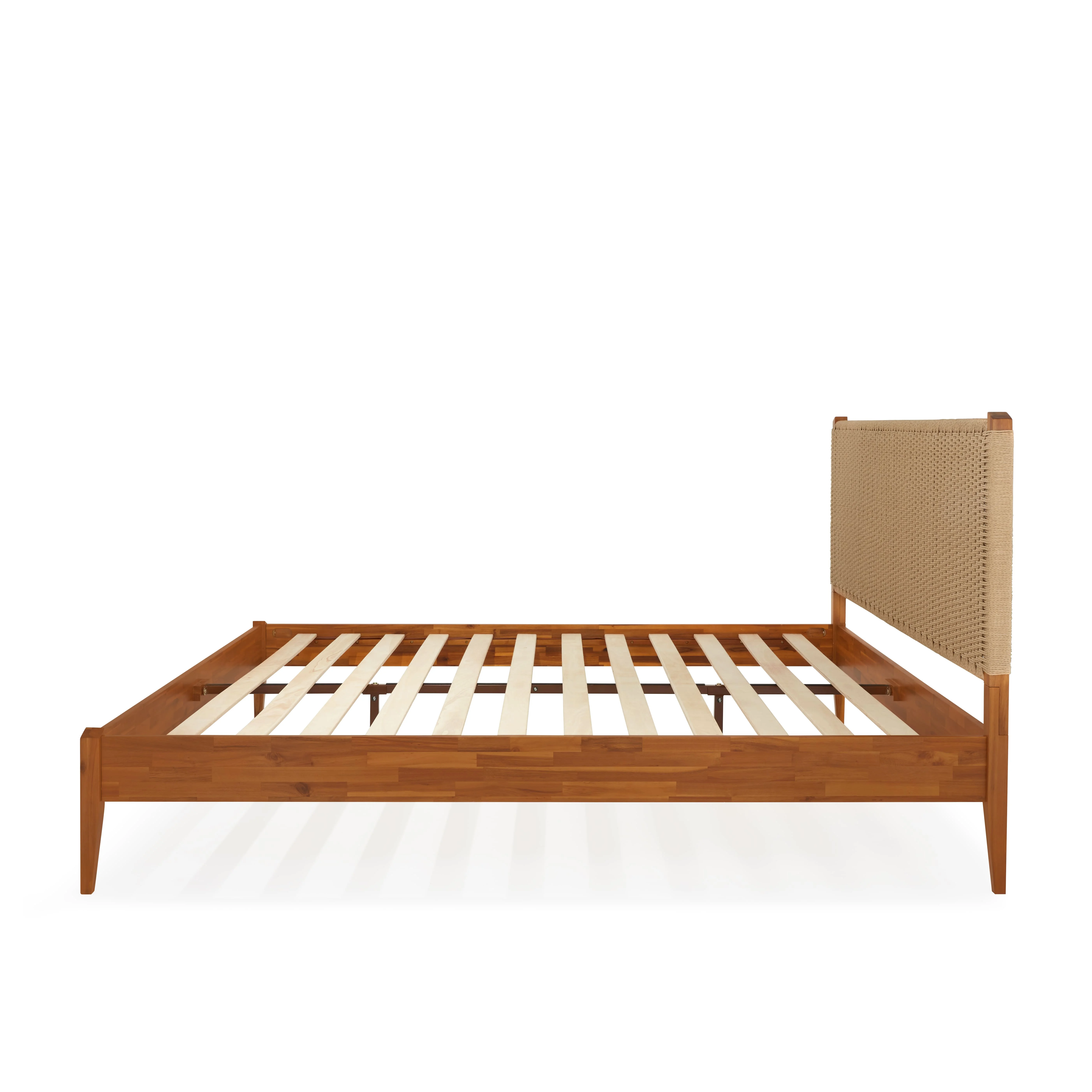 BME Selena 43" King Bed Frame, Handcrafted Paper Cord Headboard, Mid-Century, Solid Wood, Caramel