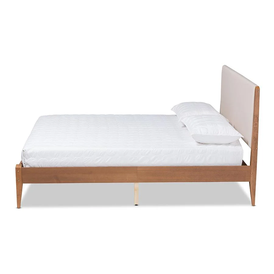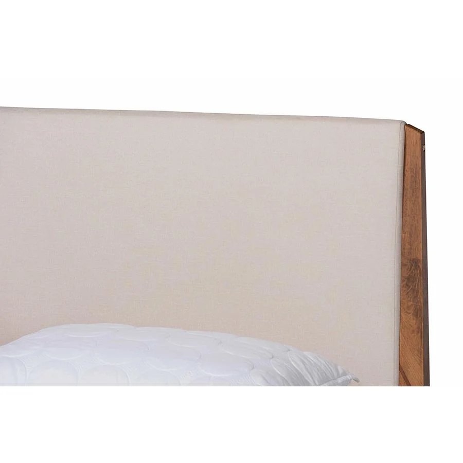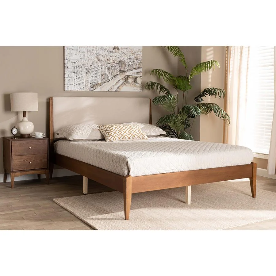 Baxton Studio Lenora Mid-Century Modern Beige Fabric Upholstered and Walnut Brown Finished Wood Full Size Platform Bed