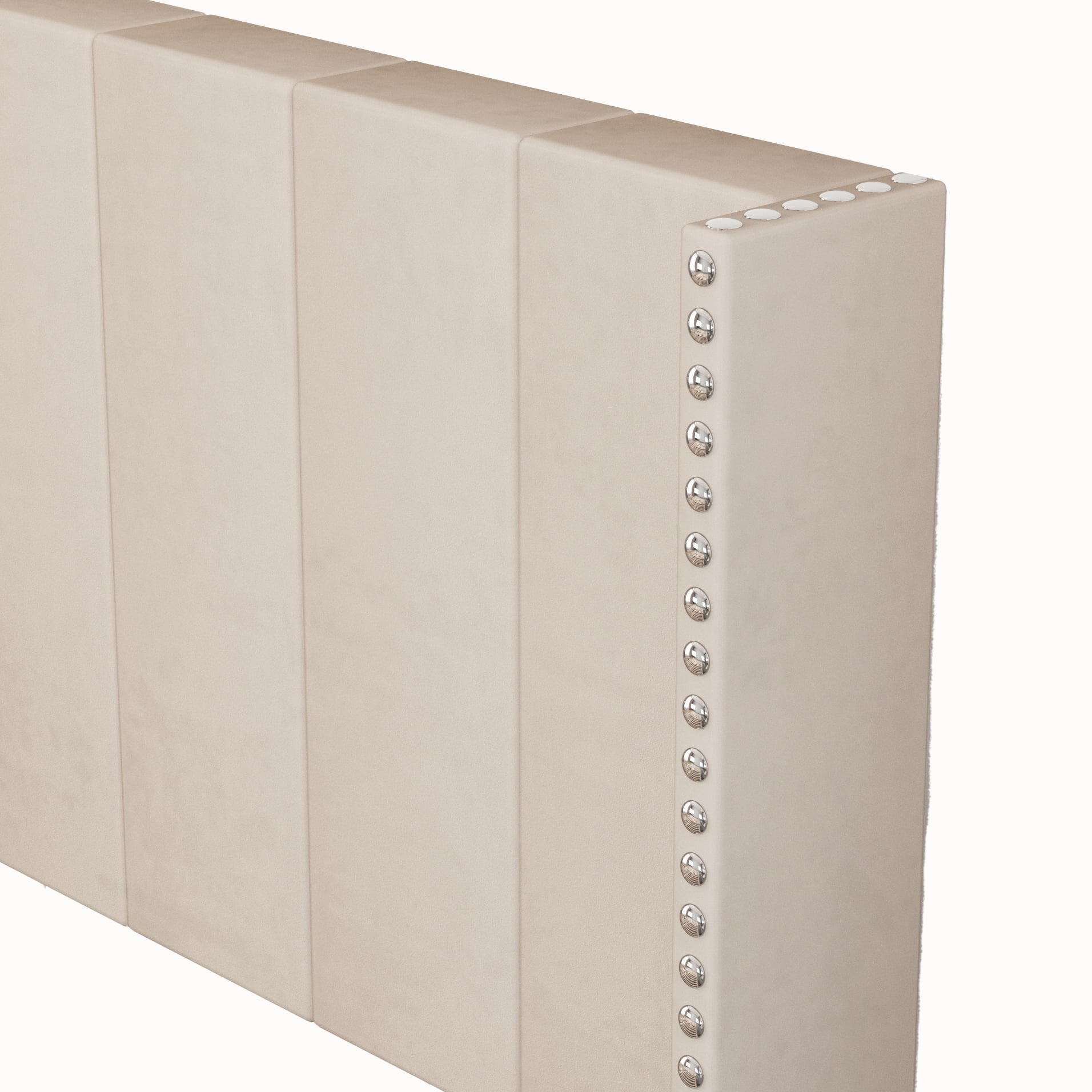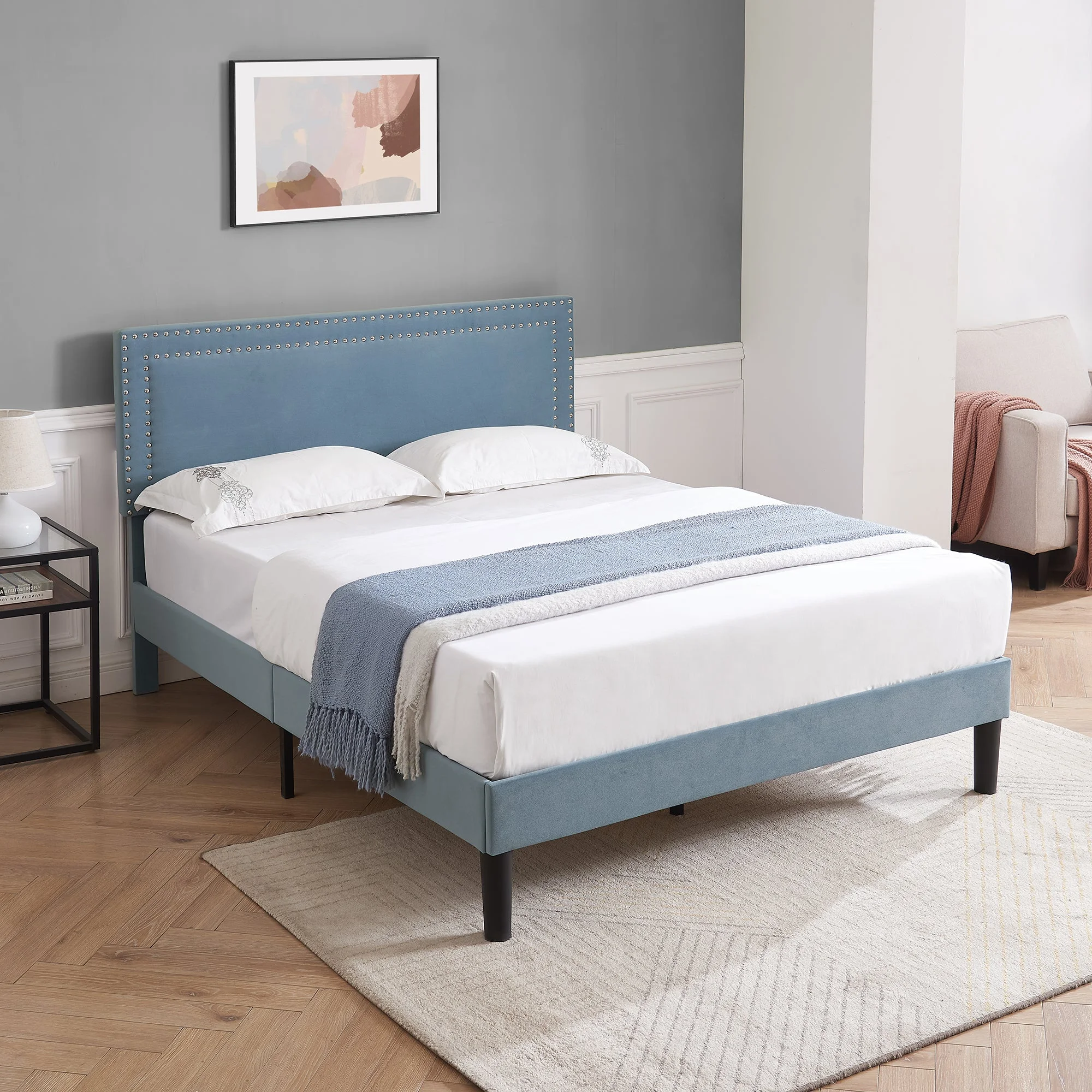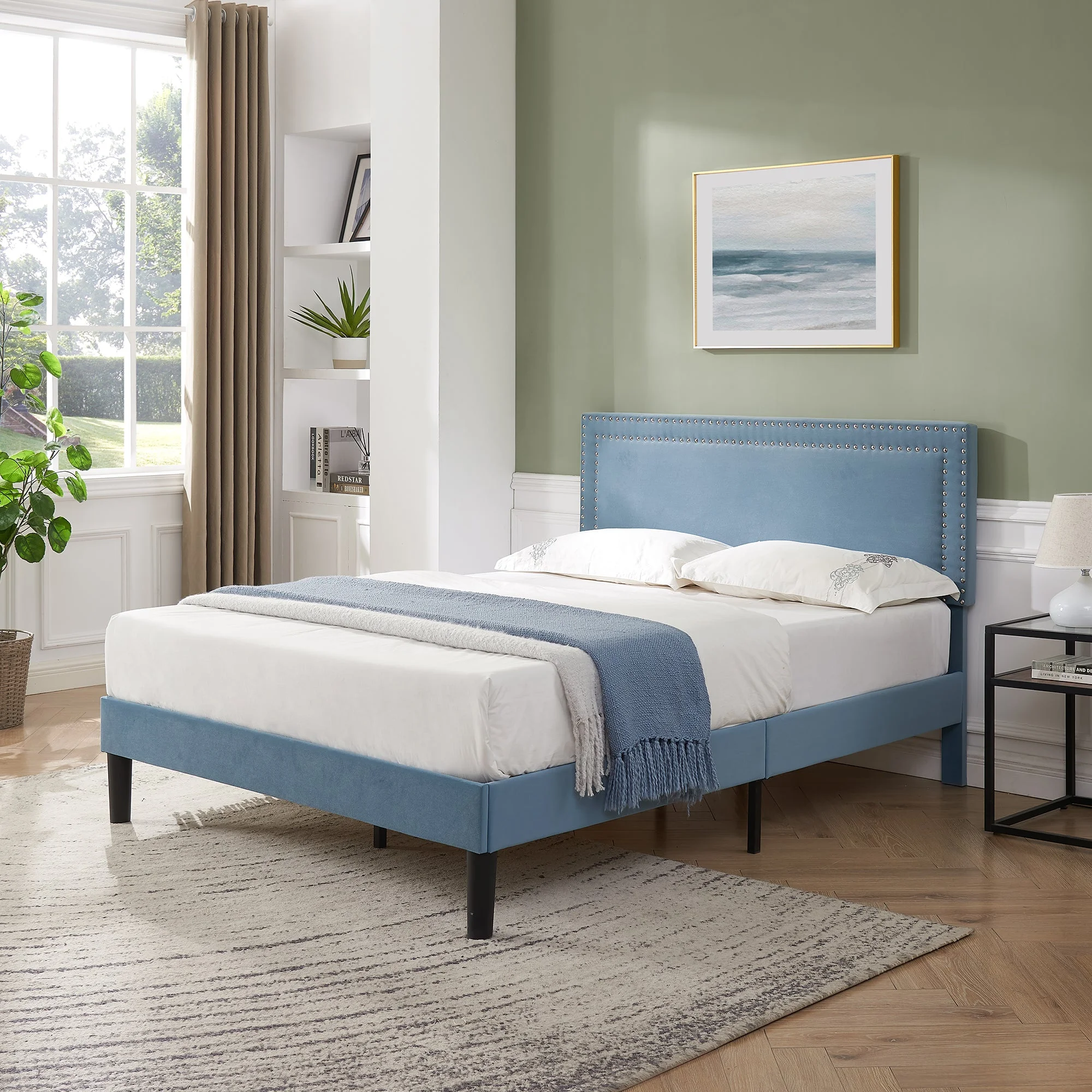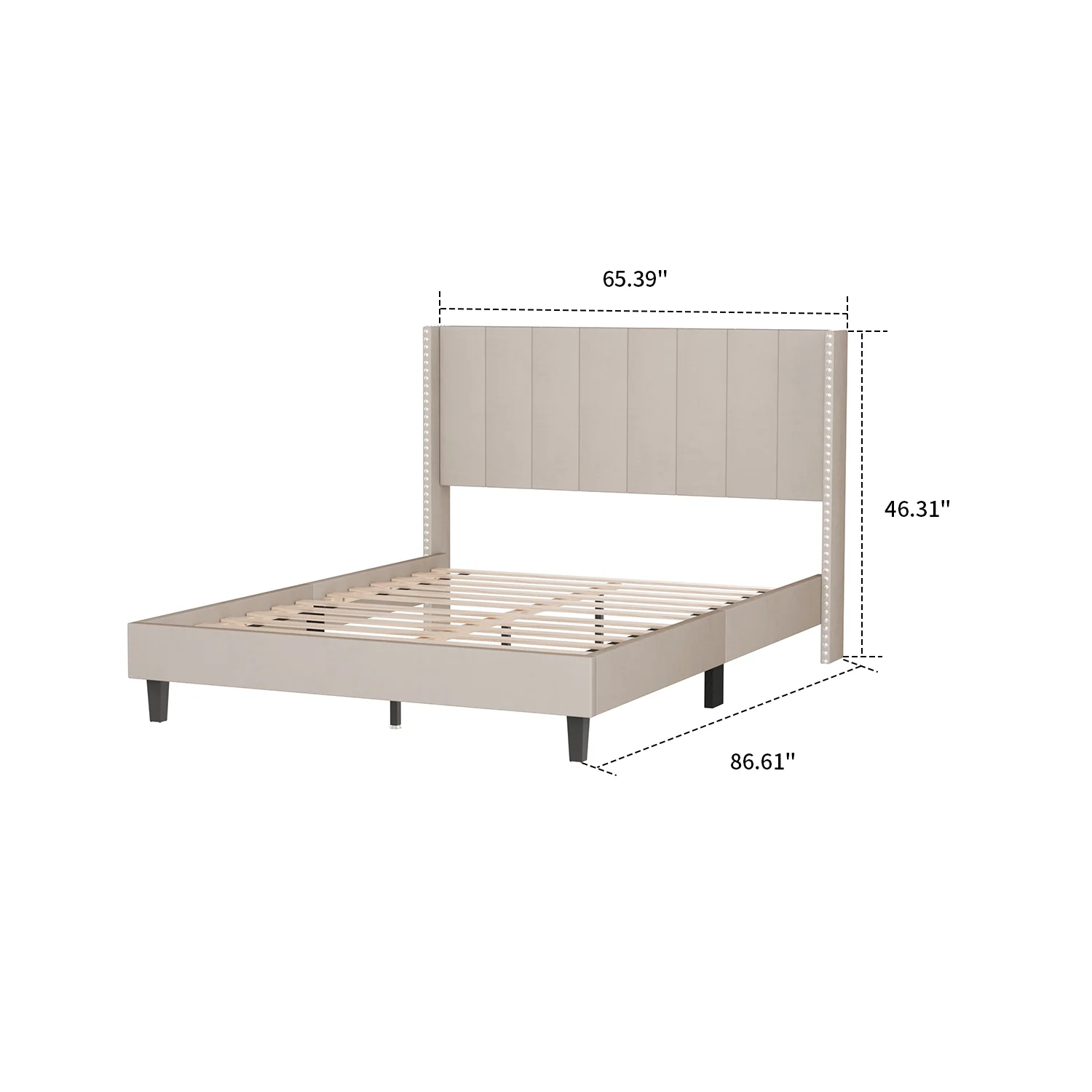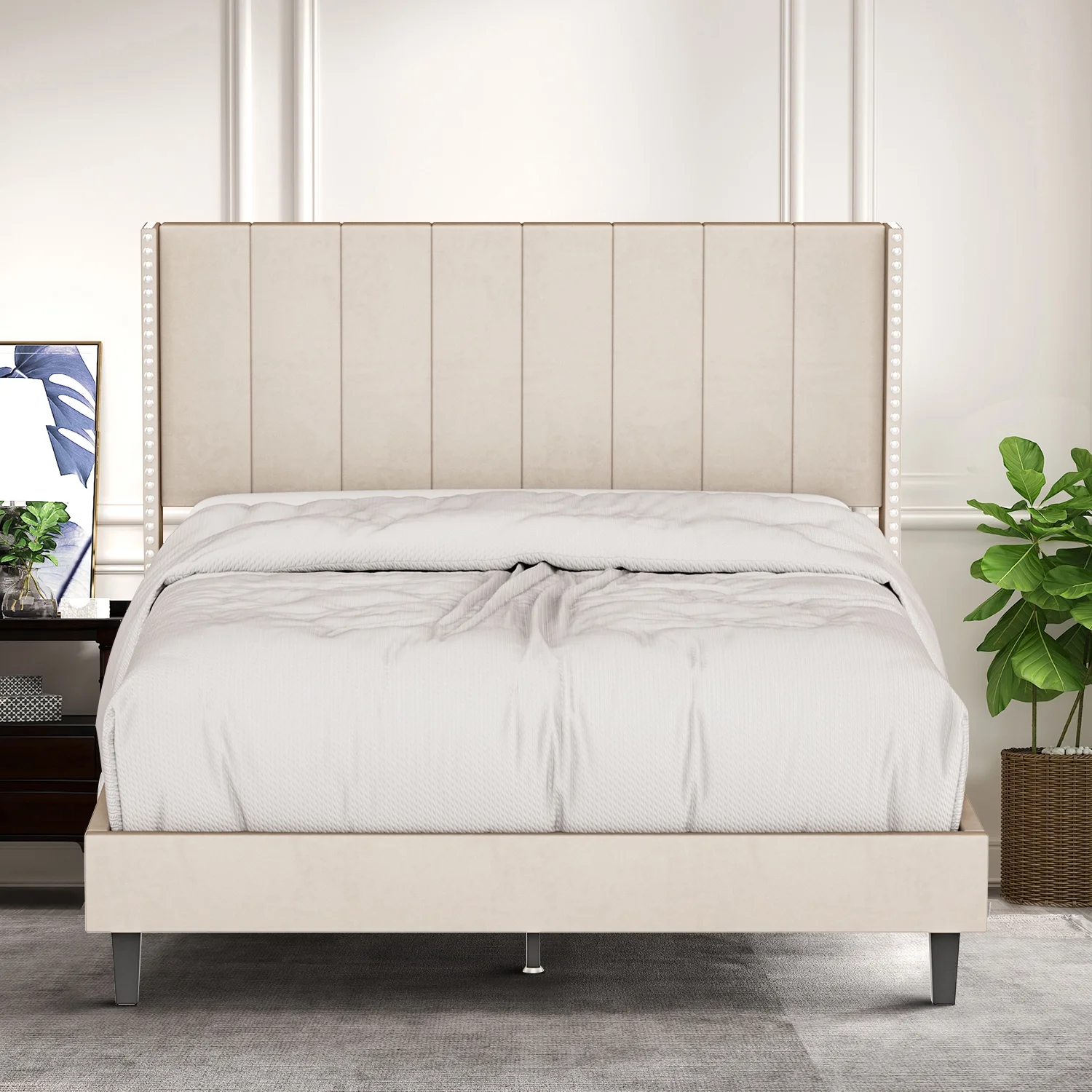 Modern and Elegant Queen-sized Velvet Fabric Upholstered Platform Bed with Nailhead Trim and Wooden Frame, Beige