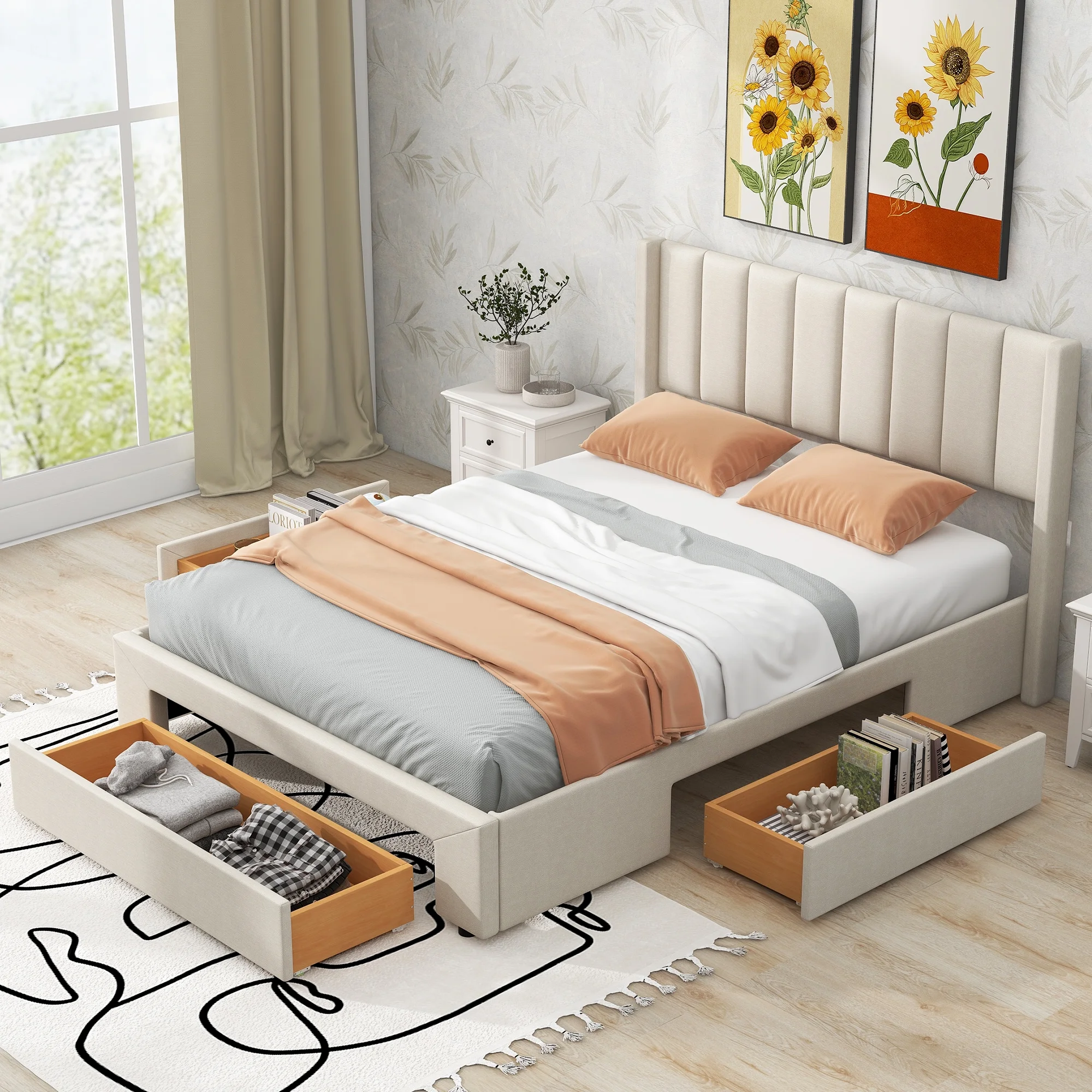 Euroco Upholstered Queen Size Platform Bed with 3 Storage Drawers for Bedroom, Moveable 3 Drawers for Use, Beige