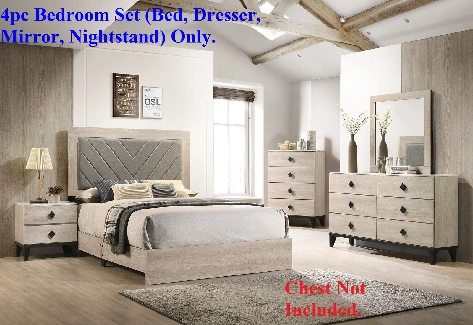 Transitional Style Cream California King Size Bed 4pc Set Dresser Mirror Nightstand Bedroom Furniture Wooden Upholstered HB