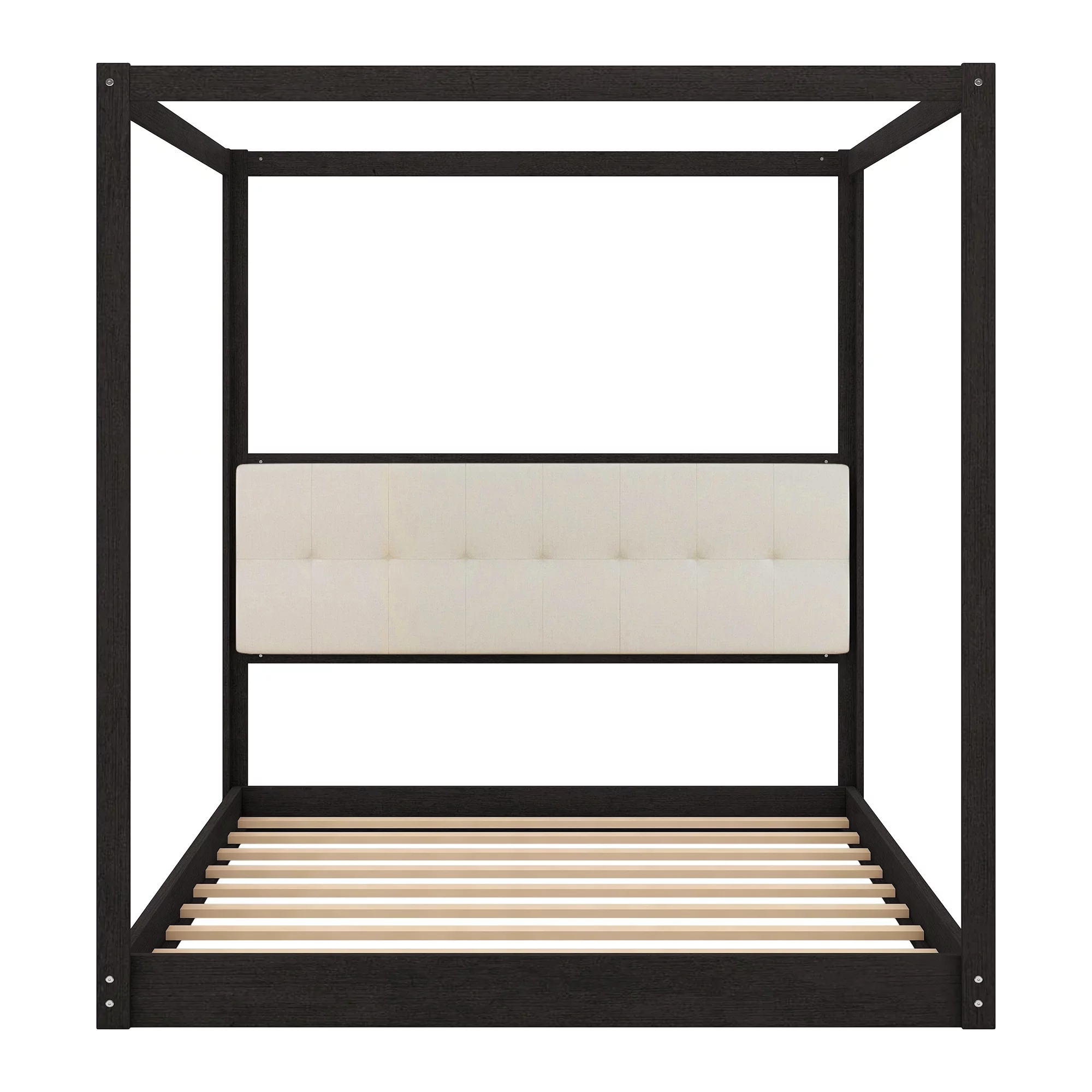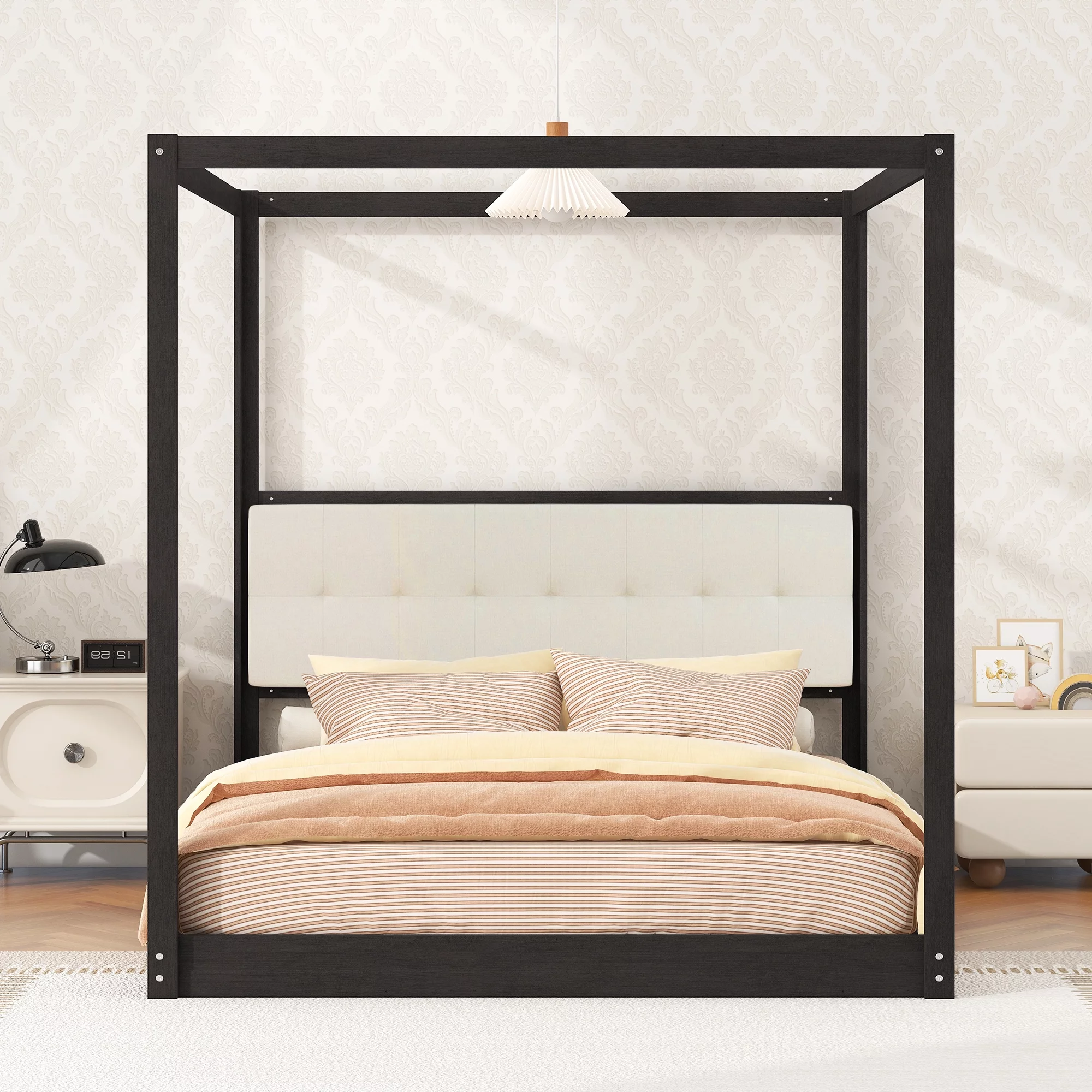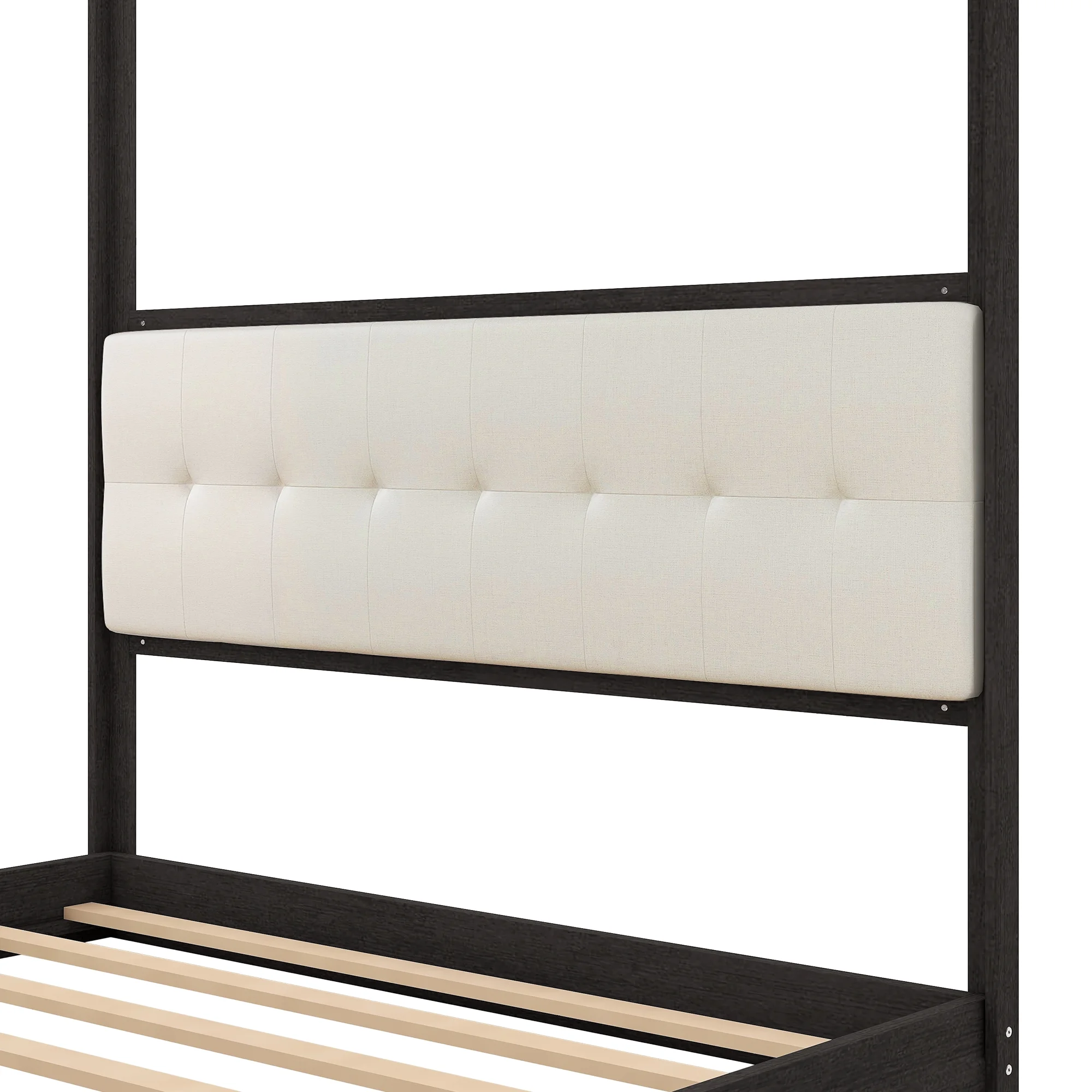 Dawn Whisper King Size Wooden Canopy Platform Bed with Upholstered Headboard, Espresso