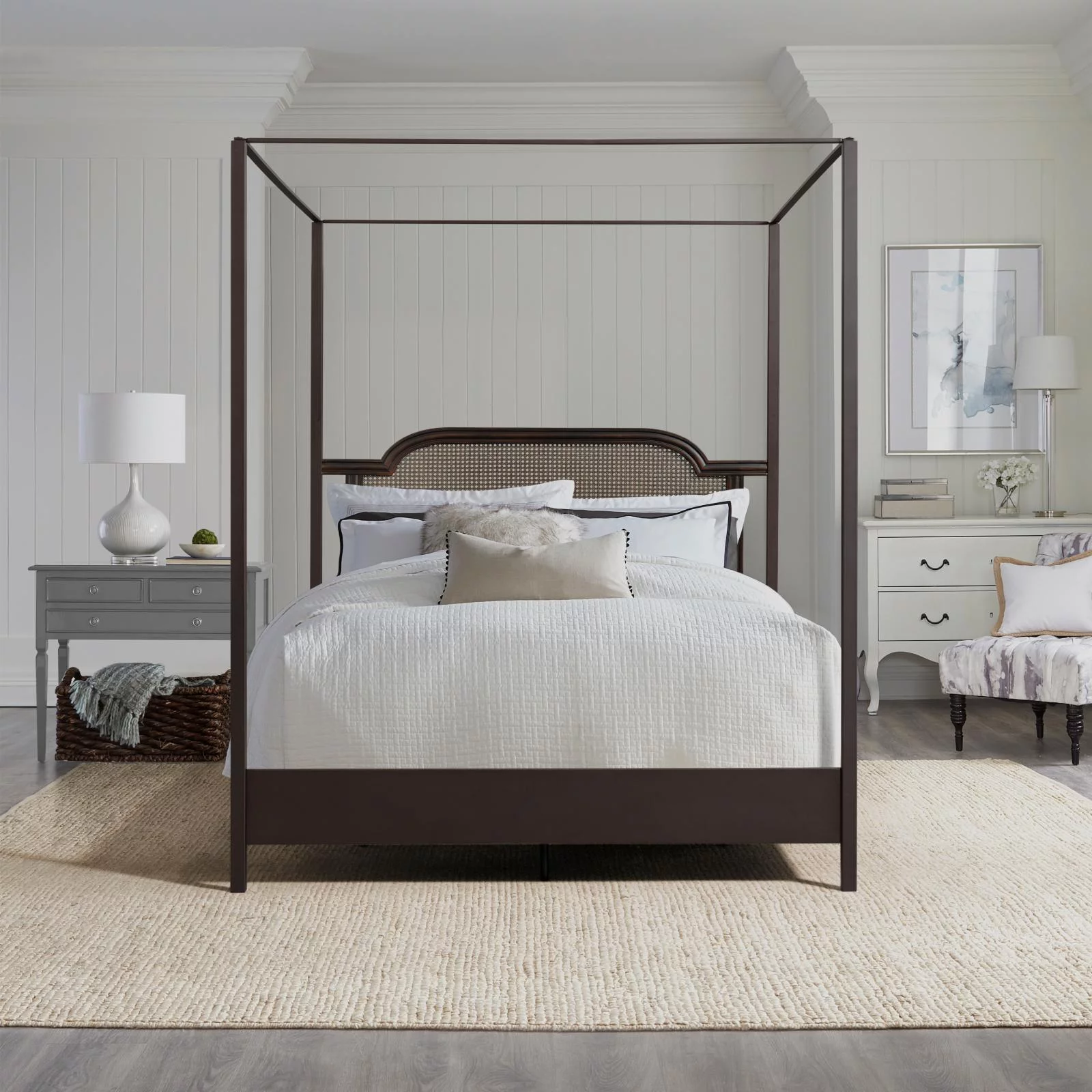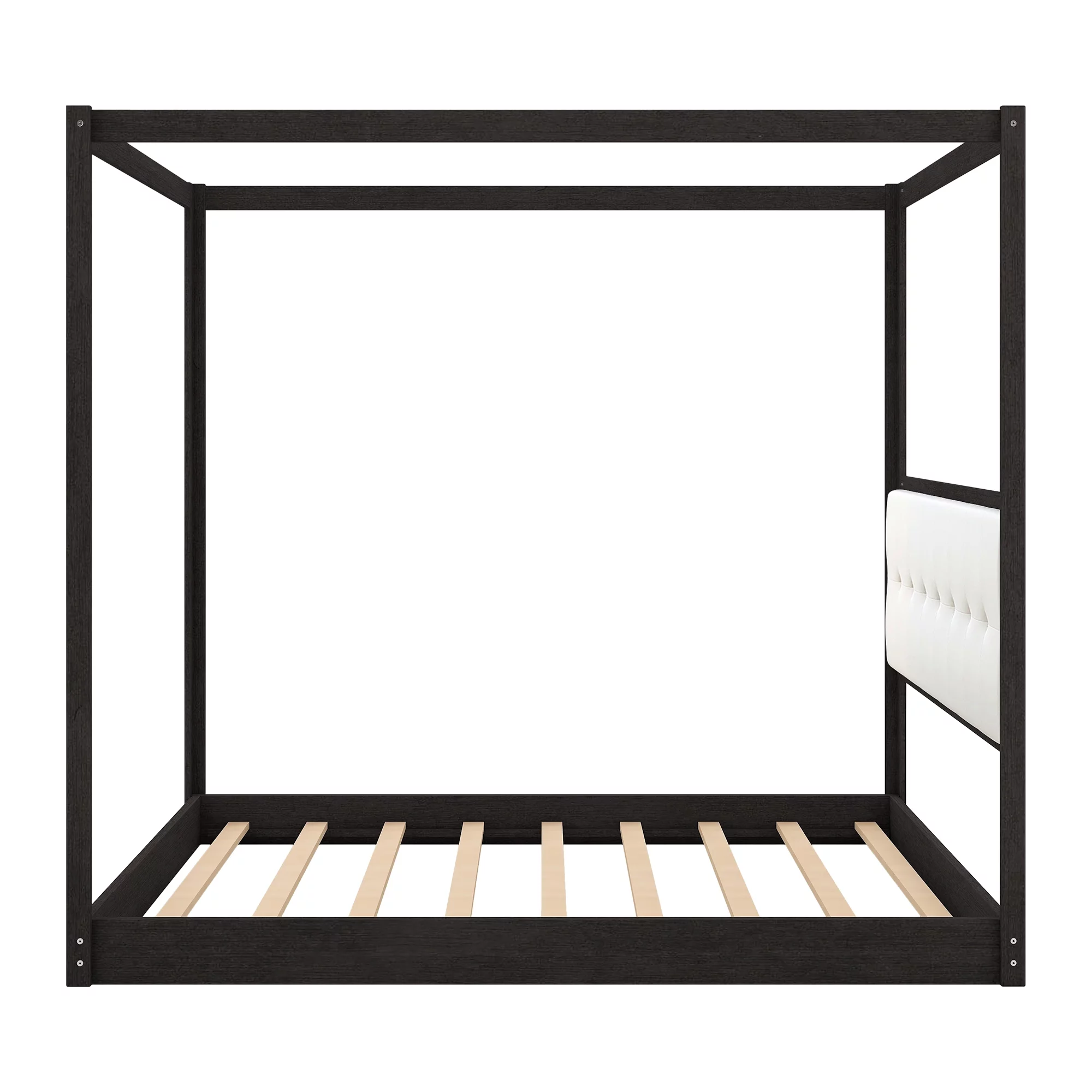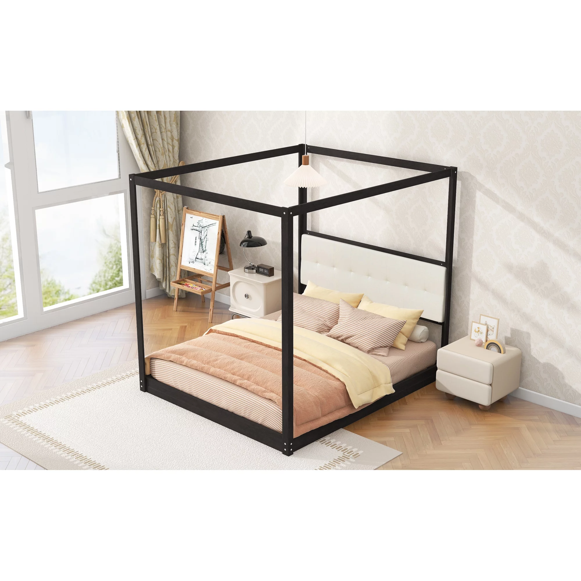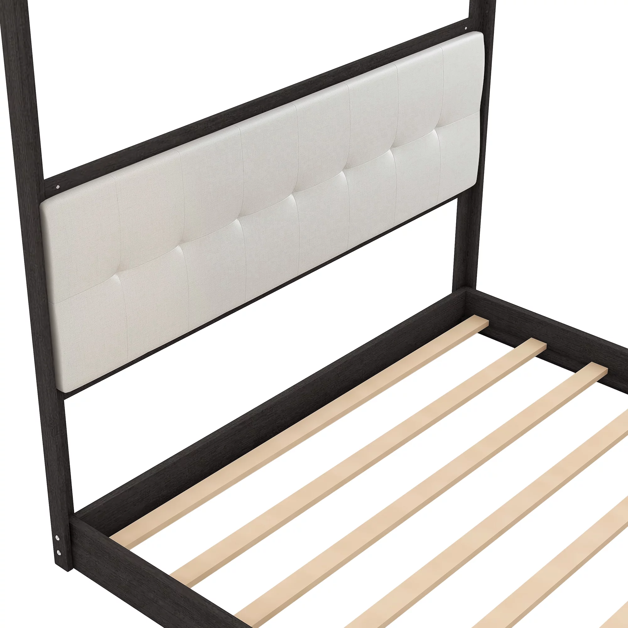 Dawn Whisper King Size Wooden Canopy Platform Bed with Upholstered Headboard, Espresso
