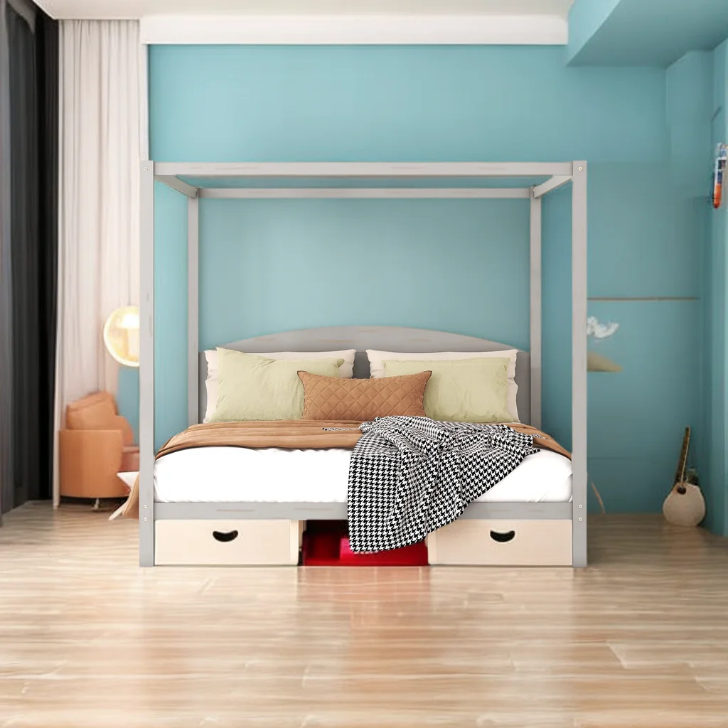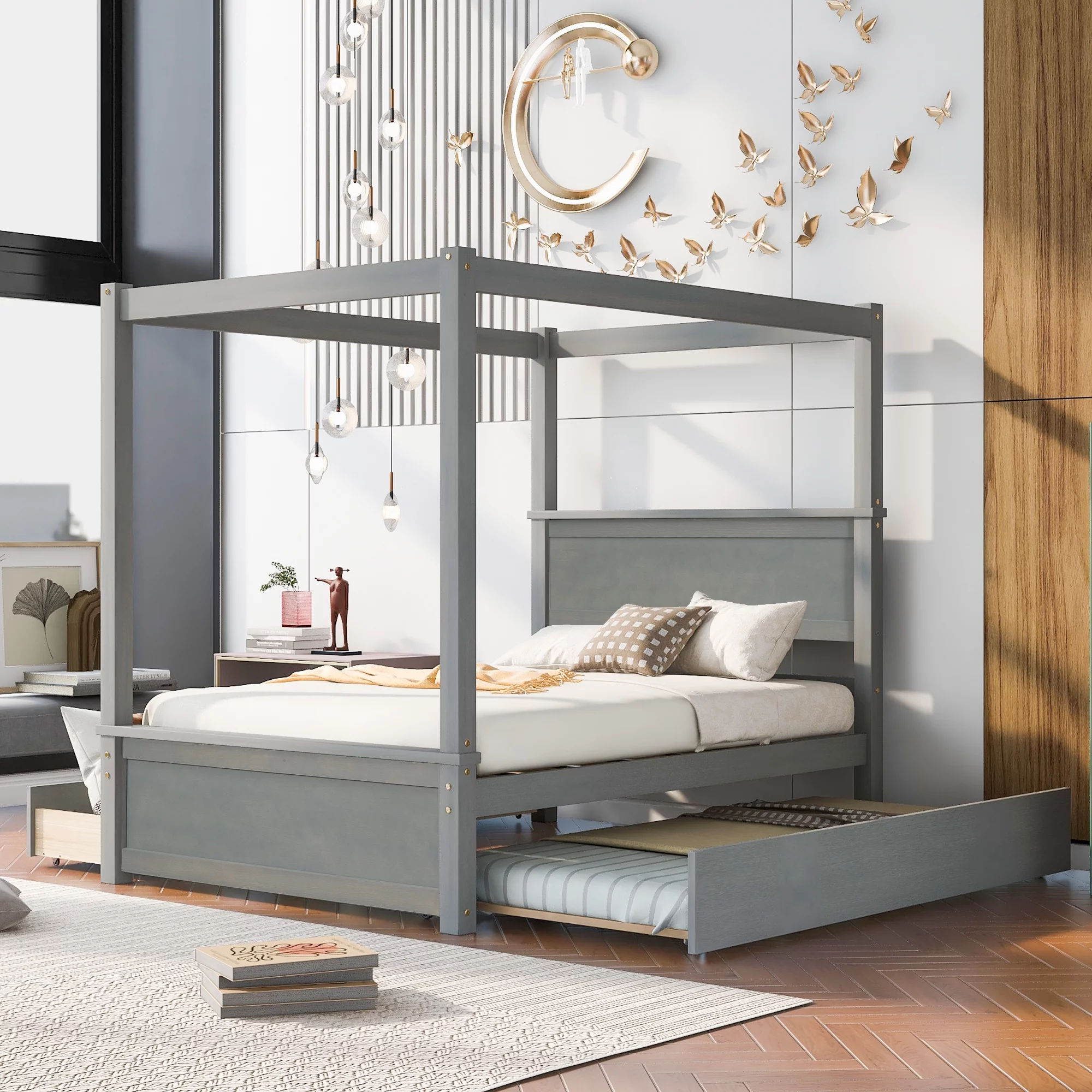 Nestfair Gray Full Size Wood Canopy Platform Bed with 2 Drawers and Trundle