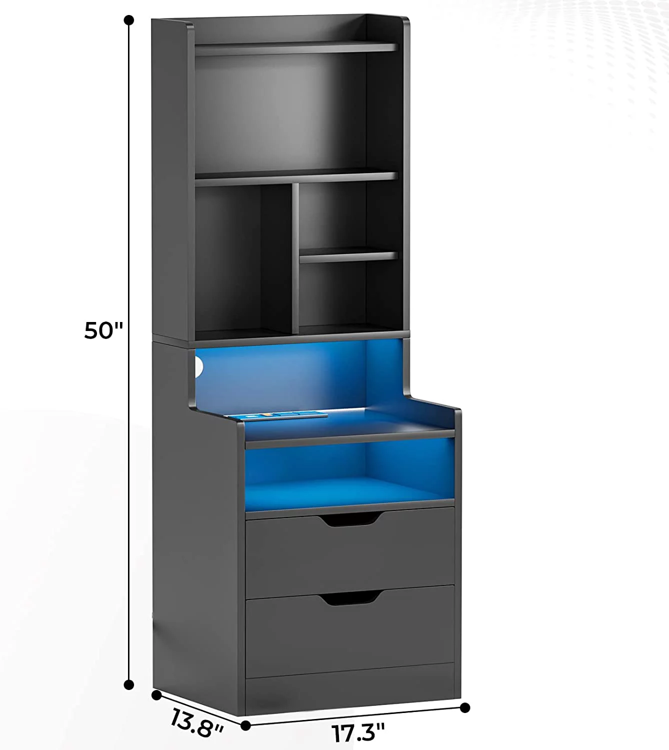 Tall Nightstand with Charging Station and LED Lights, Black Night Stand with Bookshelf, Bedside Table for Bedroom