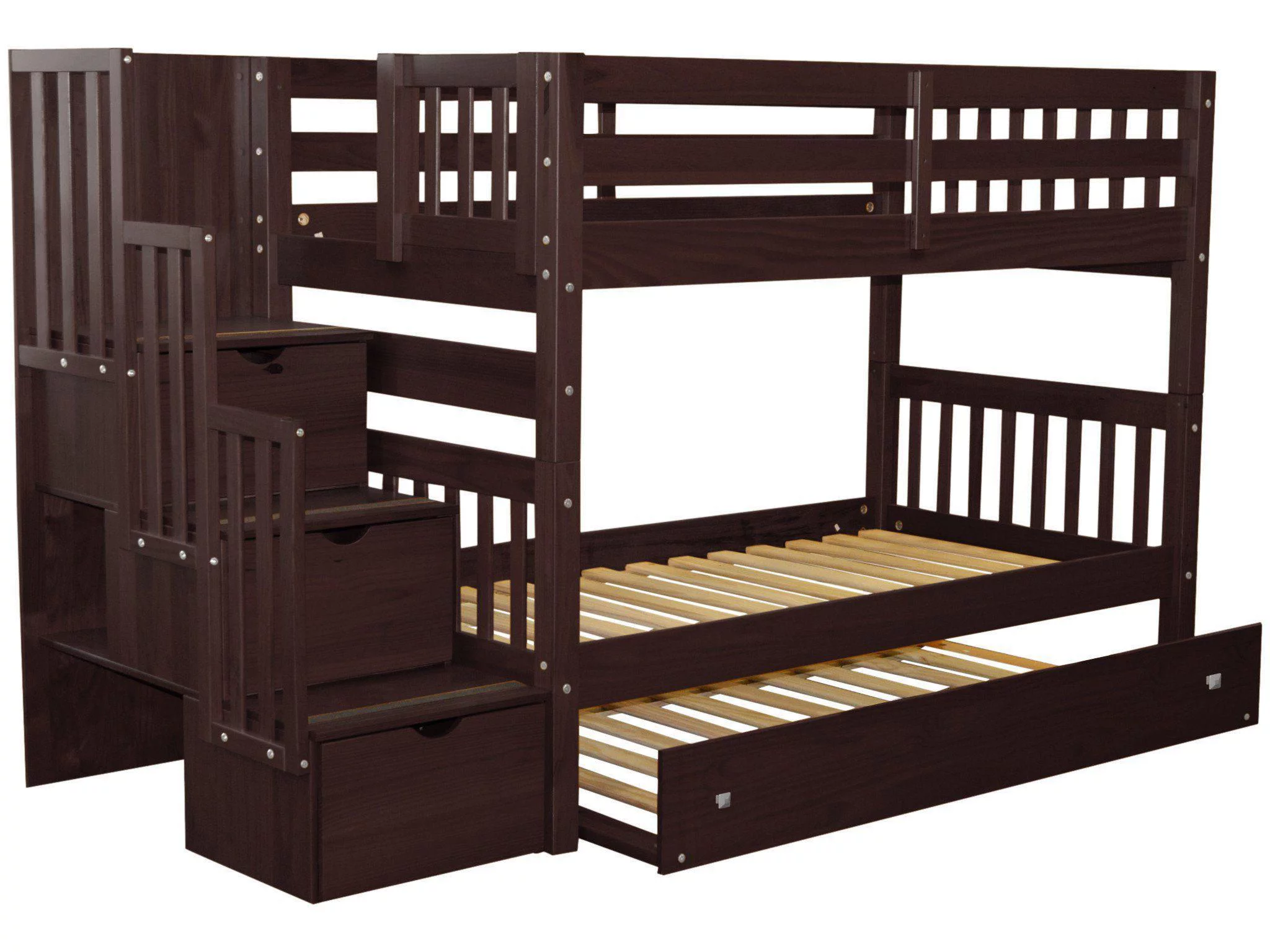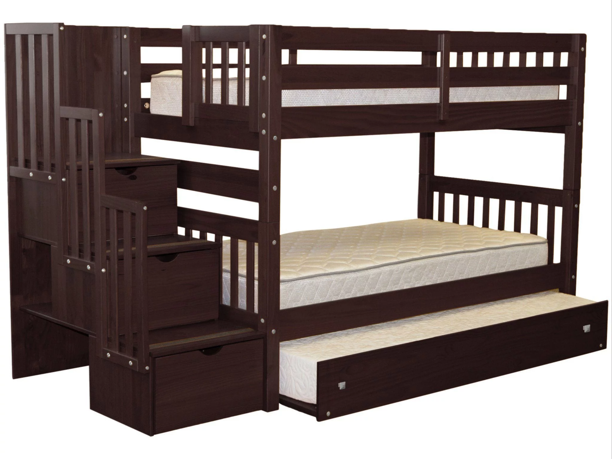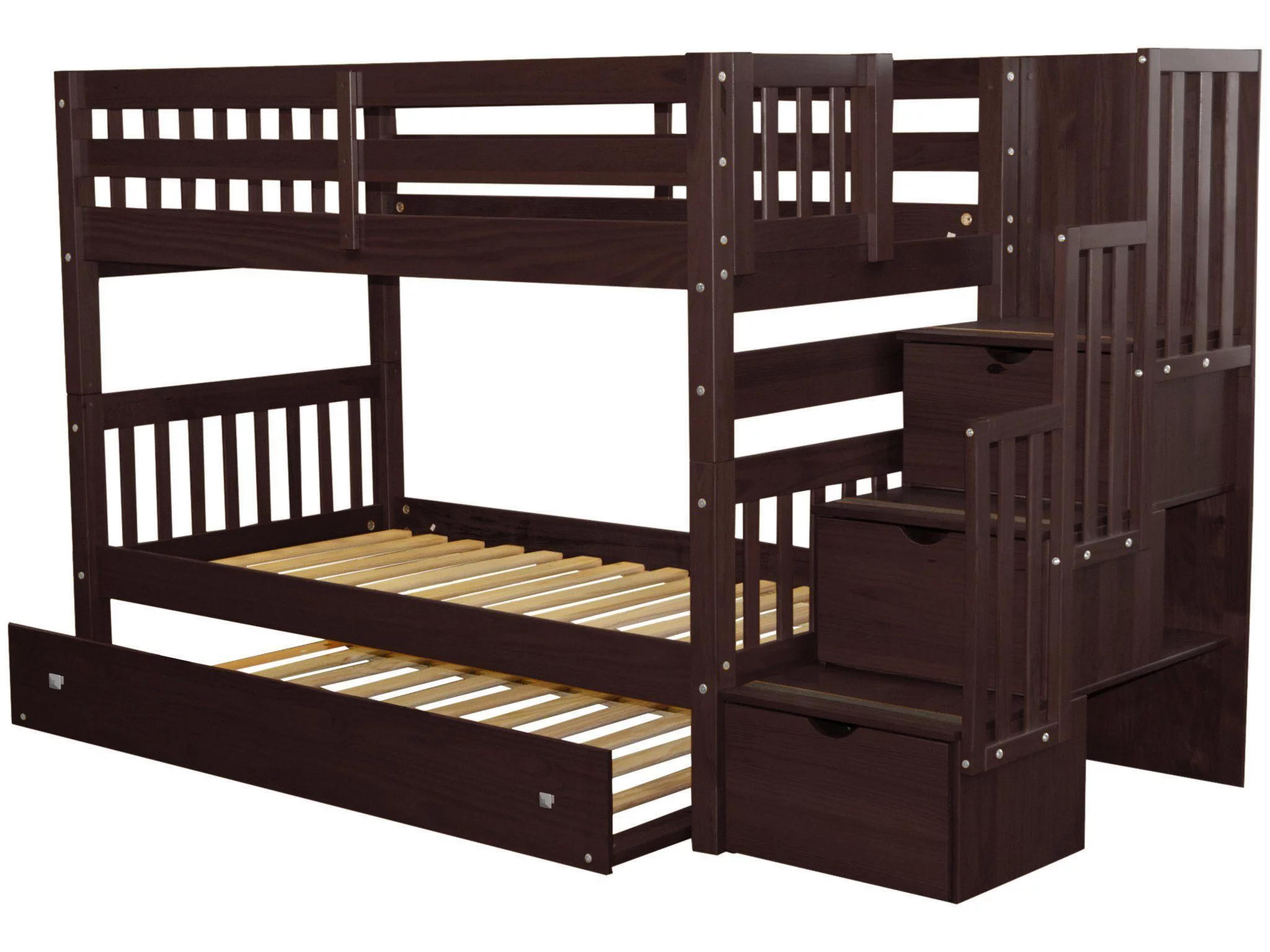 Bedz King Stairway Bunk Beds Twin over Twin with 3 Drawers in the Steps and a Twin Trundle, Dark Cherry